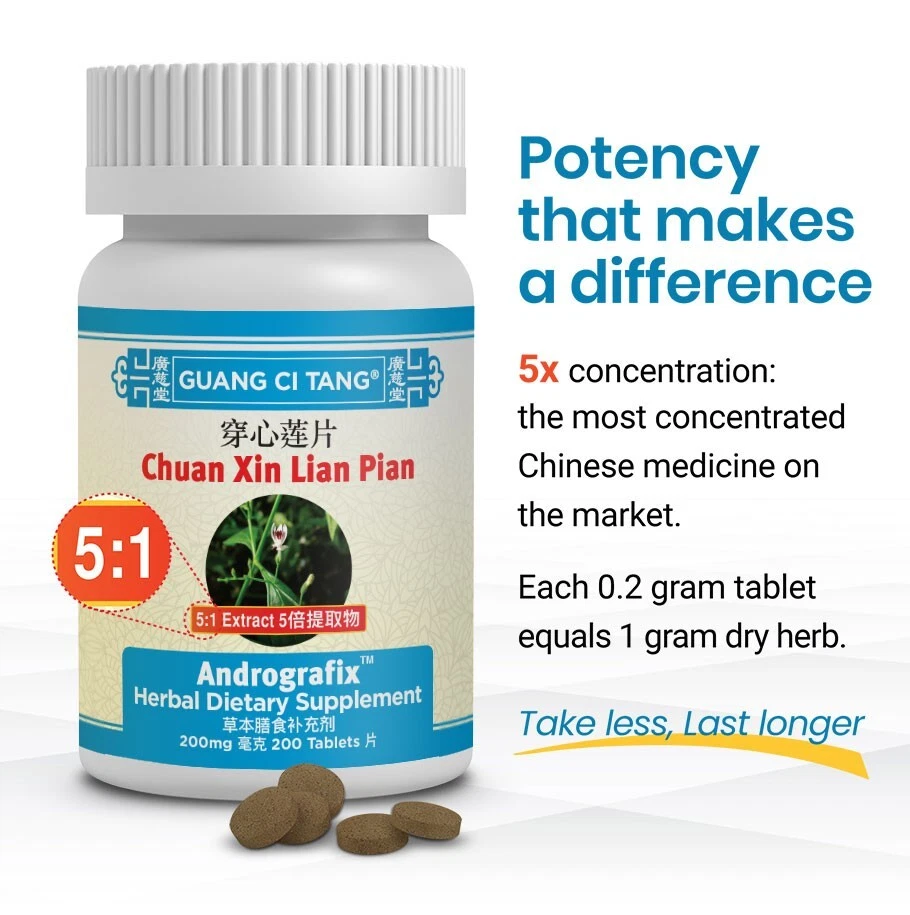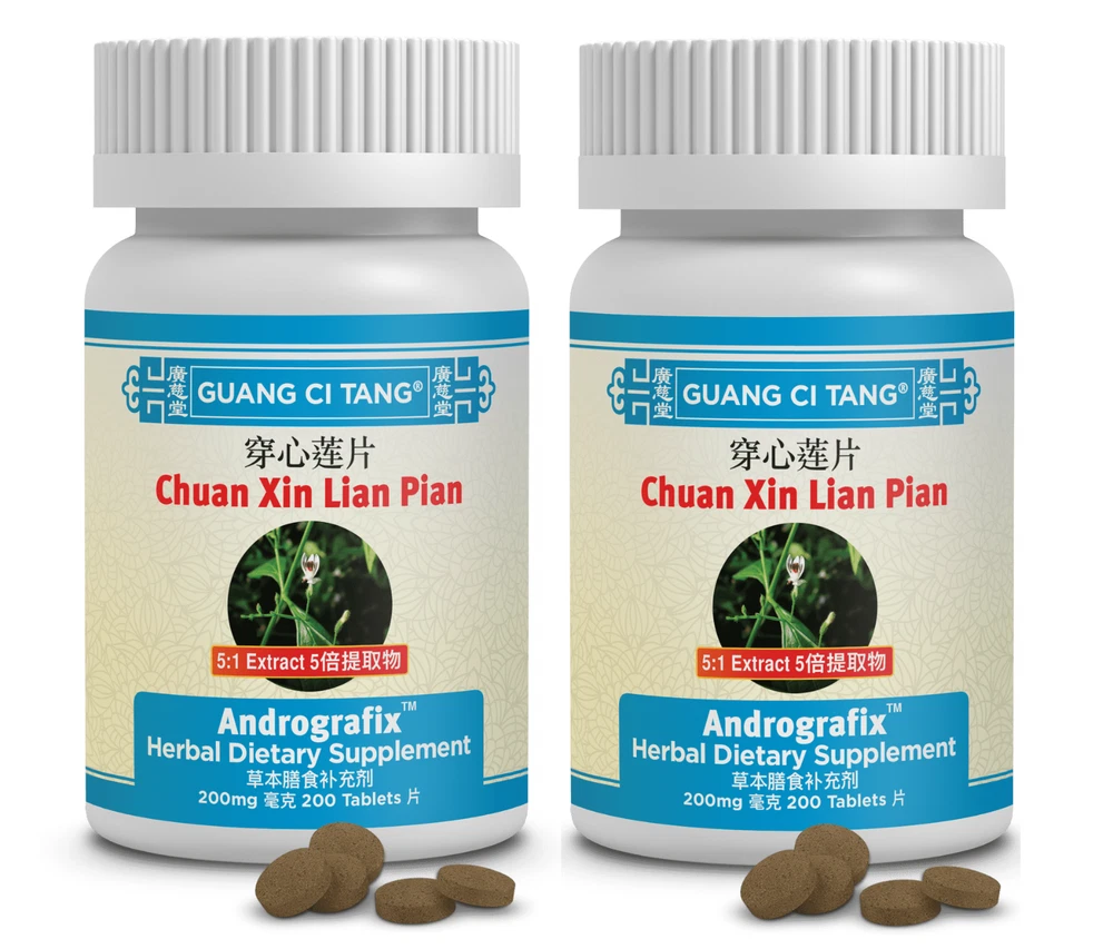 Guang Ci Tang, Chuan Xin Lian Pian, Andrografix, 200 mg, 200 ct Chuan Xin Lian Pian (Chuan Xin Lian Wan, Andrografix™, formerly Chuan Xin Lian Kang Yan Pian, Chuan Xin Lian Kang Yan Wan, or InflamClear™, 穿心莲片 ) is an all natural Chinese herbal supplement that supports the body's immune function. † It clears heat and resolves toxicity after Wind and Heat attacks in TCM. †