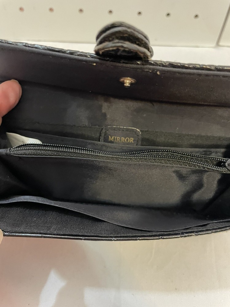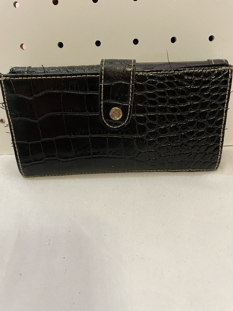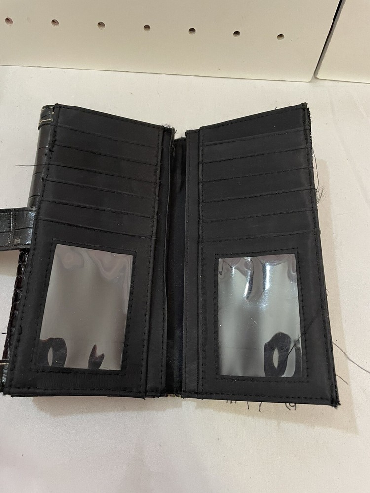 This Guang Tong women's wallet is made of faux leather with a stylish animal print pattern. It features studded accents and a wristlet style design. The wallet is black in color and measures 6 1/2 inches wide by 3 inches long. It has credit card and checkbook compartments, as well as a mirror for convenience. The wallet is pre-owned and has been well-maintained. It is a great accessory for any woman looking for a unique and functional wallet. Great condition- Smoke free home- Thanks for stopping in check out my online thrift stuff added daily much love Shelly J 💚