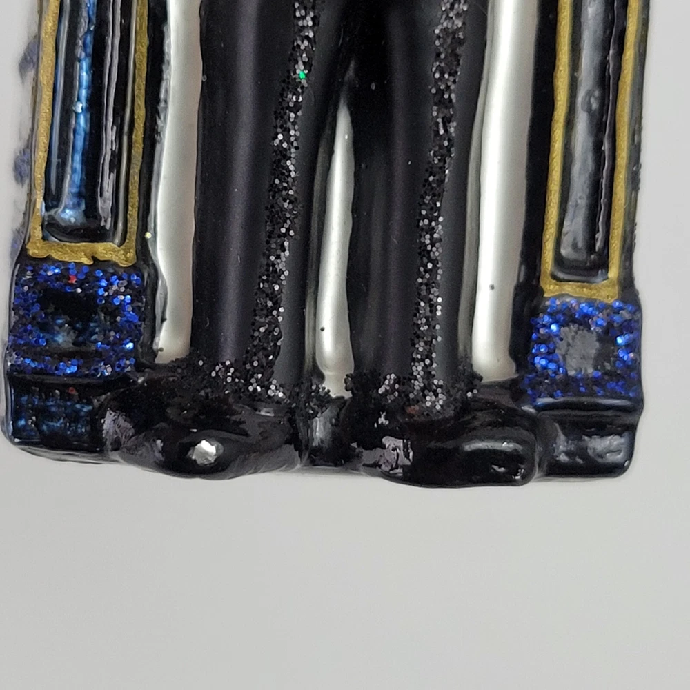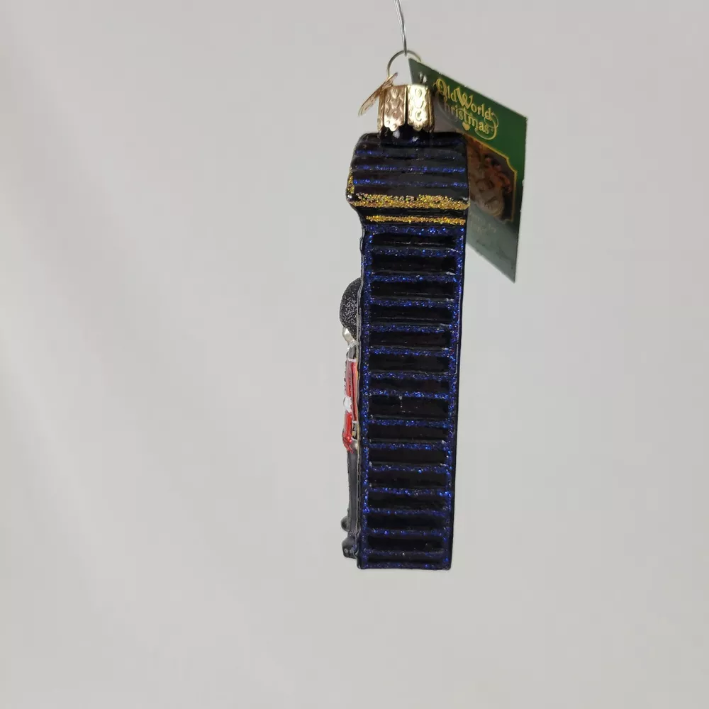 This Ornament measures 4.25" tall, 1.5" wide, and 1" deep. It has the tags, but there are a few tiny spots where the silver is showing through. See pictures for details.