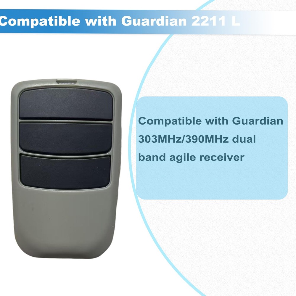 Guardian 2212 L Garage Door Remote Transmitter,303mhz/390mhz Purchase Note: We are a replacement remote control is not the original, please check whether it is compatible with your remote control model before purchase. Compatibility : compatible with Guardian 303MHz, 390MHz dual band agile receiver, this standard 3 button gives you the option to control up to 3 garage door openers Programming:Our 2211 L garage door remote is compatible with Guardian 2211 L 3 button garage door remote transmitter, operating at 303MHz/390MHz, with clear instructions and easy programming; Before starting remote programming, make sure the garage door opener is fully closed Safe and Reliable: our garage door remote is carefully designed and tested for lowest power consumption to ensure long lasting battery life (battery included), powerful RF technology and security encryption design ensures a usage range of up to about 148 ft, rolling code technology can reduce radio interference, encryption to avoid intrusion, and stable working effect provide security for your garage property Package and Service: you will receive 3 door remote compatible with Guardian 2211 L 3 button garage door remote transmitter, including instructions and visor clip for visor or wall mounting, key ring and leather sets to meet your usage needs and operate them well.Any problem You can contact us, we will return it within 90 days.