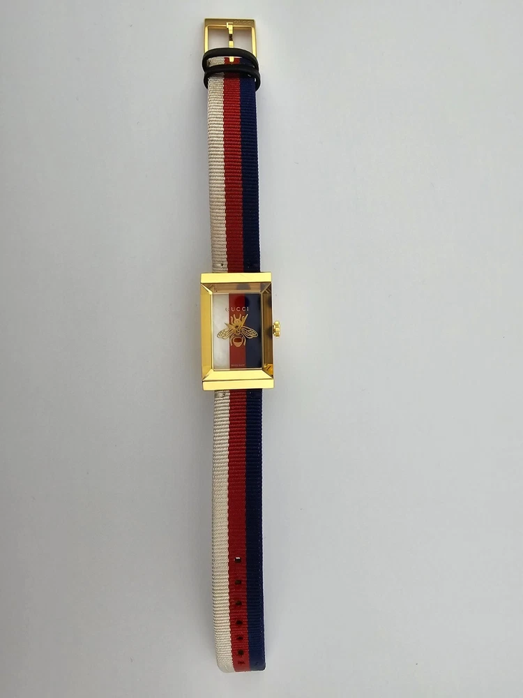 Gucci Women's G-Frame Mother of Pearl Dial Nylon Watch - ($1150 MSRP) With Original Box! This watch is a Shelf Pull from one of the Major Department Stores. Watch has micro scratches on the watch case/band, visible under direct light. Established in 1921 by Guccio Gucci, the Italian fashion brand Gucci not only offers luxury bags, clothes, footwear, accessories, perfume, and beauty products but also provides some of the world’s finest watches. Offering exquisite Italian craftsmanship fused with Swiss technology — from delicate dress watches for women to robust dive watches for men, Gucci earns the trust not only of fashion aficionados but also serious watch enthusiasts. Features Yellow gold PVD stainless steel case with a nylon strap. Fixed bezel. Mother of pearl dial with gold-tone hands. Dial Type: Analog. Quartz movement. Pull / push crown. Solid case back. Rectangle case shape. Case size: 21 mm x 34 mm. Buckle clasp. Water resistant at 50 meters / 165 feet. Functions: hour, minute. Dress watch style. Watch label: Swiss Made. Fast and Free Shipping You're already purchasing the item. Why pay additional for shipping, especially slow shipping? We get your order shipped out within 1-business day and delivered to your doorstep as quickly as possible. Competitive Pricing With our dynamic pricing model, our prices are always competitive. Our prices are some of the lowest that you will find on the internet. Rest assured that you're getting a good deal when purchasing with us. 30-day Money Back Guarantee We are committed to making sure that you leave this transaction satisfied. If you're unhappy with the product for any reason, you may return it back for your money-back or a replacement within 30 days. No questions asked!