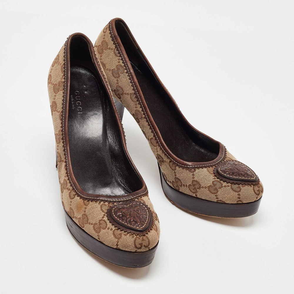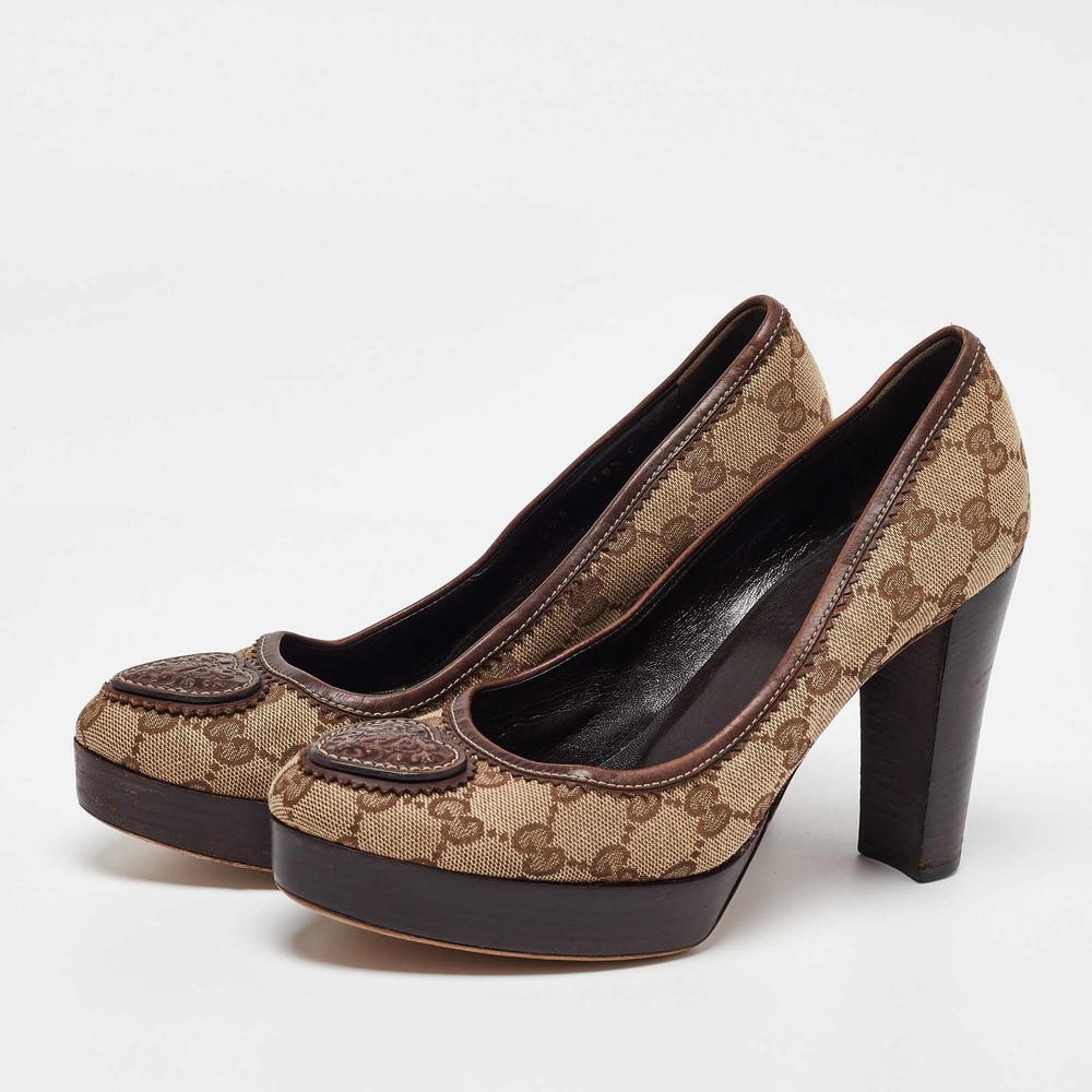 Make a chic style statement with these designer pumps. They showcase sturdy heels and durable soles, perfect for your fashionable outingsCertified by The Luxury Closet - This item has gone through a detailed authentication process overseen by our experts. We offer a lifetime guarantee of authenticity on all our items. Import duties, taxes and charges are not included in the item price. These charges are the buyers responsibility. Please check with your country’s customs office to determine what these additional cost will be prior to buying. Our eBay Store About Us Contact Us Add to Favorite Sellers Gucci Beige/Brown GG Canvas and Leather Platform Pumps Size 38.5 $165 Make a chic style statement with these designer pumps. They showcase sturdy heels and durable soles, perfect for your fashionable outings Product Details Brand Color Beige Dimensions Material Canvas, Leather Size 38.5 Outsole Width 7 cm Outsole Length 24 cm Heel Height 10.5 cm Includes The Luxury Closet Packaging Certified by The Luxury Closet This item has gone through a detailed authentication process overseen by our experts. We offer a lifetime guarantee of authenticity on all our items. How We Check The in-house team of experts at The Luxury Closet is highly trained to verify the authenticity and the condition of the luxury products. They ensure that only 100% authentic items are put on sale.The evaluation process is unique with its own mix of assessment criteria and differs according to the category. Each item is evaluated based on the following combination of hallmarks, hardware, stitching, symmetry, material, craftsmanship, stamping, codes, hologram stickers, and packaging. Our authenticators also check if the items have been modified or amended (e.g., aftermarket diamonds, replaced batteries, repaired bags, etc.) International Buyers Import duties, taxes and charges are not included in the item price. These charges are the buyers responsibility. Please check with your country’s customs office to determine what these additional cost will be prior to buying.