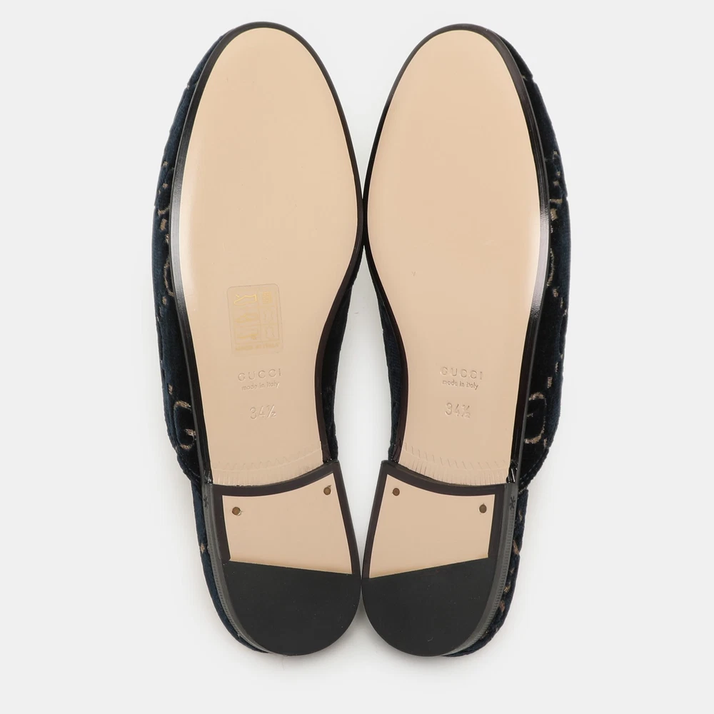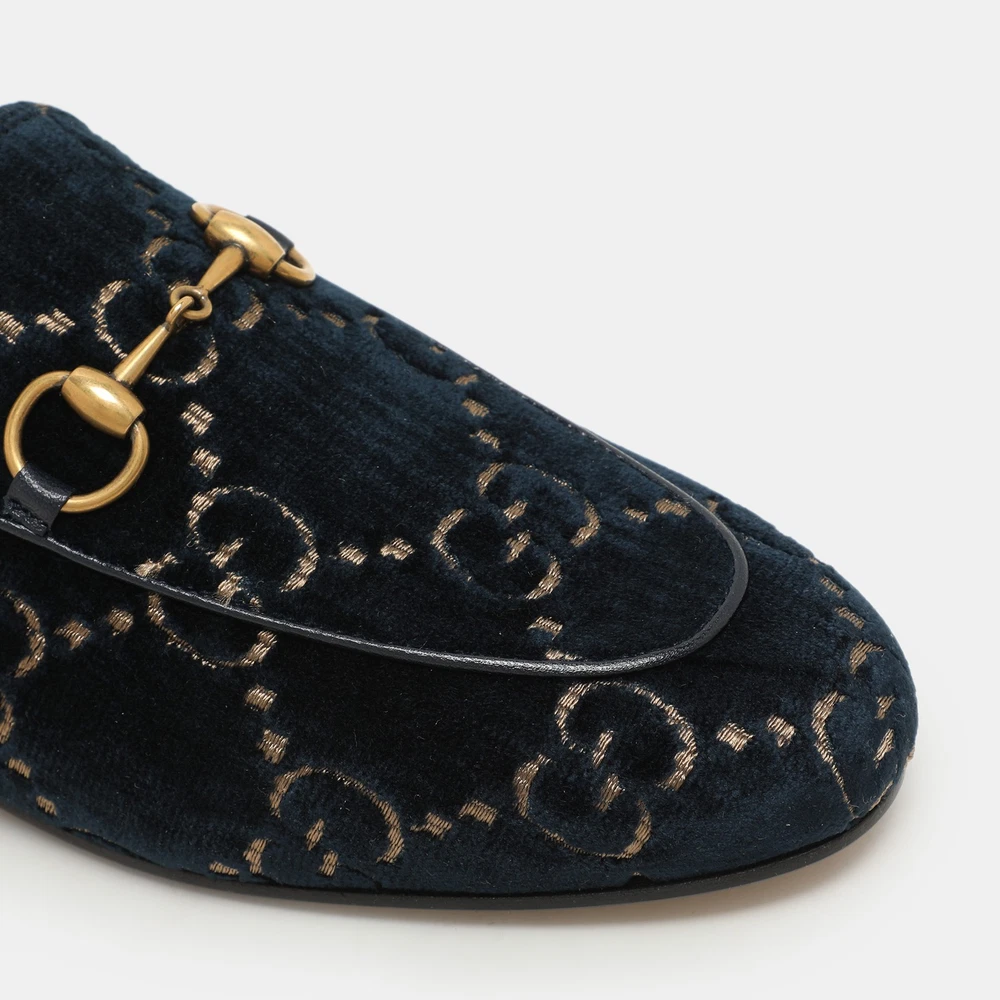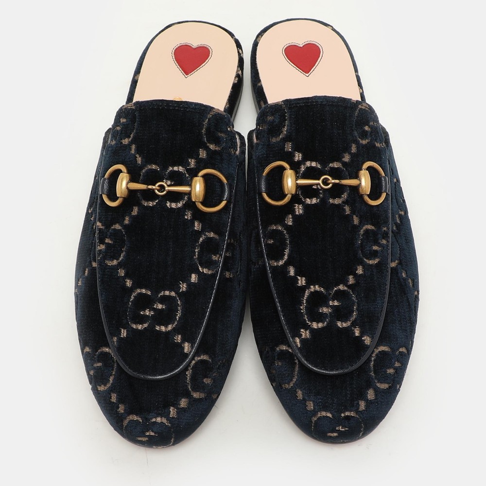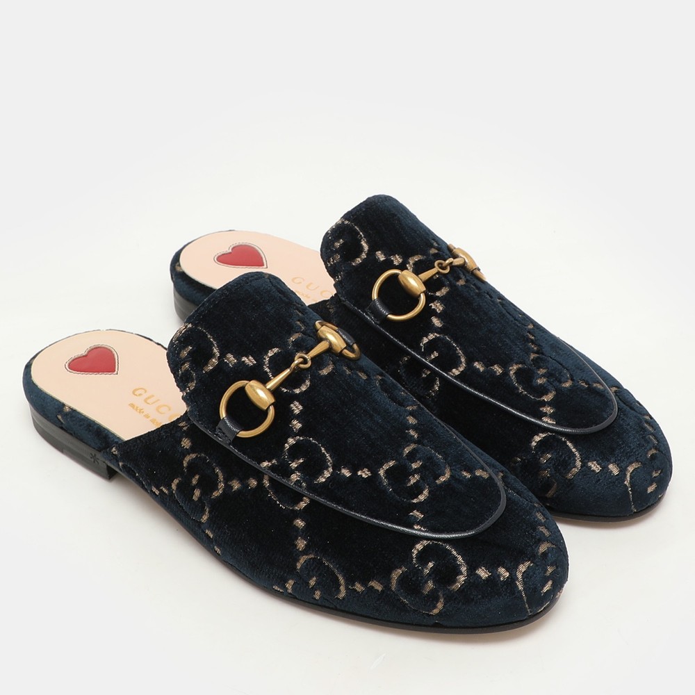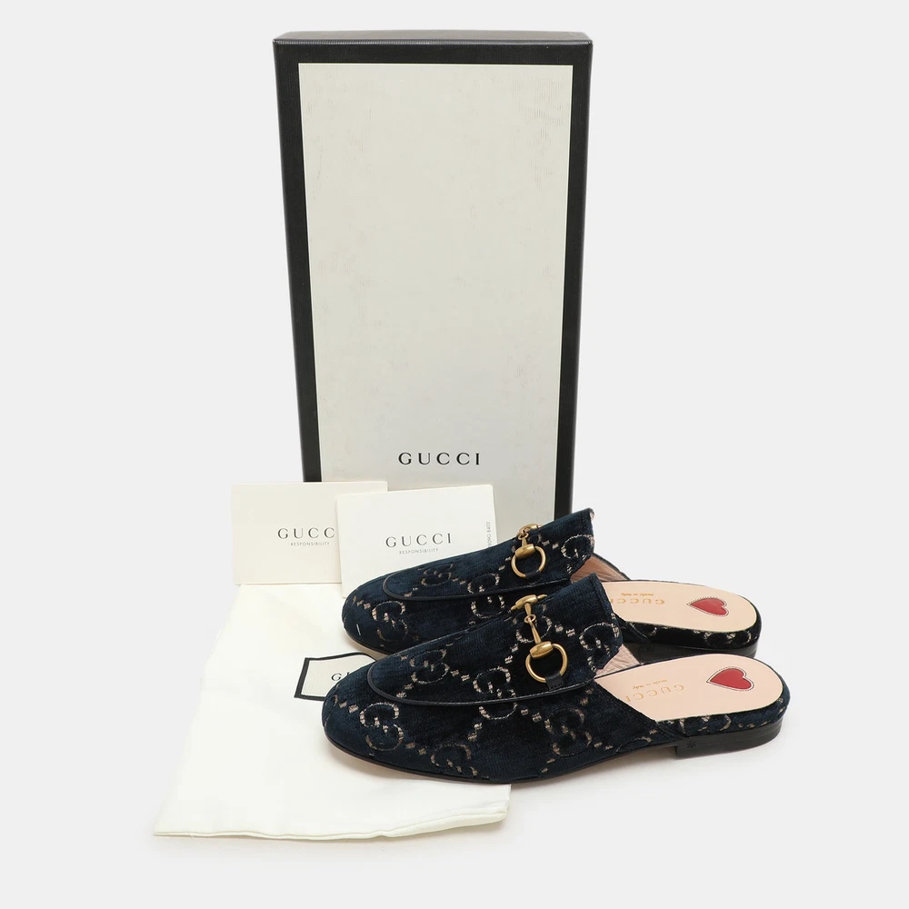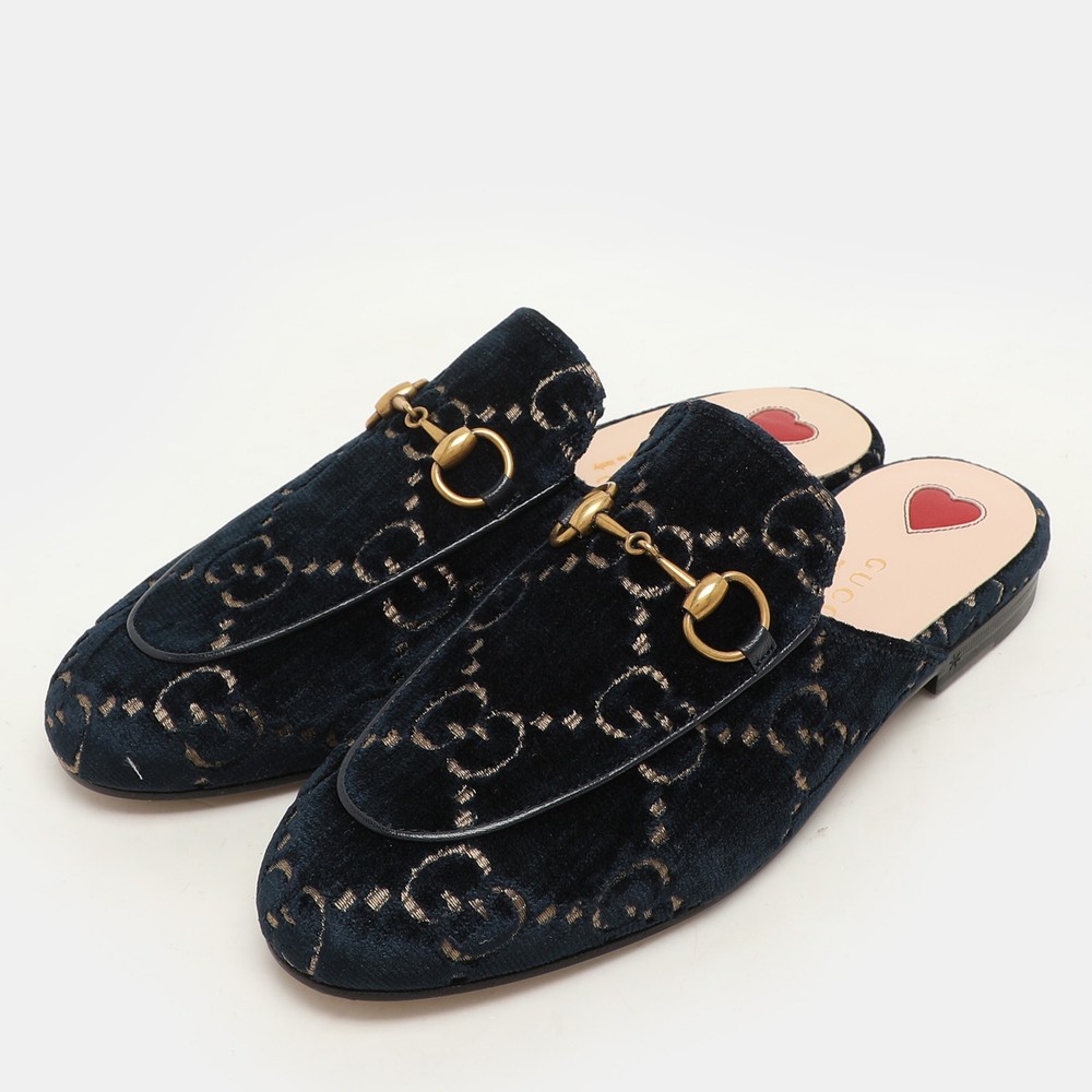 These Gucci Princetown mules signify luxury and practicality. An ultimate favourite of style enthusiasts, its silhouette gets a luxe update with the Horsebit motif on the uppers, and its charm is enhanced with gold tone accents. It comes made from velvet and features a slip on fitting.Certified by The Luxury Closet - This item has gone through a detailed authentication process overseen by our experts. We offer a lifetime guarantee of authenticity on all our items. Import duties, taxes and charges are not included in the item price. These charges are the buyers responsibility. Please check with your country’s customs office to determine what these additional cost will be prior to buying. Our eBay Store About Us Contact Us Add to Favorite Sellers Gucci Blue/Gold GG Velvet Princetown Horsebit Flat Mules Size 34.5 $643.5 These Gucci Princetown mules signify luxury and practicality. An ultimate favourite of style enthusiasts, its silhouette gets a luxe update with the Horsebit motif on the uppers, and its charm is enhanced with gold tone accents. It comes made from velvet and features a slip on fitting. Product Details Brand Color Blue Dimensions Material Velvet Size 34.5 Outsole Width Outsole Length Heel Height Includes Certified by The Luxury Closet This item has gone through a detailed authentication process overseen by our experts. We offer a lifetime guarantee of authenticity on all our items. How We Check The in-house team of experts at The Luxury Closet is highly trained to verify the authenticity and the condition of the luxury products. They ensure that only 100% authentic items are put on sale.The evaluation process is unique with its own mix of assessment criteria and differs according to the category. Each item is evaluated based on the following combination of hallmarks, hardware, stitching, symmetry, material, craftsmanship, stamping, codes, hologram stickers, and packaging. Our authenticators also check if the items have been modified or amended (e.g., aftermarket diamonds, replaced batteries, repaired bags, etc.) International Buyers Import duties, taxes and charges are not included in the item price. These charges are the buyers responsibility. Please check with your country’s customs office to determine what these additional cost will be prior to buying.