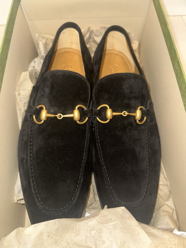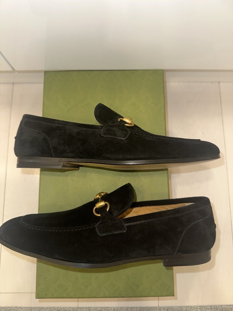 These Gucci Jordaan loafers are absolutely stunning! The black suede is luxurious, and the gold horsebit adds a perfect touch of elegance. They fit true to size (US 9) and feel incredibly comfortable right out of the box. The craftsmanship is top-notch, as expected from Gucci. Getting them brand new at this price is an amazing deal—definitely a must-have for any stylish wardrobe. Comes with the original box, making it even more worth it. Highly recommend!