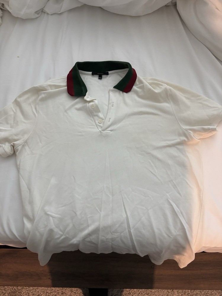The product is a Gucci men's collar polo shirt in men's size XXL and color white. This regular fit polo features short sleeves and is perfect for adding a touch of luxury to any casual outfit. Crafted with high-quality materials and a stylish design, this shirt is a versatile and fashionable addition to any wardrobe.