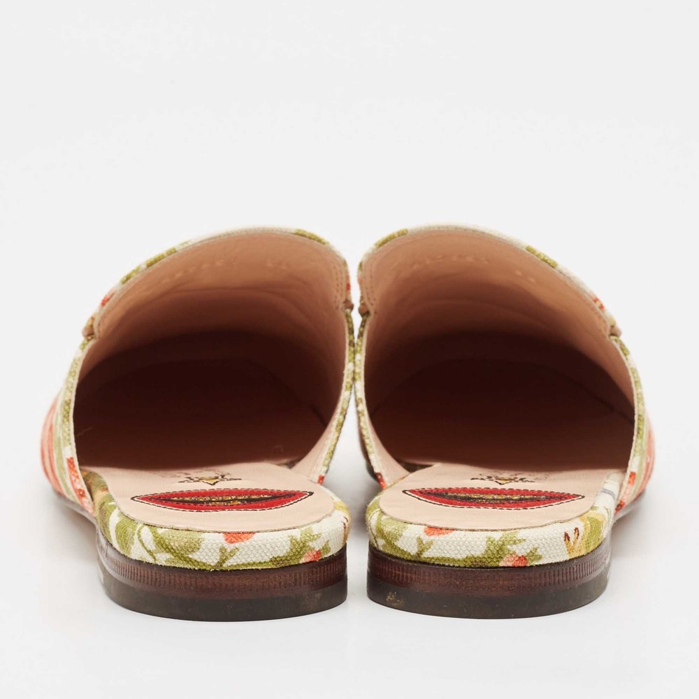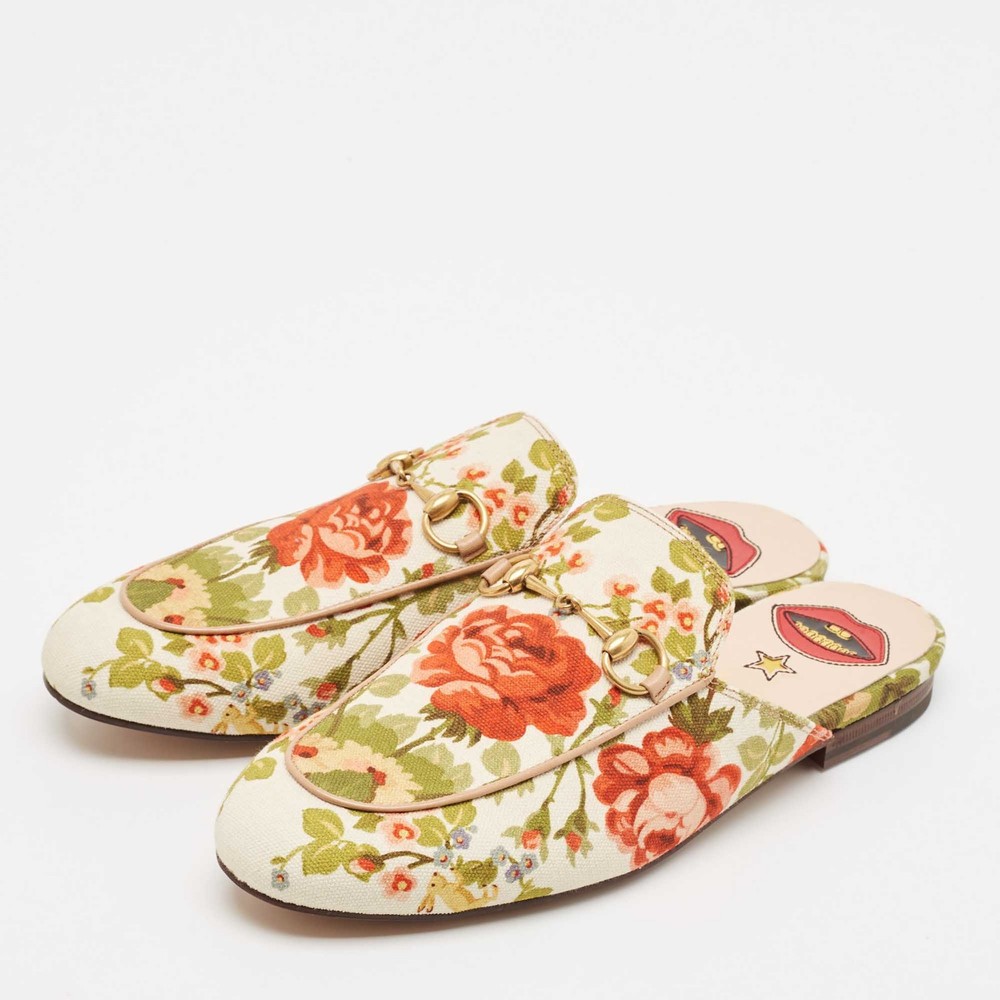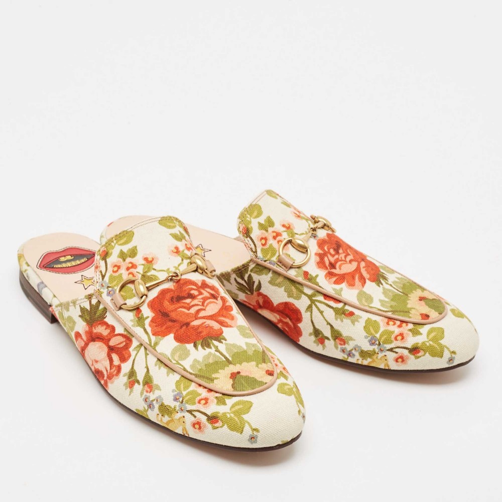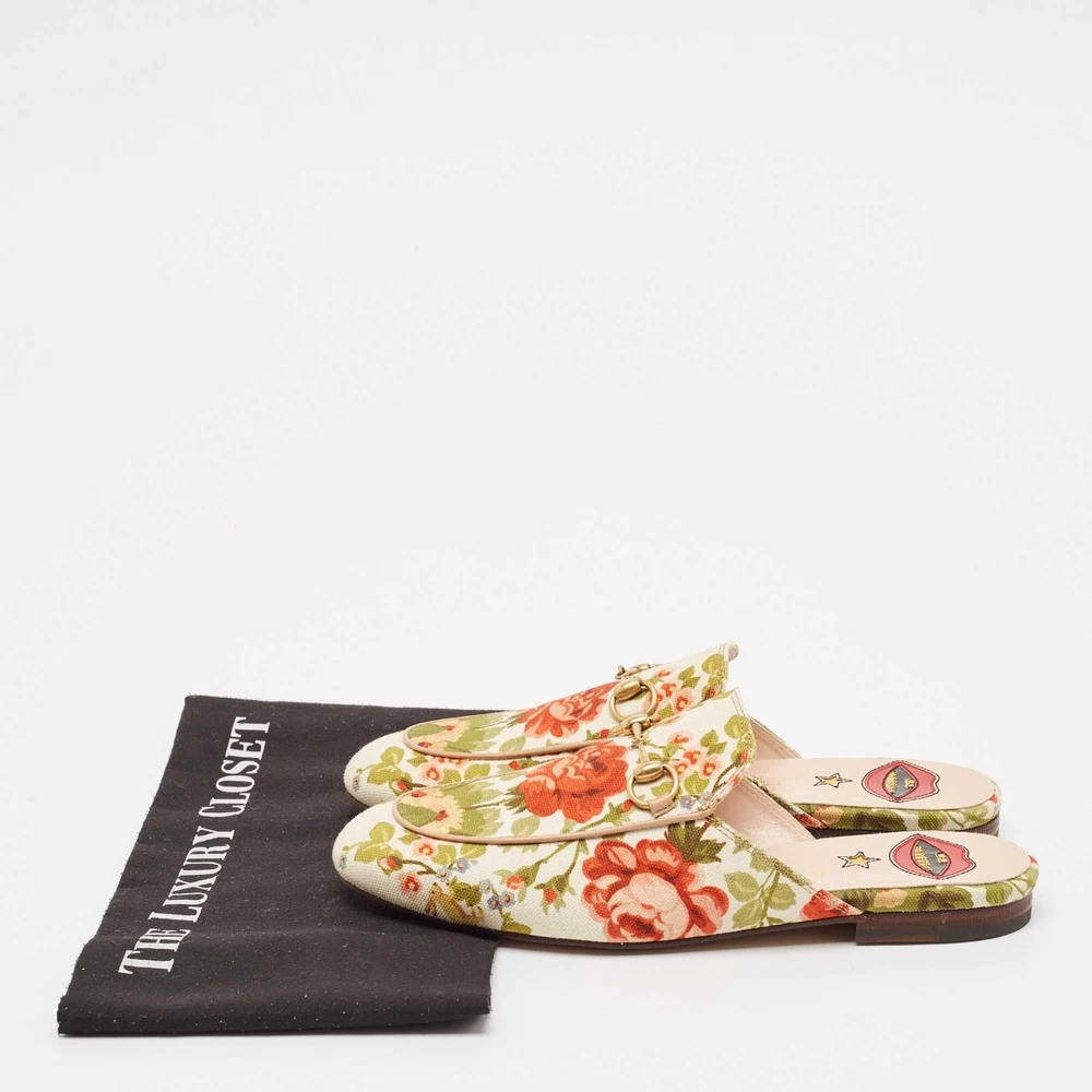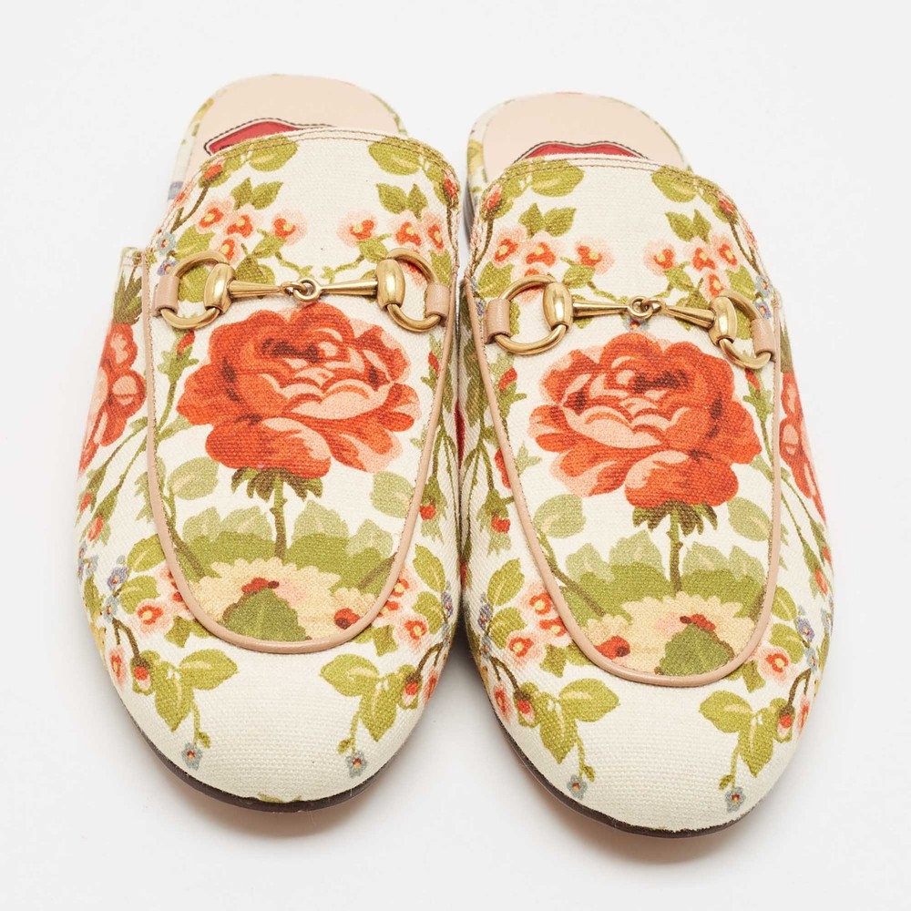 A perfect blend of luxury, style, and comfort, these designer mules are made using quality materials and frame your feet in the most elegant way. They can be paired with a host of outfits from your wardrobe.Certified by The Luxury Closet - This item has gone through a detailed authentication process overseen by our experts. We offer a lifetime guarantee of authenticity on all our items. Import duties, taxes and charges are not included in the item price. These charges are the buyers responsibility. Please check with your country’s customs office to determine what these additional cost will be prior to buying. Our eBay Store About Us Contact Us Add to Favorite Sellers Gucci Multicolor Floral Canvas Princetown Horsebit Flat Mules Size 38 $605 A perfect blend of luxury, style, and comfort, these designer mules are made using quality materials and frame your feet in the most elegant way. They can be paired with a host of outfits from your wardrobe. Product Details Brand Color Multicolor Dimensions Material Canvas Size 38 Outsole Width 8 cm Outsole Length 26 cm Heel Height Includes The Luxury Closet Packaging Certified by The Luxury Closet This item has gone through a detailed authentication process overseen by our experts. We offer a lifetime guarantee of authenticity on all our items. How We Check The in-house team of experts at The Luxury Closet is highly trained to verify the authenticity and the condition of the luxury products. They ensure that only 100% authentic items are put on sale.The evaluation process is unique with its own mix of assessment criteria and differs according to the category. Each item is evaluated based on the following combination of hallmarks, hardware, stitching, symmetry, material, craftsmanship, stamping, codes, hologram stickers, and packaging. Our authenticators also check if the items have been modified or amended (e.g., aftermarket diamonds, replaced batteries, repaired bags, etc.) International Buyers Import duties, taxes and charges are not included in the item price. These charges are the buyers responsibility. Please check with your country’s customs office to determine what these additional cost will be prior to buying.