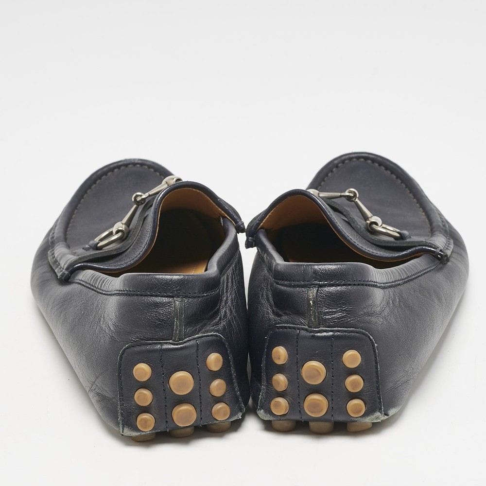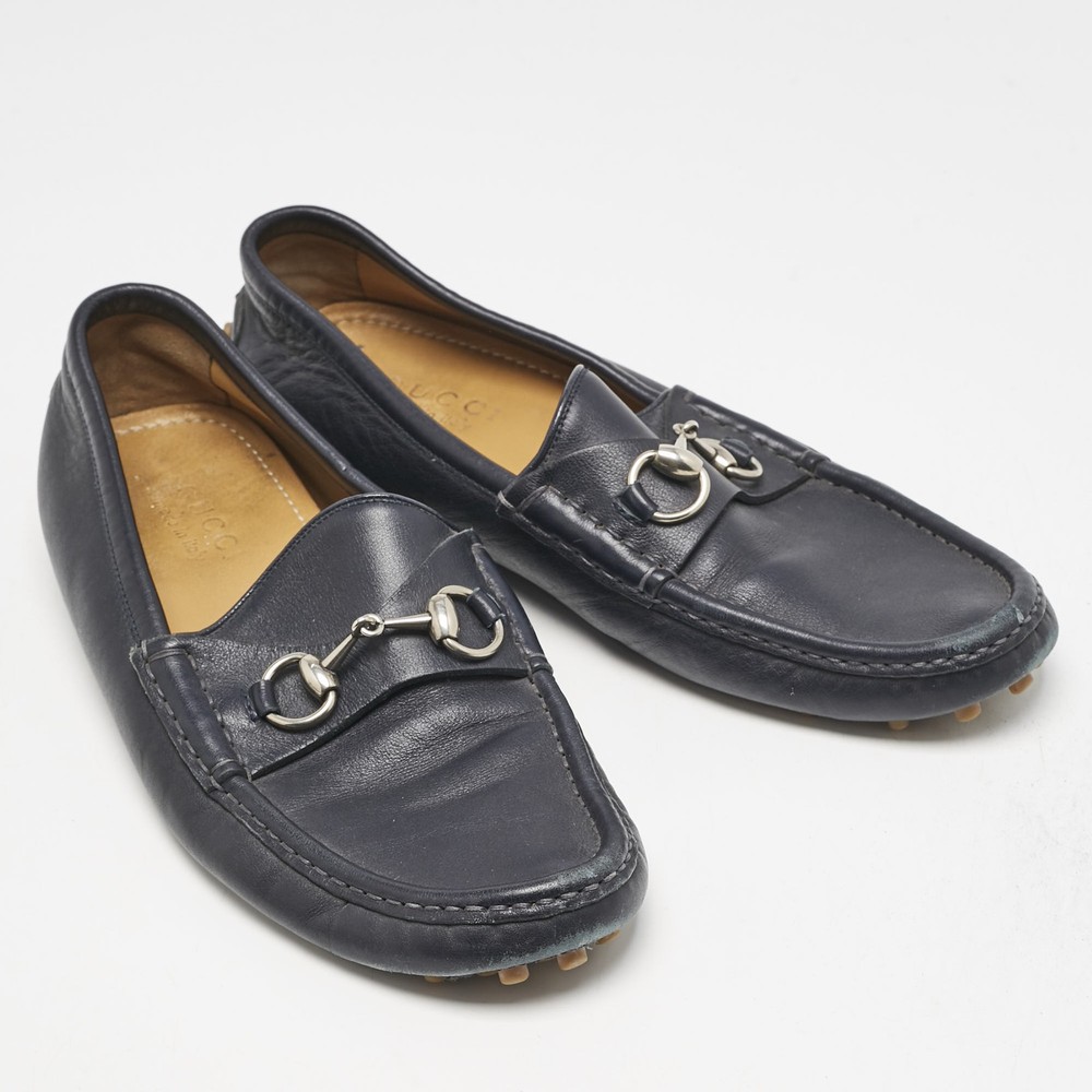 Exhibiting an iconic style and design, the Horsebit loafers from Gucci fetch the signature aesthetic of the brand effortlessly. They are designed using blue leather on the exterior with the emblematic Web strap and a gold toned Horsebit motif embellishing the vamps. Lend total class to your attire by wearing these loafers.Certified by The Luxury Closet - This item has gone through a detailed authentication process overseen by our experts. We offer a lifetime guarantee of authenticity on all our items. Import duties, taxes and charges are not included in the item price. These charges are the buyers responsibility. Please check with your country’s customs office to determine what these additional cost will be prior to buying. Our eBay Store About Us Contact Us Add to Favorite Sellers Gucci Navy Blue Leather Web Horsebit Loafers Size 42.5 $200.2 Exhibiting an iconic style and design, the Horsebit loafers from Gucci fetch the signature aesthetic of the brand effortlessly. They are designed using blue leather on the exterior with the emblematic Web strap and a gold toned Horsebit motif embellishing the vamps. Lend total class to your attire by wearing these loafers. Product Details Brand Color Navy Blue Dimensions Material Leather Size 42.5 Outsole Width Outsole Length Heel Height Includes Certified by The Luxury Closet This item has gone through a detailed authentication process overseen by our experts. We offer a lifetime guarantee of authenticity on all our items. How We Check The in-house team of experts at The Luxury Closet is highly trained to verify the authenticity and the condition of the luxury products. They ensure that only 100% authentic items are put on sale.The evaluation process is unique with its own mix of assessment criteria and differs according to the category. Each item is evaluated based on the following combination of hallmarks, hardware, stitching, symmetry, material, craftsmanship, stamping, codes, hologram stickers, and packaging. Our authenticators also check if the items have been modified or amended (e.g., aftermarket diamonds, replaced batteries, repaired bags, etc.) International Buyers Import duties, taxes and charges are not included in the item price. These charges are the buyers responsibility. Please check with your country’s customs office to determine what these additional cost will be prior to buying.