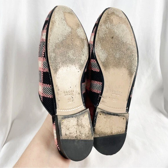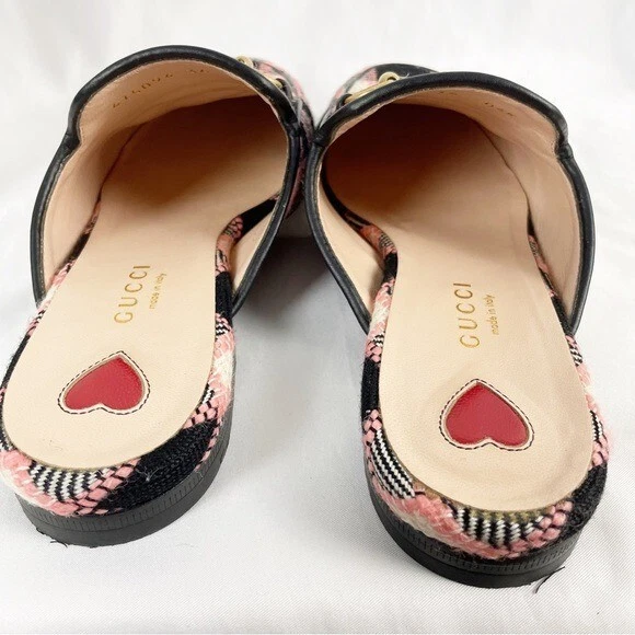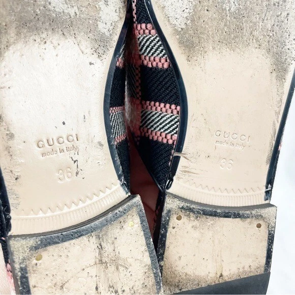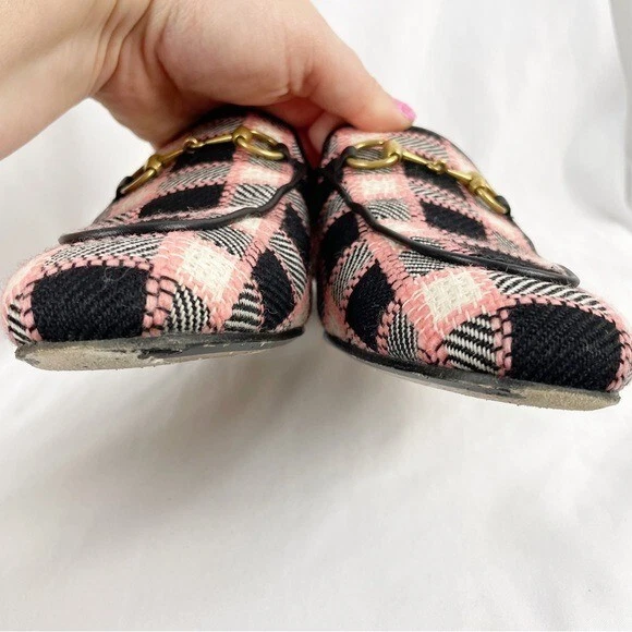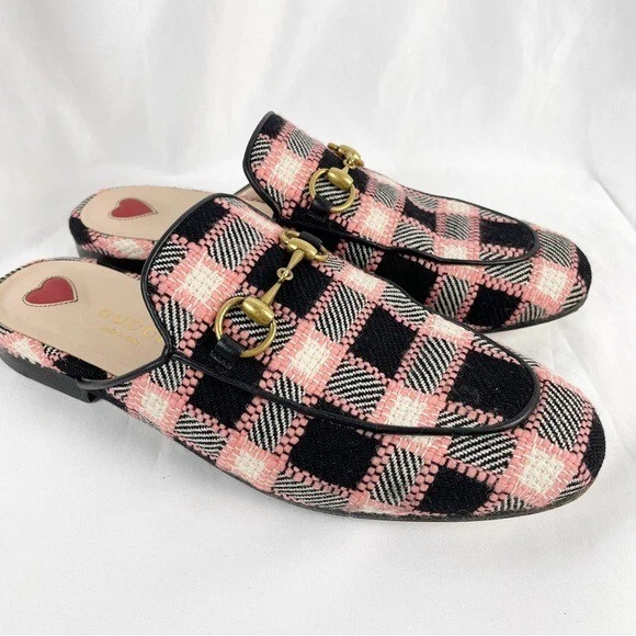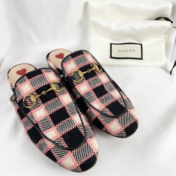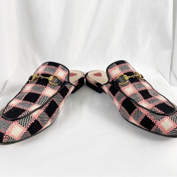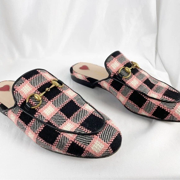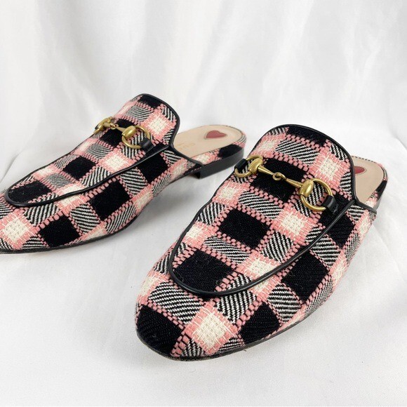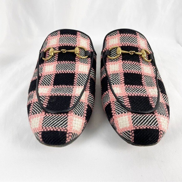 Gucci Princetown Tweed Slide Mules Pink Black EU 36 - Great pre-owned condition - scuffs on bottom of sole, minor overall wear - 0.5in heel - Dust bags included Gold metal horsebit, slip on, pink and black. Check plaid print, almond toe. Slide, slippers, casual, work, designer, luxury.