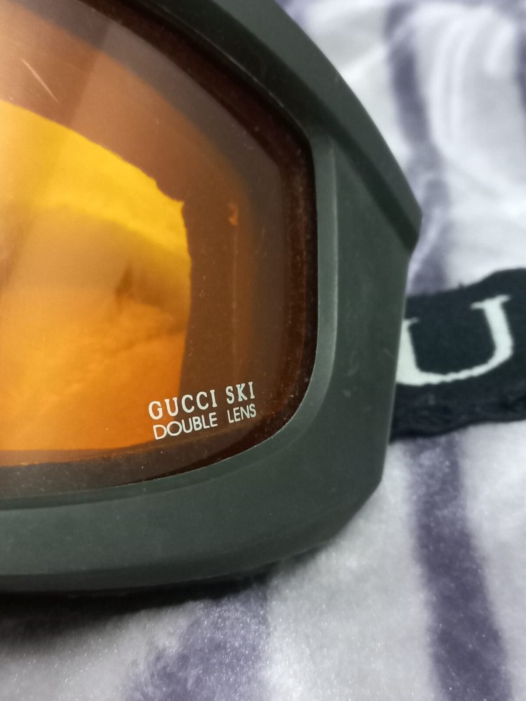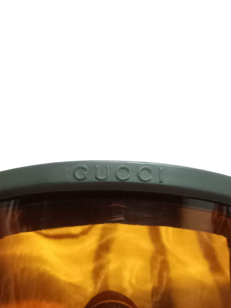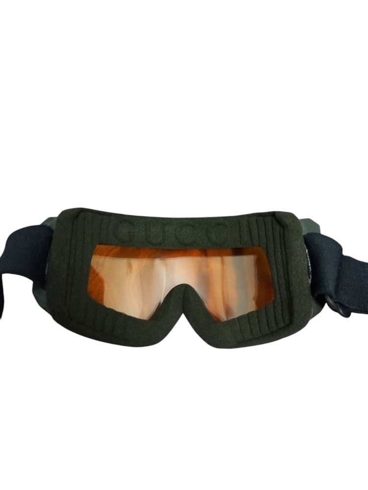 The Gucci Ski Snowboard Goggles feature a vintage design with a black frame and orange tinted lenses, perfect for winter sports like skiing. These unisex adult goggles offer UVA protection and are made with lightweight plastic frames and glass with mirror lens material. The shield style goggles are personalized with the Gucci logo, adjustable for a comfortable fit, and ideal for enhancing visibility on the slopes. These high-performance ski goggles are crafted in Slovenia and cater to both style and function for winter sports enthusiasts.