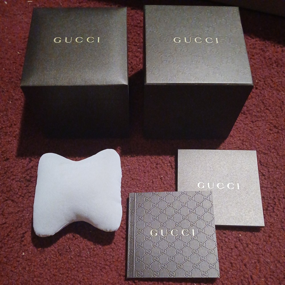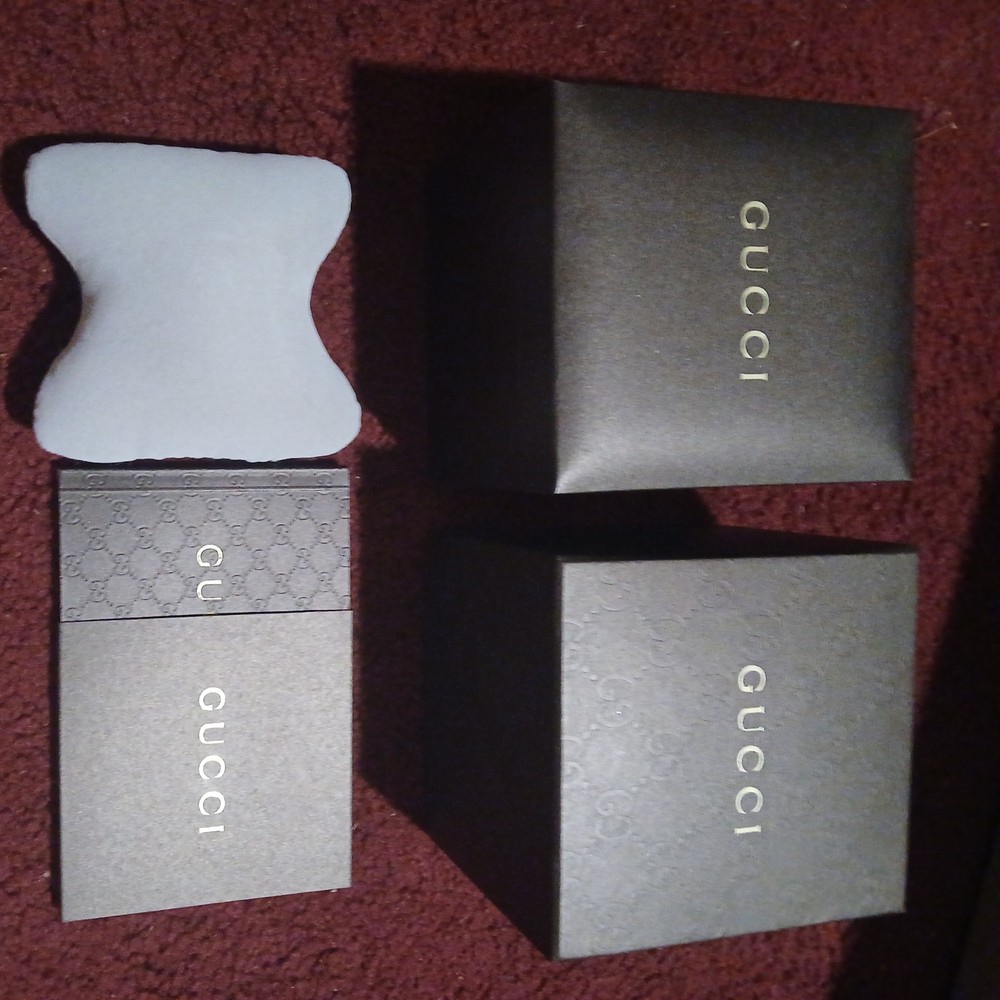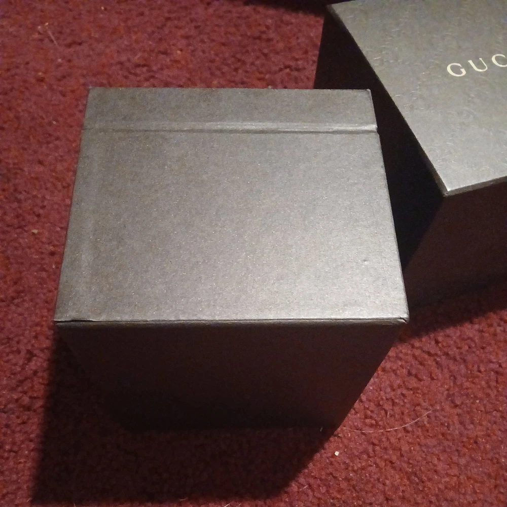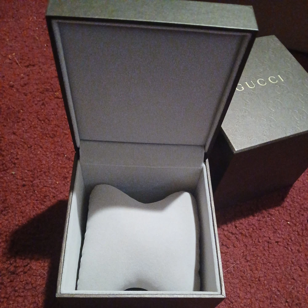 The Gucci Watch Empty Box is a luxurious and stylish accessory that comes with a Gucci watch. This box is designed to hold and showcase the Gucci watch securely, while also serving as a decorative piece. The Gucci brand is known for its high-quality products, and this empty box is a testament to the brand's attention to detail and craftsmanship. Perfect for storing a Gucci watch or for display purposes, this box is a must-have for any watch enthusiast or Gucci lover.