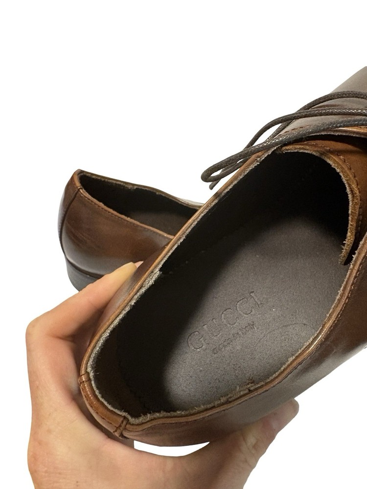 Used Gucci oxfords with lots of life left. These have creases and a scuff on the toe but are in great wearable condition.