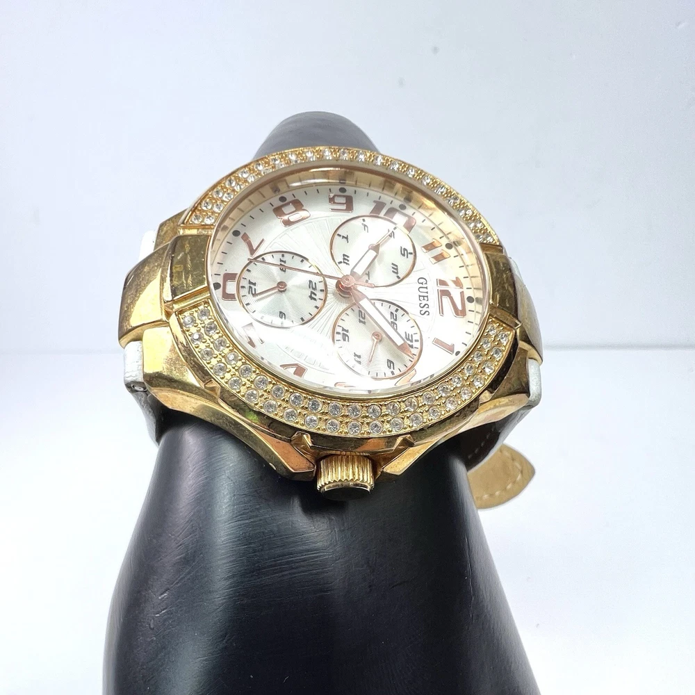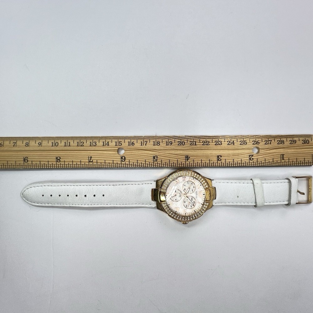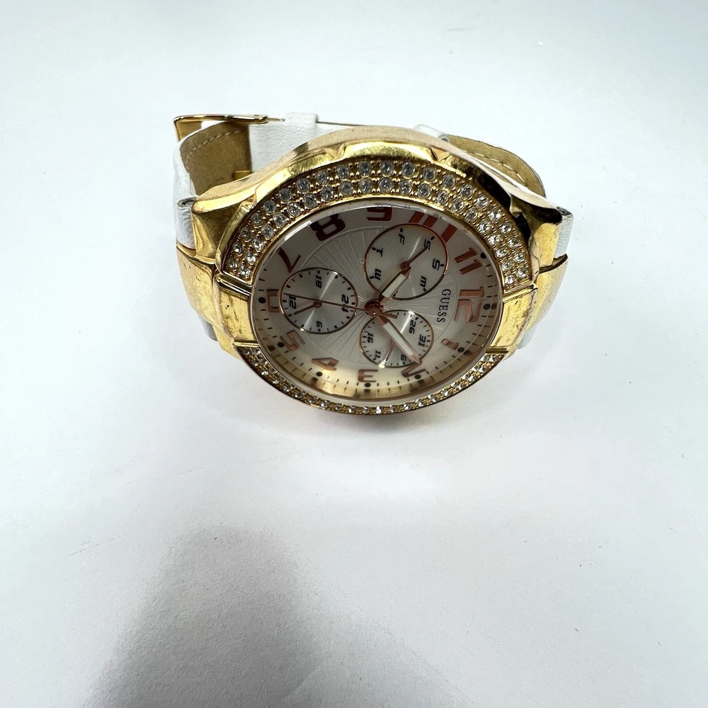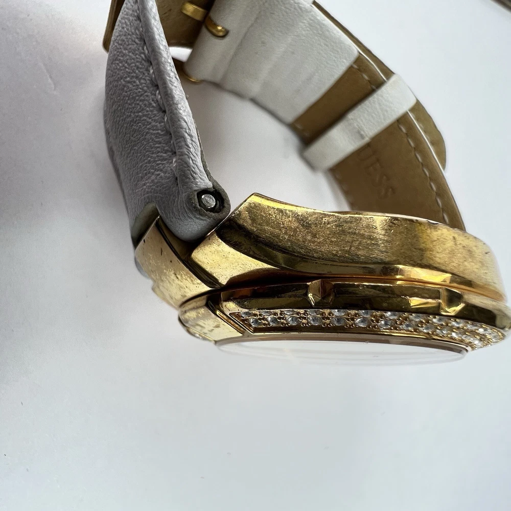 Guess Chronograph Watch with Crystals & White Leather Band Gorgeous Gold Stainless Steel Watch with Crystal Accents. White Leather Adjustable Band & Water Resistant to 100 meters Condition: VERY GOOD * Minor Wear Throughout * Water Resistant 100 meters * Needs New Battery * Model U12529L1 Materials: Stainless Steel & Leather