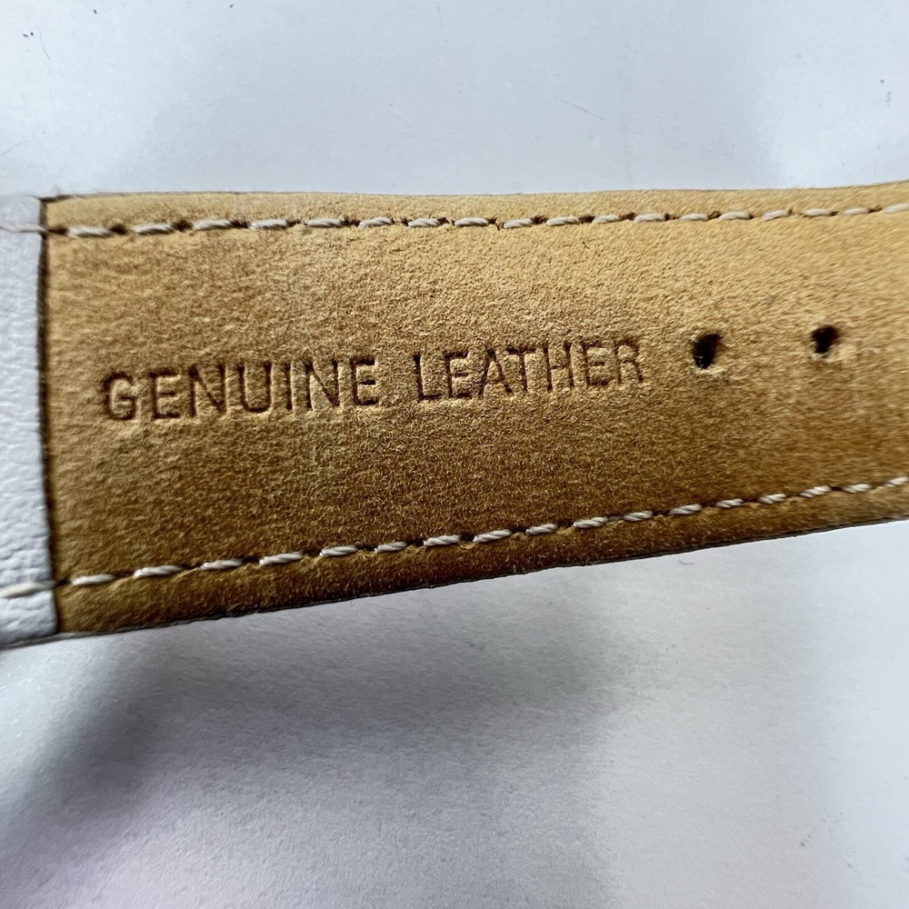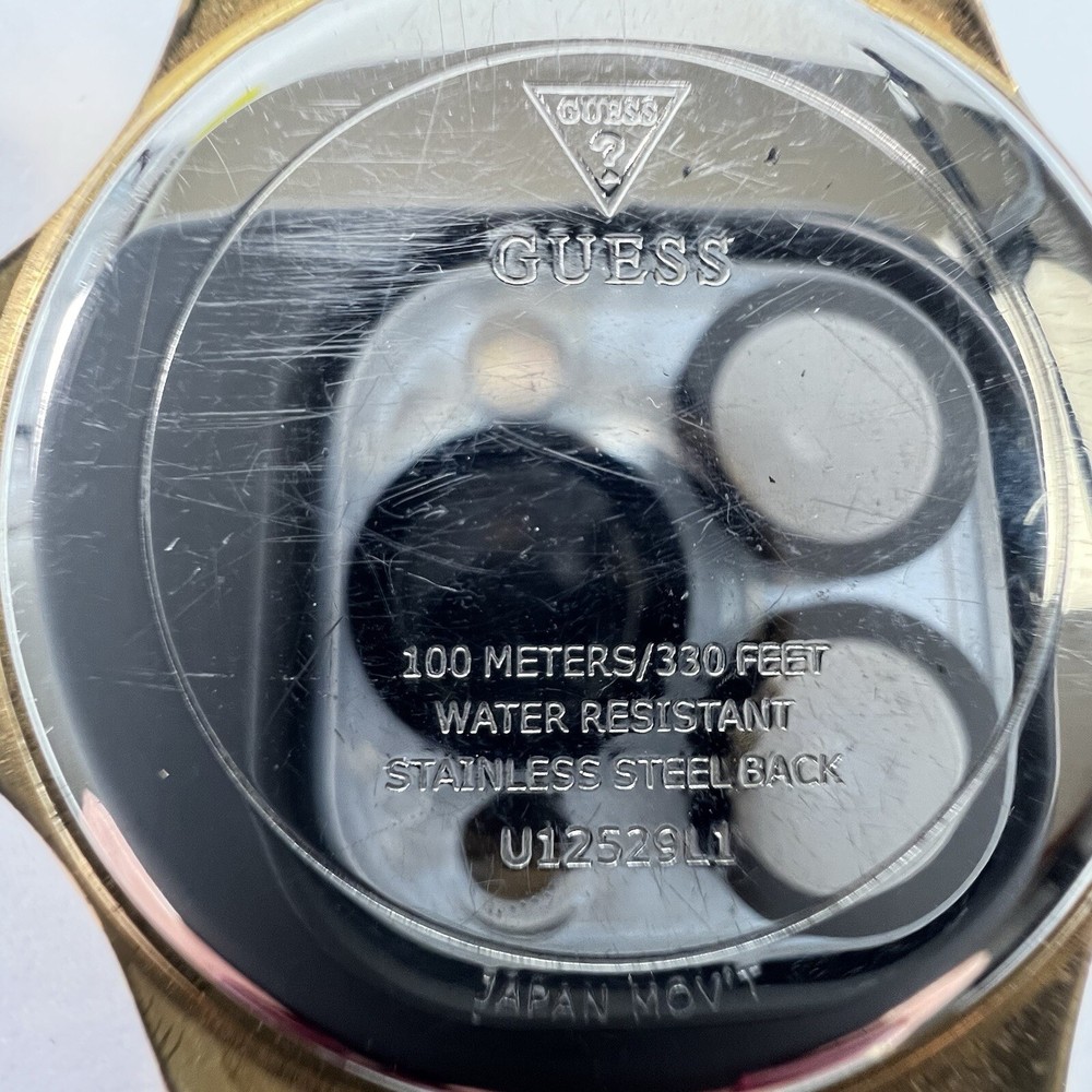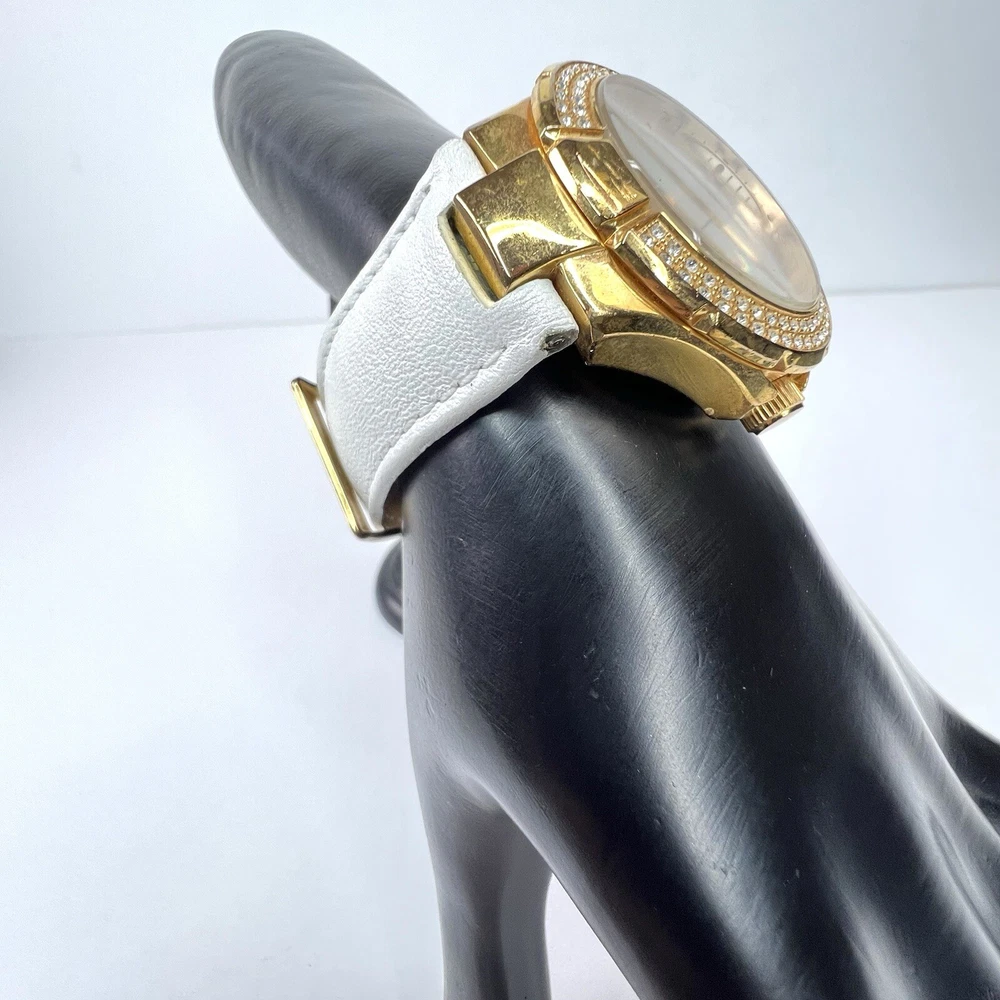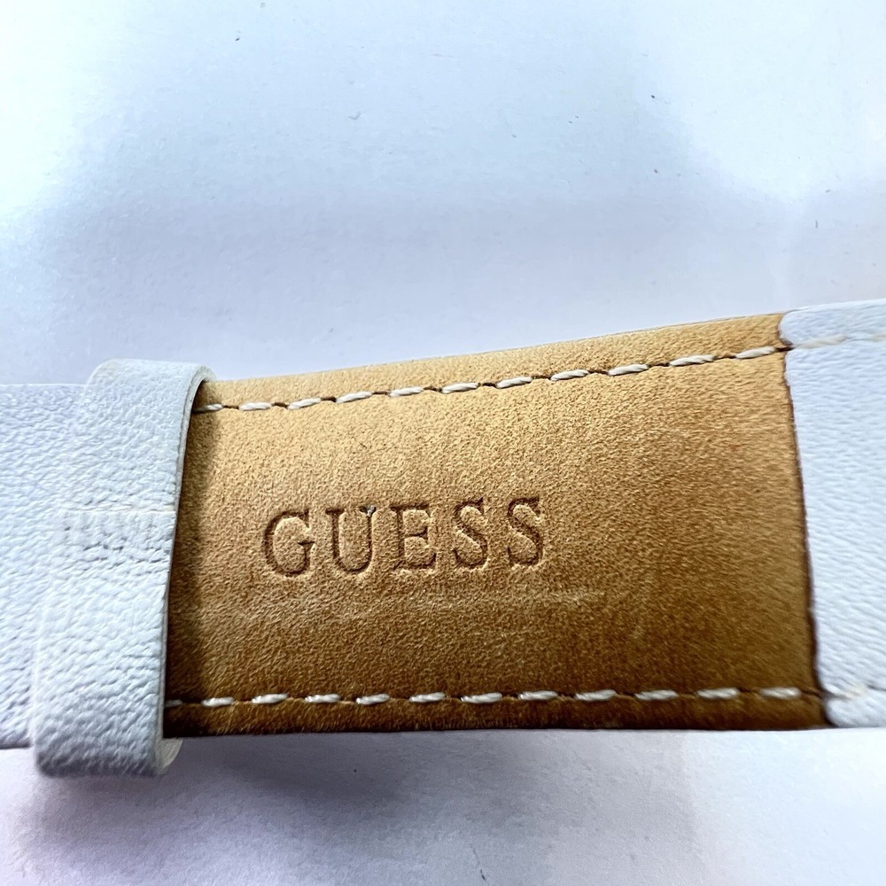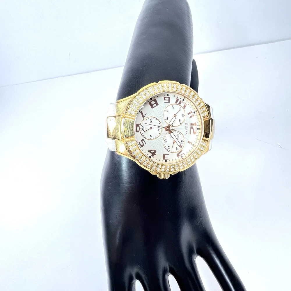 Guess Chronograph Watch with Crystals & White Leather Band Gorgeous Gold Stainless Steel Watch with Crystal Accents. White Leather Adjustable Band & Water Resistant to 100 meters Condition: VERY GOOD * Minor Wear Throughout * Water Resistant 100 meters * Needs New Battery * Model U12529L1 Materials: Stainless Steel & Leather