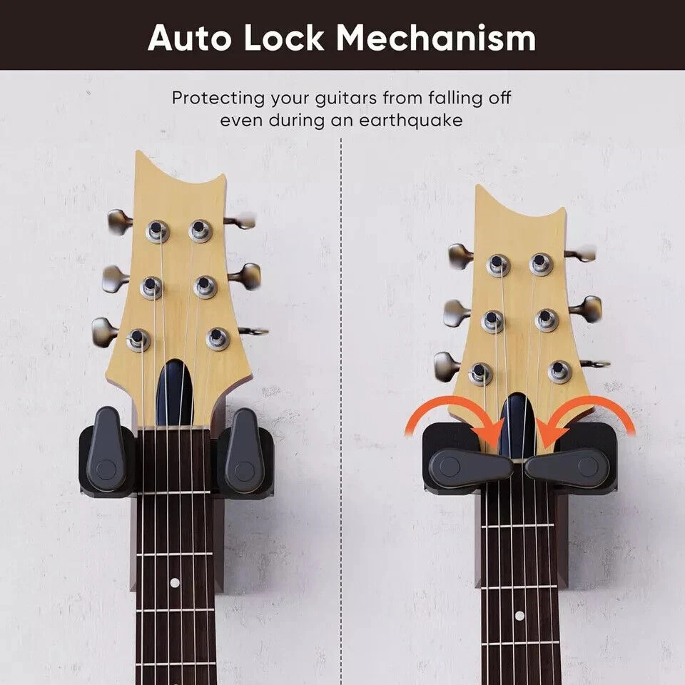 Guitar Wall Mount Auto Lock, 2 Pack Guitar Wall Hanger, Hard Wood Base Guitar..V AUTO LOCKING MECHANISM- Ueteto guitar wall mount hanger has an auto-locking/unlocking arms, which instantly engage/disengage from the weight of the instrument, making sure your valuable guitars stay in place even during an earthquake WORK WITH UNEVEN HEADSTOCKS - The guitar hanger wall mount swivels to accommodate oddly-shaped head stocks, so it works with all types of guitars like acoustic, electric, bass, classical guitar and ukuleles, banjos and mandolins. It is even essential for deep-body guitars like dreadnoughts for providing plenty of wall clearance. EASY INSTALLATION - The guitar hanger is spring loaded; it is pushed into a notch at 45 degrees then turned to lock it in place and then that's it. An adhesive template is provided for drilling, along with wall anchors and screws for wall mounting on bricks wall, dry wall, stud or wood. Wall anchors are upgraded after reading previous customers’ reviews, and please do use the bigger anchors and screws for drywall mounting. PROTECT YOUR INSTRUMENT - Yoke cradle is covered with a high-density rubber to protect your guitar's finish. It works fine for polyurethane or acrylic finishes. Hefty enough to hold heavier instruments up to 15KG. ---AUTO LOCKING MECHANISM- Ueteto guitar wall mount hanger has an auto-locking/unlocking arms, which instantly engage/disengage from the weight of the instrument, making sure your valuable guitars stay in place even during an earthquake ---WORK WITH UNEVEN HEADSTOCKS - The guitar hanger wall mount swivels to accommodate oddly-shaped head stocks, so it works with all types of guitars like acoustic, electric, bass, classical guitar and ukuleles, banjos and mandolins. It is even essential for deep-body guitars like dreadnoughts for providing plenty of wall clearance. ---EASY INSTALLATION - The guitar hanger is spring loaded; it is pushed into a notch at 45 degrees then turned to lock it in place and then that's it. An adhesive template is provided for drilling, along with wall anchors and screws for wall mounting on bricks wall, dry wall, stud or wood. Wall anchors are upgraded after reading previous customers’ reviews, and please do use the bigger anchors and screws for drywall mounting. ---PROTECT YOUR INSTRUMENT - Yoke cradle is covered with a high-density rubber to protect your guitar's finish. It works fine for polyurethane or acrylic finishes. Hefty enough to hold heavier instruments up to 15KG. Guitar Wall Mount Auto Lock, 2 Pack Guitar Wall Hanger, Hard Wood Base Guitar..V AUTO LOCKING MECHANISM- Ueteto guitar wall mount hanger has an auto-locking/unlocking arms, which instantly engage/disengage from the weight of the instrument, making sure your valuable guitars stay in place even during an earthquake WORK WITH UNEVEN HEADSTOCKS - The guitar hanger wall mount swivels to accommodate oddly-shaped head stocks, so it works with all types of guitars like acoustic, electric, bass, classical guitar and ukuleles, banjos and mandolins. It is even essential for deep-body guitars like dreadnoughts for providing plenty of wall clearance. EASY INSTALLATION - The guitar hanger is spring loaded; it is pushed into a notch at 45 degrees then turned to lock it in place and then that's it. An adhesive template is provided for drilling, along with wall anchors and screws for wall mounting on bricks wall, dry wall, stud or wood. Wall anchors are upgraded after reading previous customers’ reviews, and please do use the bigger anchors and screws for drywall mounting. PROTECT YOUR INSTRUMENT - Yoke cradle is covered with a high-density rubber to protect your guitar's finish. It works fine for polyurethane or acrylic finishes. Hefty enough to hold heavier instruments up to 15KG. AUTO LOCKING MECHANISM- Ueteto guitar wall mount hanger has an auto-locking/unlocking arms, which instantly engage/disengage from the weight of the instrument, making sure your valuable guitars stay in place even during an earthquake WORK WITH UNEVEN HEADSTOCKS - The guitar hanger wall mount swivels to accommodate oddly-shaped head stocks, so it works with all types of guitars like acoustic, electric, bass, classical guitar and ukuleles, banjos and mandolins. It is even essential for deep-body guitars like dreadnoughts for providing plenty of wall clearance. EASY INSTALLATION - The guitar hanger is spring loaded; it is pushed into a notch at 45 degrees then turned to lock it in place and then that's it. An adhesive template is provided for drilling, along with wall anchors and screws for wall mounting on bricks wall, dry wall, stud or wood. Wall anchors are upgraded after reading previous customers’ reviews, and please do use the bigger anchors and screws for drywall mounting. PROTECT YOUR INSTRUMENT - Yoke cradle is covered with a high-density rubber to protect your guitar's finish. It works fine for polyurethane or acrylic finishes. Hefty enough to hold heavier instruments up to 15KG.