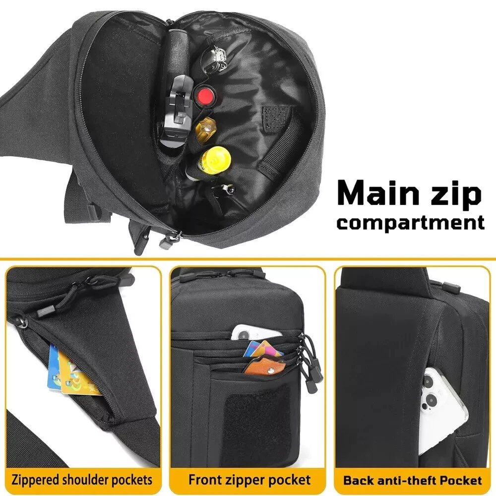 Description Concealed carry sling bag for men - Dimensions of main compartment approx 10 x 8 inches - Total height 16" Organize your accessories in five compartments and carry one gun bag for handguns Universal pistol holster inside of front pocket - Hot-pull strap for quick eccess to the gun Mens tactical sling bag for concealed carry of pistol Made of high-quality sturdy zippers, nylon material and polyester fiber,600D Oxford fabric has ultra-high density, good wear and water resistance. The built-in soft padding can protect your firearms well during storage and transport.