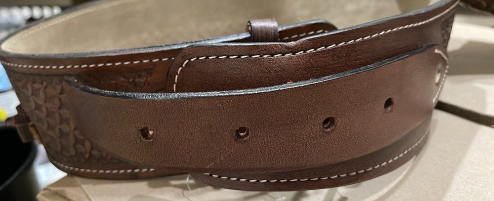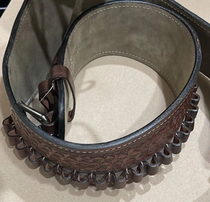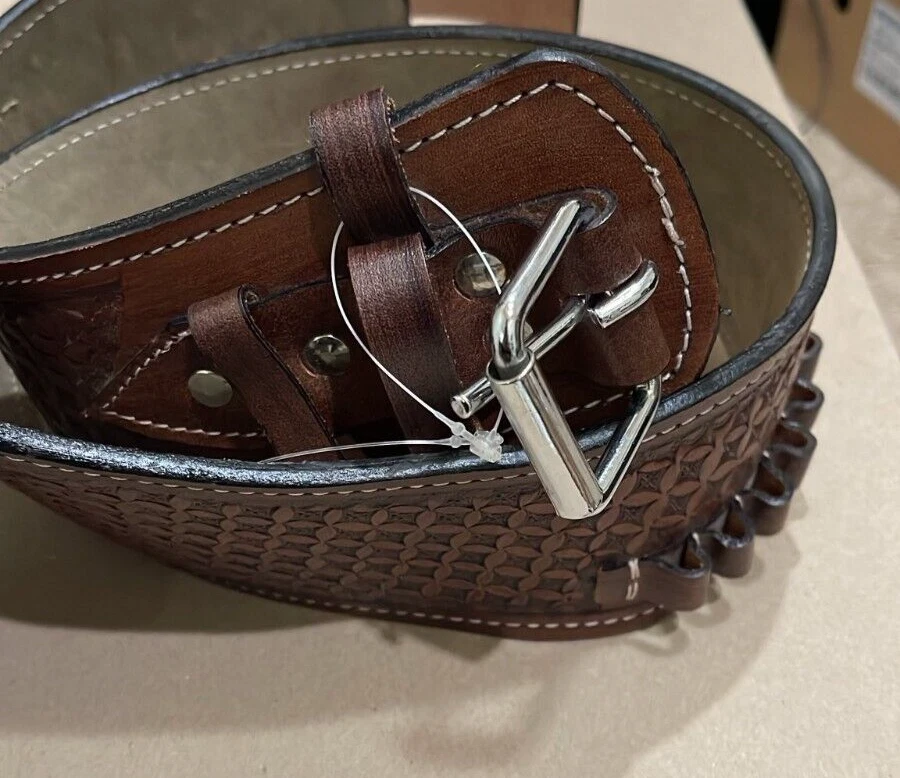These distinctive leather pistol holster belts are ideal for daily use, hunting, ranch work, or add to your collection. Premium, real, hand-tooled leather is used to make these belts, which are crafted for a smooth draw and easy re-holstering. An incredibly stunning and amazing piece. Size 38"-40"