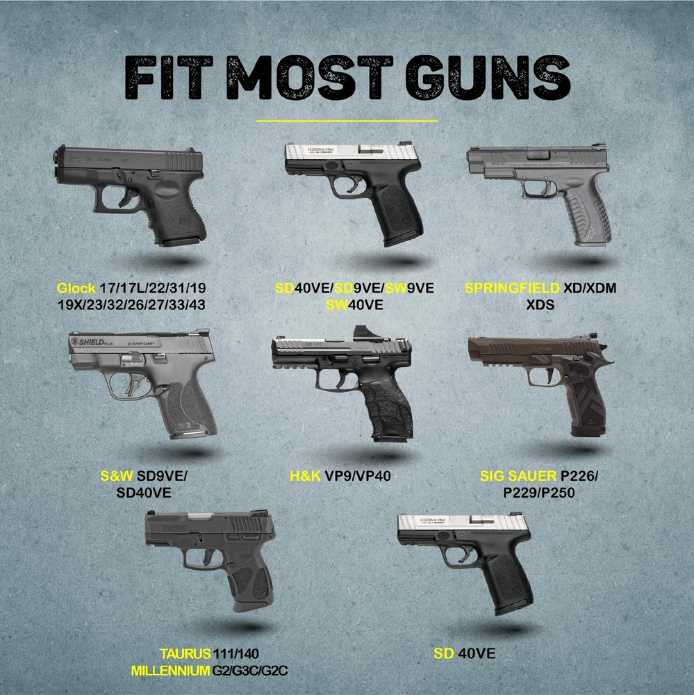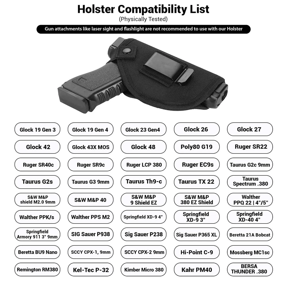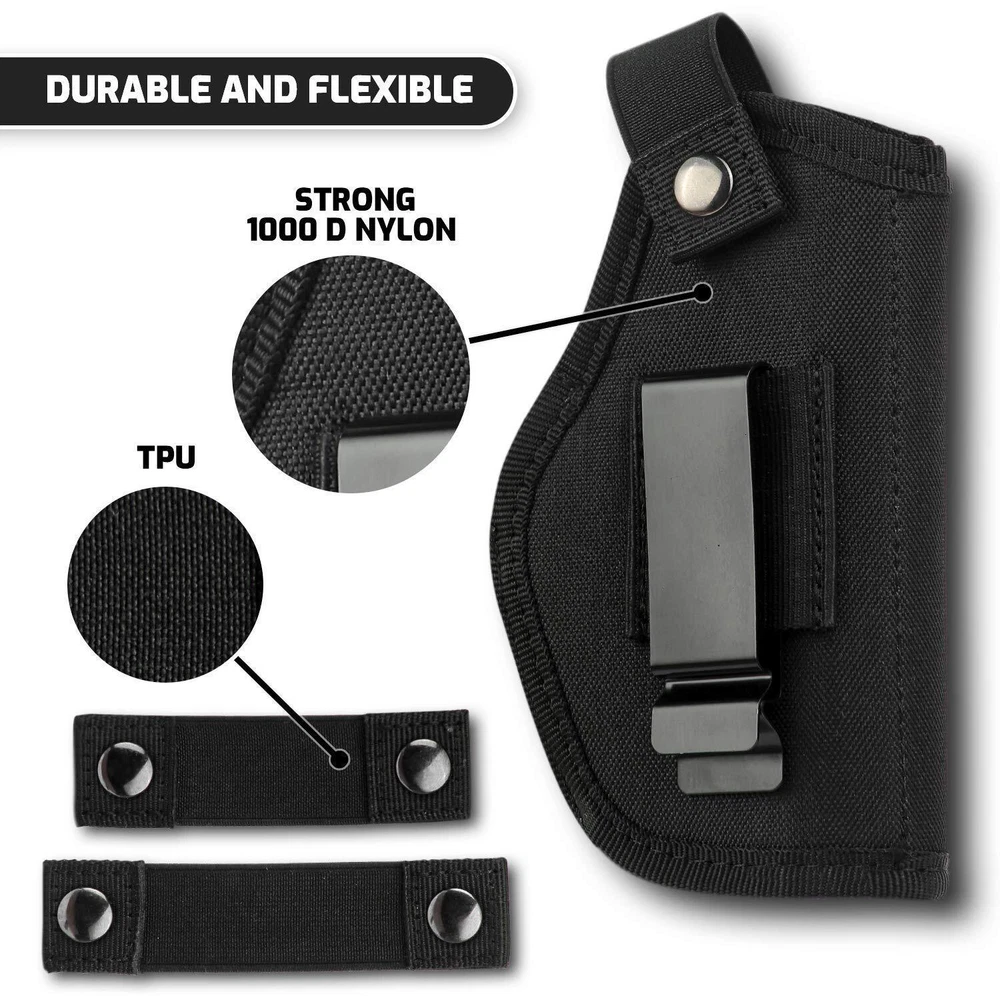 Durable Build: Crafted from tough 1000D nylon, our 9mm holster for men features a resistant Zn-Fe plated button, secure TPU elastic cord, & a versatile 2.3" metal clip for inside or outside waistband placement, adjustable for belts up to 2 inches wide. Innovative Design: Our gun holster for men concealed carry accommodates concealed carry for Compact & Subcompact guns. A simple stitch adjustment allows a snug fit i.e. M&P shield M2.0 with crimson trace needs to trim the initial set of threads ensuring a proper fit. Please Note: This holster may not accommodate firearms with additional attachments, such as lasers, lights, or high front sights. Enhanced Safety: The 9mm gun holster for women and men features special tailoring that prevents your gun from sliding down or budging. Our concealed carry universal holster for men is comfortable to wear, so you never have to worry about safety. Carry Confidently: Crafted for Durability – Our holsters are built to withstand the test of time, ensuring long-lasting use with quality materials & craftsmanship. We support your expectations, & offer easy repays if needed Versatile: Universal design allows for compatibility with various handgun models and sizes.