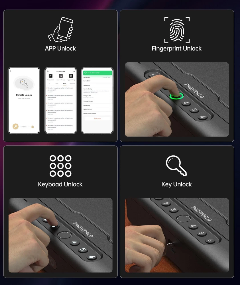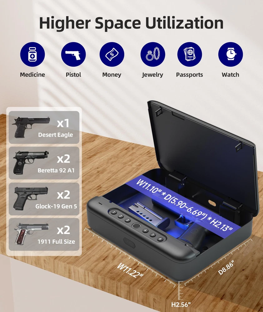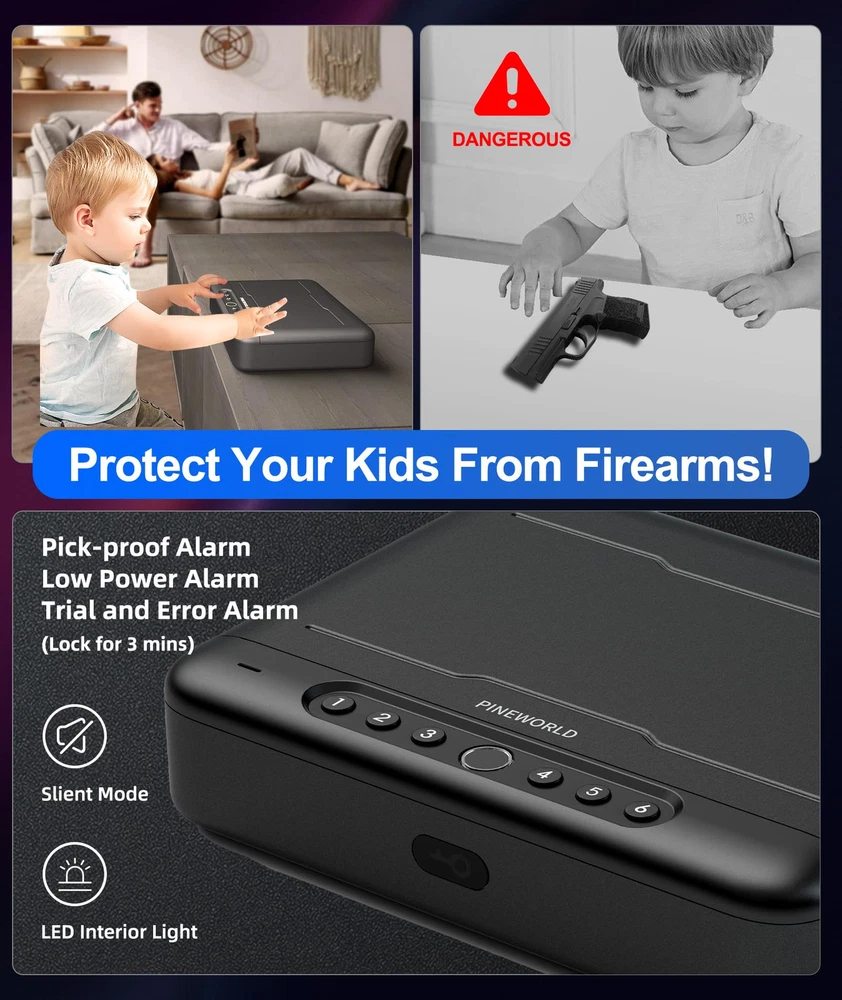 4 Quick Access Biometric Gun Safe: It can be quickly accessed via Fingerprint/Passcode/Key/APP. It is ideal for pistols, cash, and other valuables. Full digital keypad from 1-6, you can set 4 or 6 digit passcode as you like. Noted: The passcode can't be to simple like "1234", etc. Remote Control the Smart Safe-APP: You can remote control via APP-'FC SMARTHOME' . No matter unlock the pistol cases or notify of unauthorized access. In addition, you could add a new fingerprint or change your password in the APP. Reliable Fingerprint Scanner: High definition biometric fingerprint scanner records your fingerprint from multiple angles to unlock within 0.5 seconds regardless of how you touch the scanner. Records 50 fingerprints, the failure rate less than 0.9%. Full Voice Prompt & Double U Design: Easy to use with full voice guide, you can follow the voice prompt to use your gun safe anytime and anywhere. Double U Design is better for anti-theft function, but you need to make sure the cap is completely locked. Emergency Charging Port: Gun safe charging TYPE-C cable can be used in emergencies. Reminder: Do not keep long-term charging, it will affect the service life of the safe. (USB-A to TYPE-C Cable is not included). Multiple Alarms Meet Your Needs: : Anti-theft reminds your for violent unlock. Low Battery remind you to change the battries. Trial and Error Alarm stopped the wrong password. Coercion Alarm give you opportunity to ask for help under coercion. Stable Steel Cable & Mute Mode: Stainless Steel Rope with Loops is good choice to fix the gun safe where you want it. Quick mute mode adjustment (Long press key 2) helps you get the firearm quietly which keeps you safe in danger. Portable: With portable design, you can keep this gun safe in a drawer, cabinet, luggage, or anywhere easy for you to use as a nightstand handgun safe. Keep your guns away from children and protect your family and yourself anytime, anywhere. Nice Gift Choice For Him/Her: EXCELLENT GIFTS IDEA For Valentines/Christmas/Birthday/Father's Day. , firm as PINE, bring you to safer WORLD. Attentive Service: biometric gun safe for pistols packed with thickened packaging box, and the interior is lined with shock-proof padding and cap foam to less scratches or damage. Contact us with any questions, we'll be glad to help you.