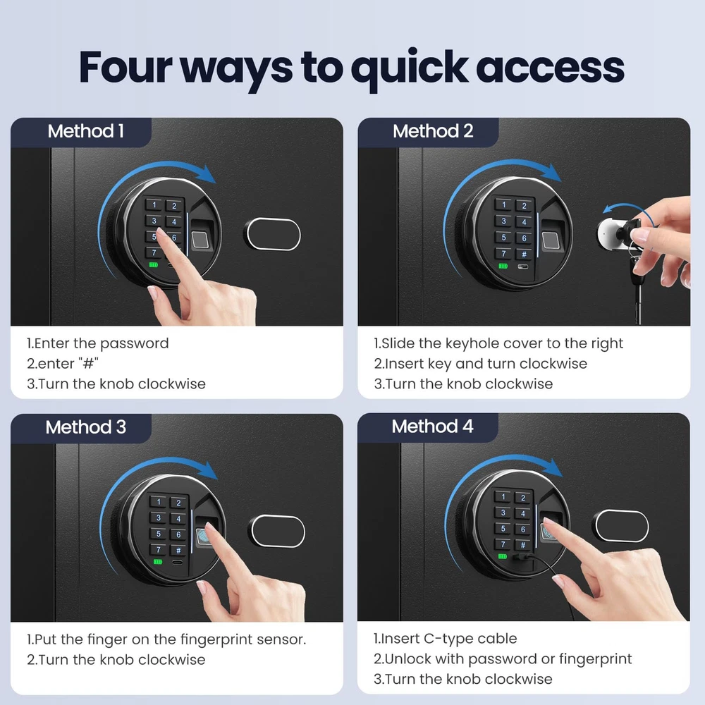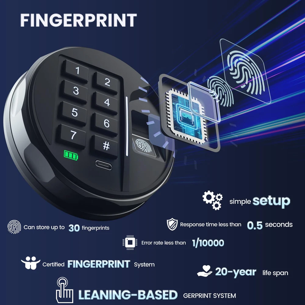 Gun Rack & Gun Organizer: No fingerprint can open the gun safe until it is set. The biometric gun safe comes with a gun rack and a gun organizer for car keys, flashlights, multiple magazines, passports, and more Biometric Quick Access: Biometric gun safe for handgun equipped with a high-resolution biometric sensor supports the storage of up to 30 fingerprints, with a fingerprint response time of less than 0.3 seconds and an unlocking time of less than 1 second Password & Emergency Key: Handgun safe password can be set from 3 to 8 digits and it has 6.7 million permutations. The safe box is prepare as a money safe. Additionally, pistol safe comes with two emergency keys in case you forget the password Access in Dark & LED & Silent: We have an additional feature of a backlit keypad compared to other fingerprint gun safe. With this, you can have a clearer view and quickly open the safe in the night.And it also comes with LED lights and a silent mode for the keypad. Metal Turntable & Rugger: The pistol safe has upgraded its metal knobs to enhance the overall quality. The robust construction, including the heavy door and thick walls, makes the safe very difficult to steal and ensures longevity Easy to Install & Removable Shelf: Our gun safe for handgun comes with four expansion screws, making it easy to secure in any location you desire, such as a wardrobe or bedside. Provide a movable shelf for space utilization and categorized storage Size: Gun safe biometric product size, 12.99"D x 13.78"W x 16.54"H. Our vision is to provide customers with a safe for a lifetime