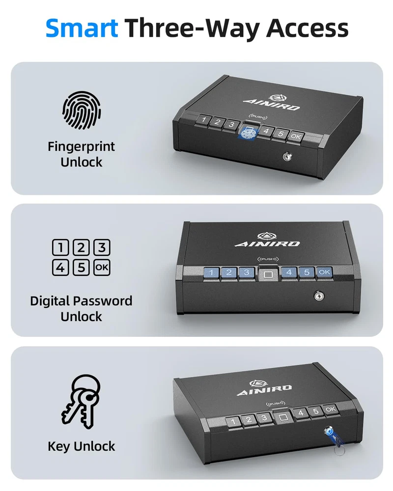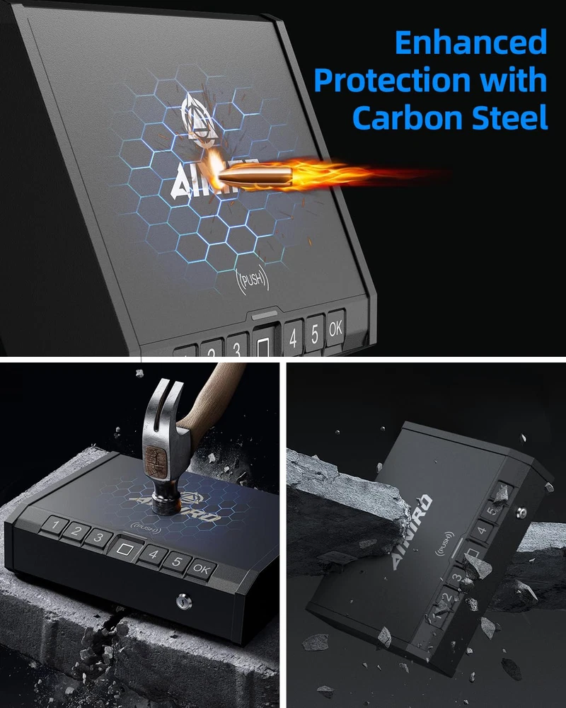 [Advancing Biometric Technology]Quick Access gun safe for guns with just 0.5s biometric technology. Store up to 30 fingerprints for multiple users. Upgraded biometrics guarantee the security of your possessions while providing instant access. You can make sure that your handgun is safely locked away and secure from children getting their hands on it. The gun safe enables swift retrieval during critical moments, granting you invaluable additional time in times of peril. Guard the people and things you cherish. [Smart Three-Way Access]Our mission is to keep your gun in a safe and make sure that only you can get your hands on it with an handgun safe for the nightstand. We offer versatile 3 ways to enter the biometric gun safe, keypad PIN code as well and 2 backup override keys which will make sure you can always quickly access your pistols. [Enhanced Protection with Carbon Steel] gun safe for pistols is constructed using high carbon steel, providing exceptional durability and ultimate protection against thousands of potential attacks. Additionally, the well-built premium metal lock cylinder further enhances the security of your firearms. By storing your guns in our gun lock box, you can rest assured that even in the unfortunate event of a break-in while you're away from home, your handguns will remain securely protected from burglars. [Portable & Large Capacity] Car gun safe can be used for travel, SUVs, and Trucks. Also at home, drawer,in-wall, bedside or under the bed, cabinet, luggage, or other nooks. As a big gun safes for handguns is enough to hold two standard-size regular-frame pistols or your EDCs and gun accessories. Padded with soft foam to prevent scratches. In addition. [What-You-Get] With12-month warranty, and friendly customer service. Size: exterior dimensions are 11.49" x 9.17" x 3.07", and interior dimensions are 10.63" x 6.69" x 2.91".