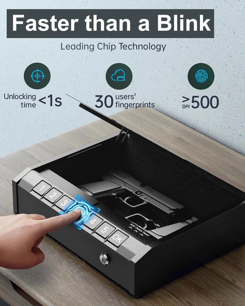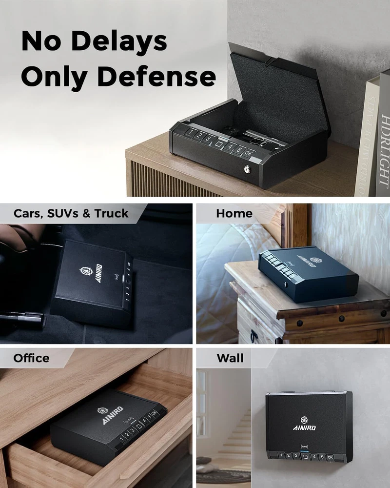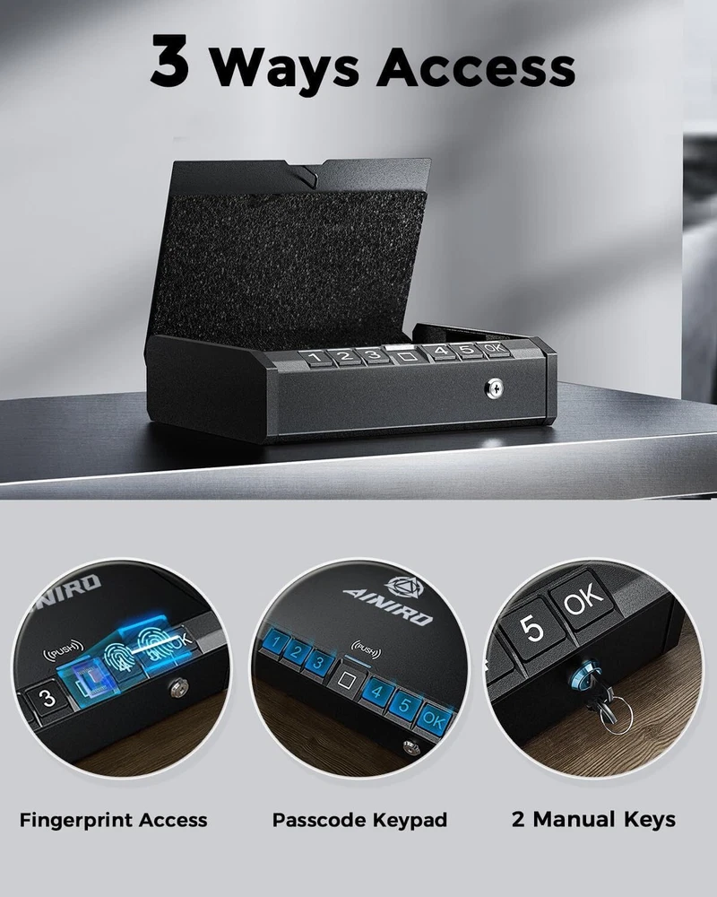 Product Dimensions 9.21"D x 11.57"W x 3.11"H Lock Type Combination, Fingerprint, Keys Color Darknight Black Capacity 0.12 Cubic Feet Material Carbon Steel Special Feature Portable, Alarm System, Combination Lock, Anti-Theft, Silent Mode Mounting Type Wall Mount, Floor Mount Control Type Key Control Included Components AINIRO Gun Safe, Mounting screws, Backup keys, Heavy Steel Cable See less About this item [Advancing Biometric Technology]Quick Access gun safe for guns with just 0.5s biometric technology. Store up to 30 fingerprints for multiple users. Upgraded biometrics guarantee the security of your possessions while providing instant access. You can make sure that your handgun is safely locked away and secure from children getting their hands on it. The AINIRO gun safe enables swift retrieval during critical moments, granting you invaluable additional time in times of peril. Guard the people and things you cherish. [Smart Three-Way Access]Our mission is to keep your gun in a safe and make sure that only you can get your hands on it with an AINIRO handgun safe for the nightstand. We offer versatile 3 ways to enter the biometric gun safe, keypad PIN code as well and 2 backup override keys which will make sure you can always quickly access your pistols. [Enhanced Protection with Carbon Steel] AINIRO gun safe for pistols is constructed using high carbon steel, providing exceptional durability and ultimate protection against thousands of potential attacks. Additionally, the well-built premium metal lock cylinder further enhances the security of your firearms. By storing your guns in our gun lock box, you can rest assured that even in the unfortunate event of a break-in while you're away from home, your handguns will remain securely protected from burglars. [Portable & Large Capacity] AINIRO Car gun safe can be used for travel, SUVs, and Trucks. Also at home, drawer,in-wall, bedside or under the bed, cabinet, luggage, or other nooks. As a big gun safes for handguns is enough to hold two standard-size regular-frame pistols or your EDCs and gun accessories. Padded with soft foam to prevent scratches. In addition. Product Dimensions 9.21"D x 11.57"W x 3.11"H Lock Type Combination, Fingerprint, Keys Color Darknight Black Capacity 0.12 Cubic Feet Material Carbon Steel Special Feature Portable, Alarm System, Combination Lock, Anti-Theft, Silent Mode Mounting Type Wall Mount, Floor Mount Control Type Key Control Included Components AINIRO Gun Safe, Mounting screws, Backup keys, Heavy Steel Cable Item Weight 2.27 Kilograms Alarm Audible Water Resistance Level Not Water Resistant Chamber Depth 2.91 Inches Chamber Height 10.63 Inches Chamber Width 6.69 Inches Item Package Dimensions L x W x H 13.78 x 13.07 x 4.8 inches Package Weight 2.95 Kilograms Item Dimensions LxWxH 9.21 x 11.57 x 3.11 inches Model Name Darknight Black Number of Items 1 Part Number HX-008A Style Fingerprint Gun Safe