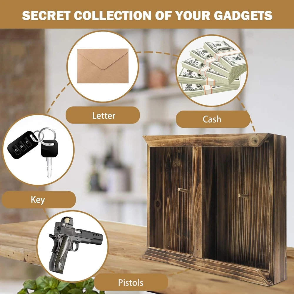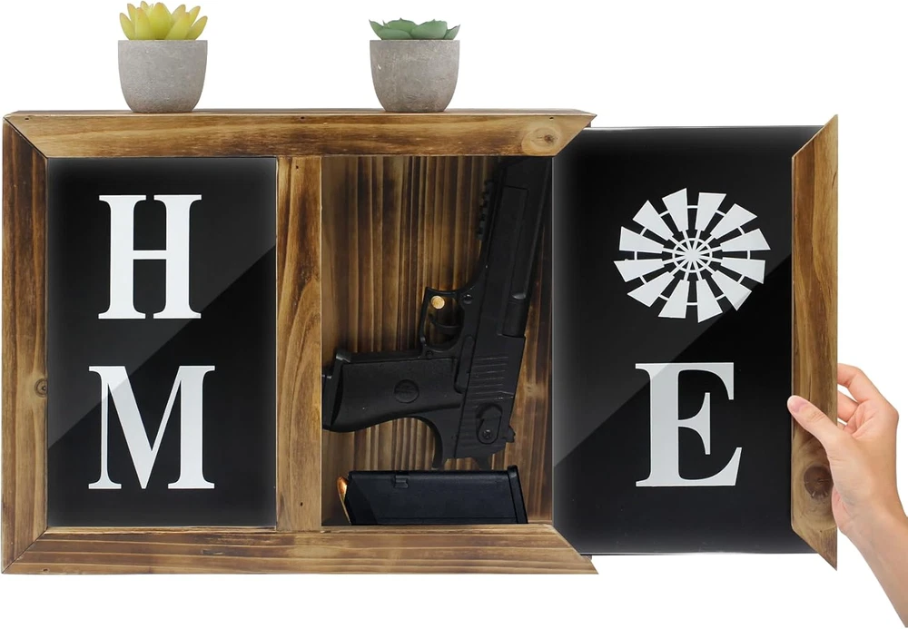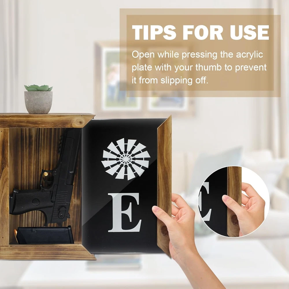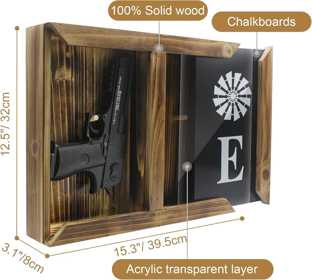 【Dual-Slot Hidden Pistol Gun Safe Storage】Made of solid wood, chalkboards, acrylic, and engraved with the word 'Home'. Open the dividers of the hand gun safes cabinet to the left or right to secretly store pistols, letters, cash, etc. 【Innovative Wall Mount Decoration 】Natural Wooden & Elegance when closing gun hidden compartment furniture, is good hideaway for handgun/pistol. Suitable for indoor bedroom living room hallway bedside and so on. Special color styles to nicely decorate your Home. Allows you to add a favorite photo or drawing to bring more meaning. Great Eye-catching gifts for men /fathers /families 【Compatibility】Suitable for holding most portable pistols. External dimensions:15.3"x12.5"x3.1"/ 39.5x32x8cm 【Non-Locking Design】 Avoid handgun concealed safe can't be opened in case of forgetting the password or losing the key. You can take out pistol in almost 10 seconds. Please press and hold the acrylic plate above wall tactical traps storage box when opening 【No Assembly Required 】 After finish drilling the wall you can enjoy your wall art (hidden safes in plain sight). Believe people will like this simple way of storing guns. Note: Please tear off the protective film on both sides of the acrylic transparent board before use Product Description HOW TO HIDE GUNS IN YOUR HOME? Unlike hidden safes that are disguised as furniture or built into walls, this shelf can be installed in any room of the house. The appearance is designed like a photo frame decoration , you can also add your favorite photos. Mount it in your bedroom, living room, office, workshop, or kitchen. Installation is simple enough. Inside, there is enough space for 2 handguns and a few small accessories. Compatible Size can be confirmed in the picture Box Size- External dimensions: 15.3"x12.5"x3.1"/ 39.5x32x8cm Tips for use Press the acrylic plate with your thumb for quick opening