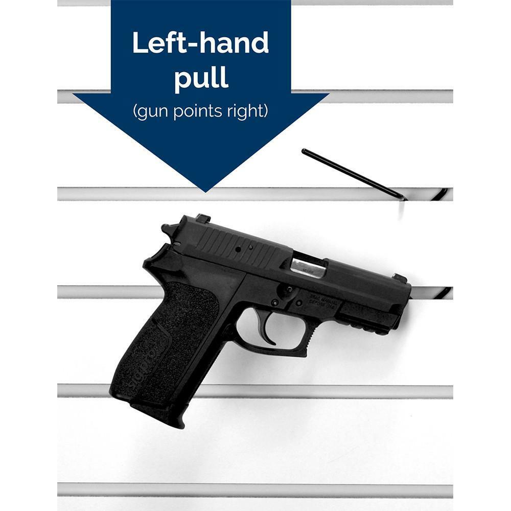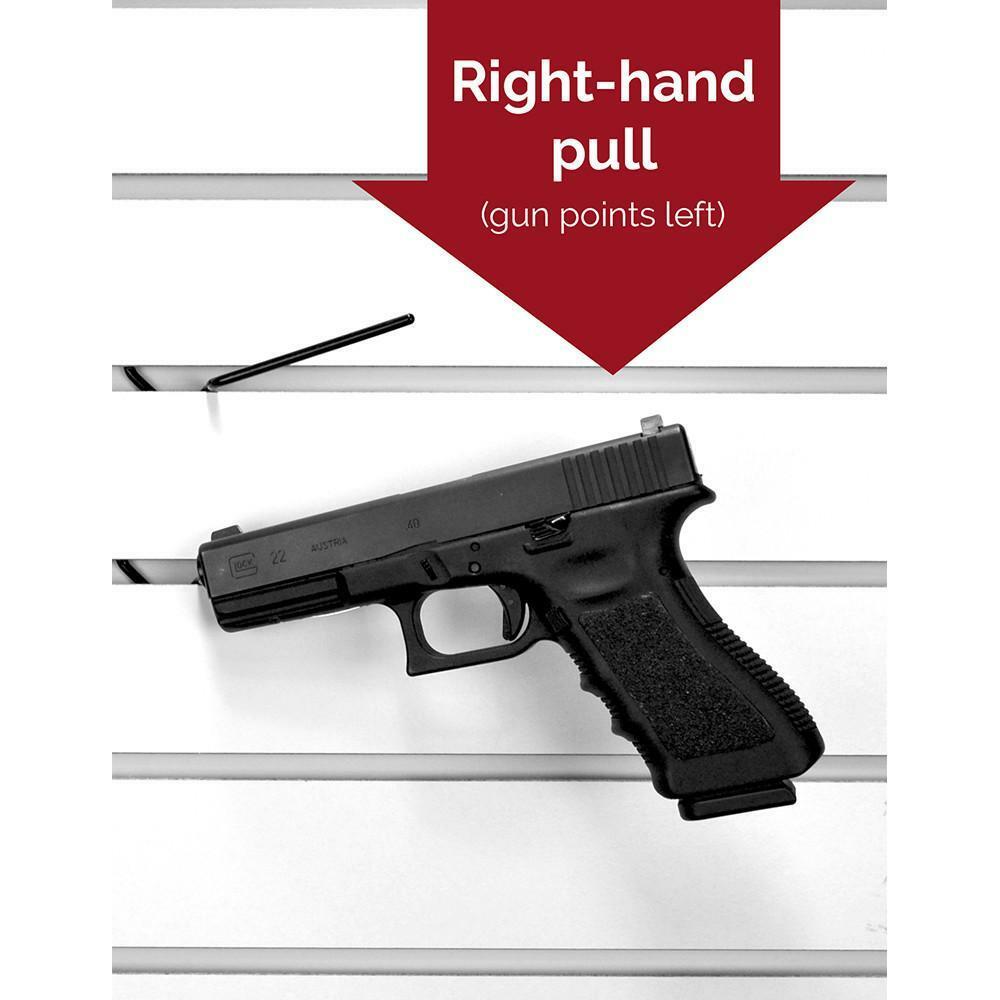 The Slatwall Snipers fit onto most** slatwall to display handguns. The simple, clean design disappears when mounted with a gun and holds the gun at an angle that is easy to access. With the ability to overlap guns on display, the Slatwall Sniper can increase the capacity of a given space. Great for use in gun shops and vault rooms. For use on fiberboard slatwall* Vinyl coated wire Fits guns as small as 22 caliber *Please Note: Some particleboard slatwall utilize metal tracks inside the slats. In this case, Snipers cannot be inserted on the face of the board. If you are able, slide the Snipers in from the edge of the board. There are several new plastic or metal slatwall brands available and we have found Slatwall Snipers do not work with: MegaWall Gladiator GearTrack Proslat