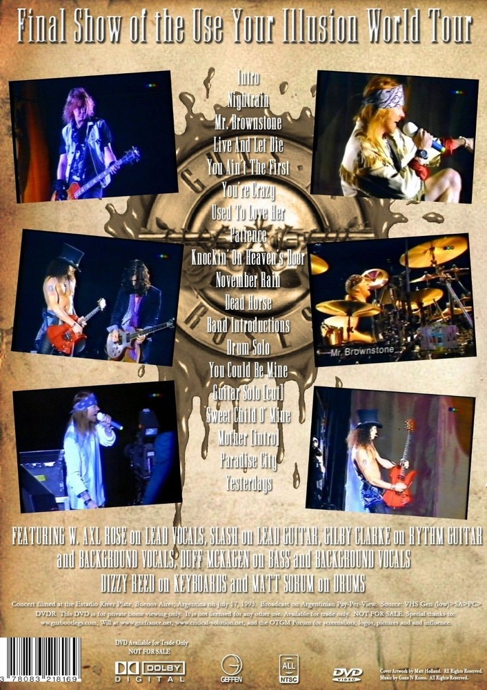 I ACCEPT PAYPAL!!! THIS IS NOT FACTORY PRESSED If after your purchase you have any problems with the item at all,please contact me first so that i take care of the matter.I offer a 100% guarantee on all my items and i will do what is needed to make sure my customers are satisfied with their purchase. THIS WAS RECORDED PROFESSIONALLY BY THE RECORD COMPANY. I HAVE INVOICES FROM WHERE I PURCHASED ALL MY ITEMS. Here is the cover for the dvd if you need it.. copy n paste the link below: https://we.tl/6ldxIl4cip 07.17.93 - Estadio River Plate, Buenos Aires, Argentina Last show of UYI tour!! Here is a sample of the show: (copy and paste into your address bar) https://we.tl/af7SsfwfVR Here are samples of the other shows i have listed: (copy and paste into your address bar) https://we.tl/HaEPBf21bB Comes in sleeve only, with color artwork emailed on request. Features full interactive menus with scene selection. Great pro shot footage and is a must for fans! set: Nightrain, Mr. Brownstone, Yesterdays, Live And Let Die, Attitude, Welcome To The Jungle, Double Talkin' Jive, Dead Flowers, You Ain't The First, You're Crazy, Used To Love Her, Patience [w/ Pinball Wizard & Imagine], Knockin' On Heaven's Door, Dust In The Wind [Intro] / November Rain, Dead Horse, Drum Solo, You Could Be Mine, Guitar Solo, Sweet Child O' Mine, Mother [Intro] / Paradise City notes: GN'R's last show on the UYI tour! This is also the last show with the 'old' lineup, which included Slash & Duff. The band jams on 'Train Kept A Rollin'' during 'Double Talkin' Jive.' A pizza is delivered onstage after 'You're Crazy' by a friend of the band dressed in a Dominos Pizza uniform. Axl does a weird dance with the delivery guy and then throws the pizza in the crowd. The delivery guy then plays bongos on 'Used To Love Her.' Axl jams on the drums during 'Pinball Wizard.' The band jams on The Beatles' classic 'Let It Be' during Slash's guitar solo. This is a Rare Collectables release.The various labels in which the dvd's have been released from only use master or 1-2 gen quality. This is the best possible recording you can find.You will not find better quality anywhere,I 100% money back guarantee that. I have a very large collection so if you are interested in anything not listed,please e-mail me and i will send you my complete listing. USA: $4.00 for the first item, FREE SHIPPING for each additional item. CANADA: 1-2 Items $10.00, 3 or more $16.00 MEXICO: 1-2 Items $12.25, 3 or more $21.25 REST OF WORLD: 1-2 Items $14.25, 3 or more $23.25 Shipping is now $4.00