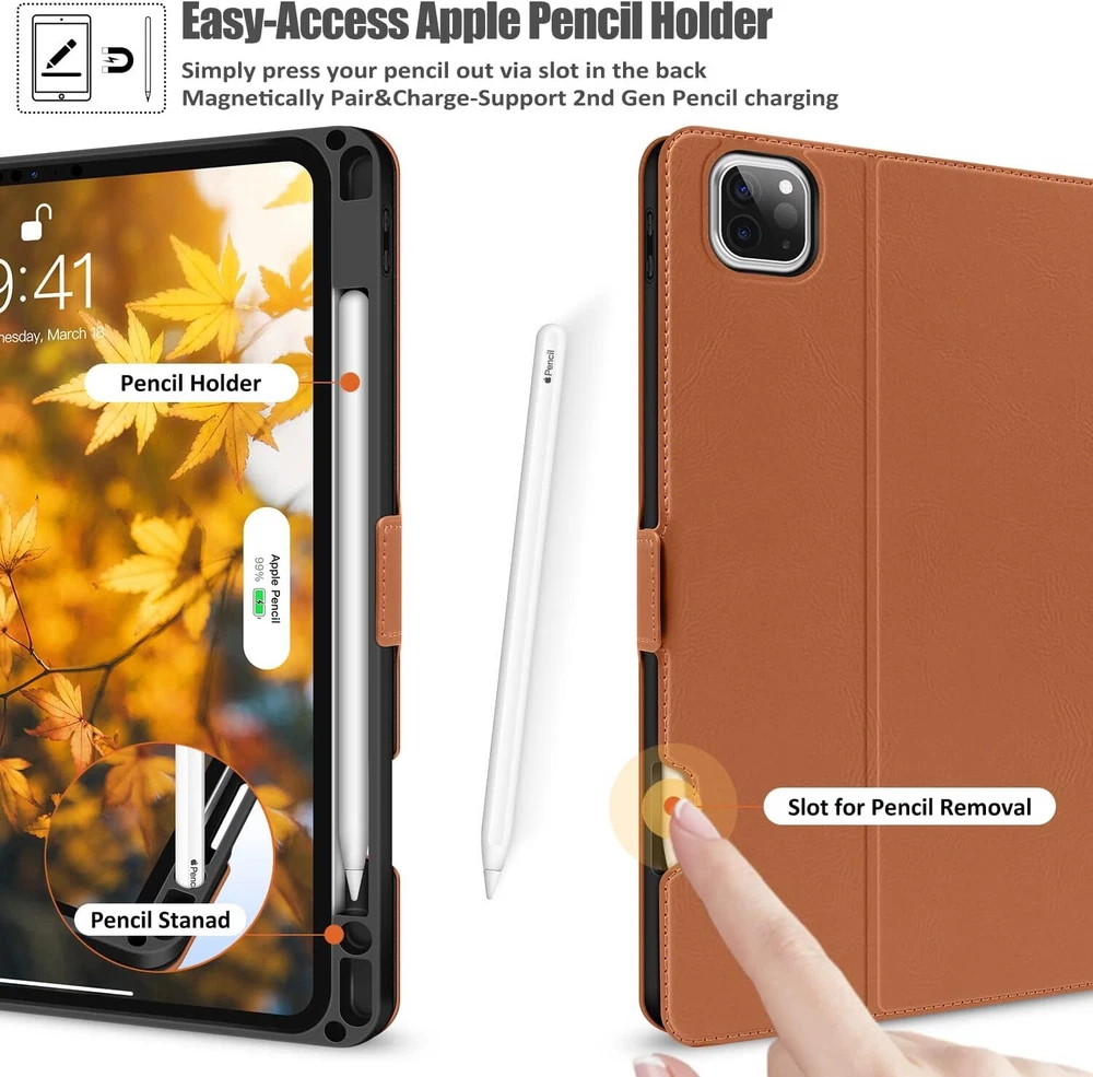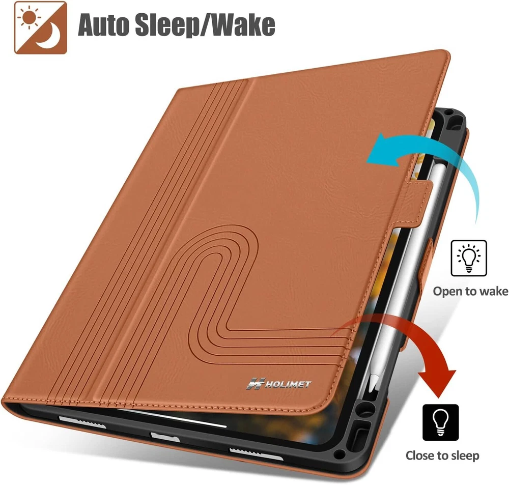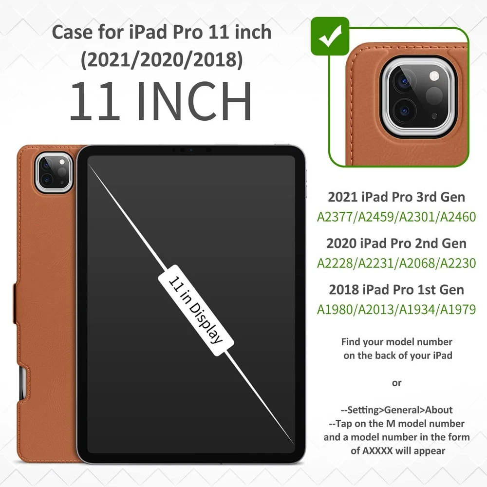 H HOLIMET Case for iPad Pro 11 Inch 2022 4th/3rd/2nd/1st Generation Brown Product Details Standing screen display size: 11 Inches Brand: H HOLIMET Color: Brown Compatible Devices: Tablets Form Factor: Cover Shell Type: Soft 【Compatible Model】Specially designed case for 2022 new iPad Pro 11 inch 4th generation (Models: A2759/ A2435/ A2761/ A2762)/iPad Pro 11 inch 3rd Generation 2021 (Model: A2377/A2459/A2301/A2460)/2020 iPad Pro 11 2nd generation(Model: A2228/A2231/A2068/A2230)/2018 iPad Pro 11 1st generation (Model: A1980/A2013/A1934/A1979). NOT compatible with any other iPad models 【Built-in Apple Pencil Holder】Tightly hold your Apple pencil, supports the Apple Pencil (2nd gen) attached with your iPad Pro 11 inch magnetically to pair and charge. [NOTE DON'T INCLUDE Apple pencil] 【Full Protection】 Premium synthetic leather exterior, flexible TPU soft back cover firmly hold on your ipad, install & remove easily without effort. Durable protect your iPad Pro 11" from scratches and bumps 【MULTI-Angle Viewing &Typing】Anti-slip interior material and deep grooves make the iPad stand securely at three different angles. No slips! Convenient stand position for watching movie or typing 【Magnet Closure Design & Auto Sleep/Wake】Magnetic smart cover supports auto wake & sleep function. And the small magnet clasp keep your iPad closed better for power reduction no need to worry about sudden open