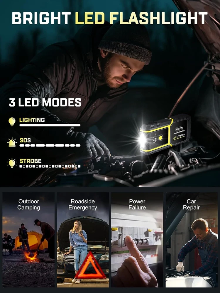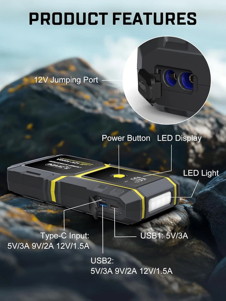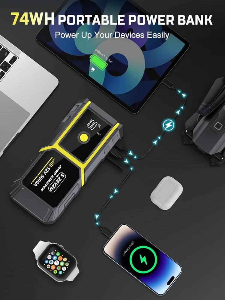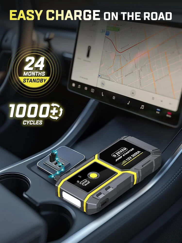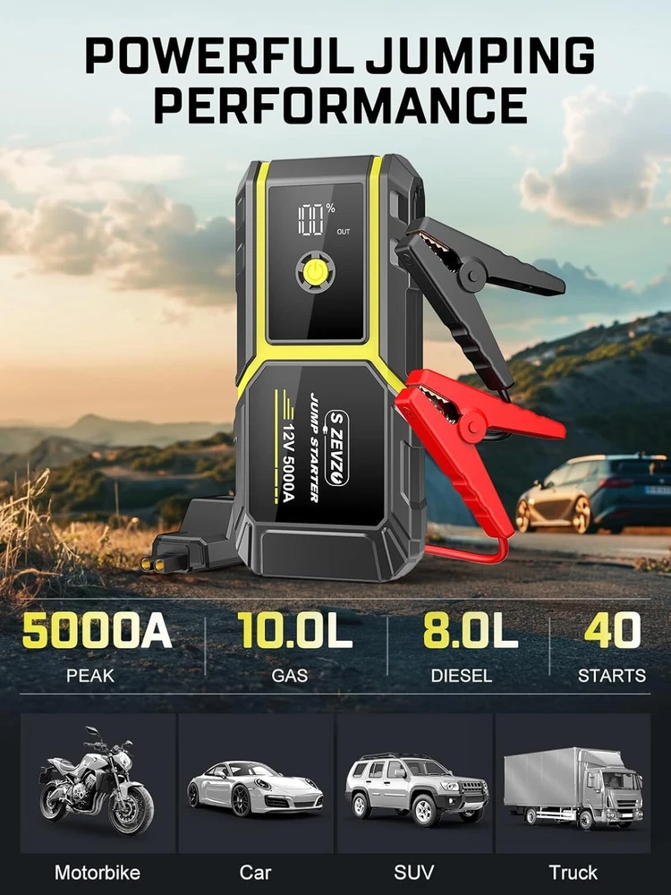 H021 Car Jump Starter, Peak 5000A Jump Starter Battery Pack for Up to 10.0L Gas and 8.0L Diesel Engines, 12V Portable Jump Box with LCD Display, 3 Modes Flashlight and Protective Carrying Case Product Details Brand: S ZEVZO Product Dimensions: 1.5"D x 4.7"W x 11.1"H Item Weight: 1.8 Pounds Amperage: 5000 Amps Peak Output Current: 5000 Amps Manufacturer: Dongguan Junlin Technology Co., Ltd. Model: H021 Item Weight: 1.79 pounds Item model number: H021 Batteries: 1 Lithium Ion batteries required. (included) Manufacturer Part Number: H021 Bulb Type: LED with 3 Modes(Flashlight, SOS, Strobe) Special Features: 74Wh Large Battery Capacity Power Bank: easily charge your electric devices with the two USB output ports., Strong Jumping Performance: Car Battery Jump Starter with 5000A Peak current for up to 10.0L Gas and 8.0L diesel engines; 10 Intelligent Protections: comprehensively protect your car from any damage; 500 Lumens LED Flashlight with 3 Lighting Modes: Solid, Strobe, SOS; Battery Life: 1000+ Cycles; Standby Time: More than 24 Months; Wide Compatibility: starts most 12V lawnmowers, motorcycles, cars, pickup trucks, ATVs, UTVs, and yachts in just minutes. Brand: S ZEVZO Product Dimensions: 1.5"D x 4.7"W x 11.1"H Item Weight: 1.8 Pounds Amperage: 5000 Amps Peak Output Current: 5000 Amps Battery Cell CompositionVoltage: Lithium Ion12 Volts Vehicle Service TypeBattery Capacity: Passenger Car, Motorcycle, Van, All of the above, UTV, Truck, Lawn MowerPassenger Car, Motorcycle, Van, All of the above, UTV, Truck, Lawn MowerPassenger Car, Motorcycle, Van, All of the above, UTV, Truck, Lawn Mower See more 20000 Milliamp Hours OUTSTANDING JUMPING PERFORMANCE: With a peak current of 5000A, this jump starter can start almost all common 12V vehicles with up to 10-liter gas and 8.0-liter diesel engines. It can jump-start at most 40 times on a single full charge, and it is perfect for lawnmowers, motorcycles, cars, pickups, snowmobiles, ATVs, UTVs, and small trucks. 74Wh PORTABLE POWER BANK: This portable jump box also has a battery capacity of 74Wh that can be used as a backup power bank to charge your phones, tablets, and other USB port digital devices. It is designed with two USB outputs (5V/3A) and (5V/2.1A) that can be applied simultaneously for charging, 50% faster than a standard charger. 10 COMPREHENSIVE SAFETY PROTECTIONS: This jump starter battery pack is designed with 10 intelligent safety protections and is safe to use, including short-circuit protection, reverse connection protection, high-temp protection, low-voltage protection, and the like. There will be a beep sound and indicator light signs from the smart jumper clamps when facing an error. VERSATILE JUMP STARTER WITH BONUS FEATURES: This H021 car jump starter can work as a 500-lume LED flashlight to provide light in darkness or other emergencies with three choosable light modes( stable, strobe, and SOS). More features are accessible on this jump starter such as a Type-C input charging port, 24 months long standby time, dustproof and water-resistant, and a working temperature from -4℉ to 140℉. WHAT YOU GET & SERVICE: The package includes 1 * SZEVZO H021 Jump Starter, 1 * Smart Jump Clamps, 1 * USB Type-C Charging Cable, 1 * Storage Case, and 1 * User Manual. This jump starter is covered by our 12-month service, so please contact us freely if you have any questions when using this jump box.