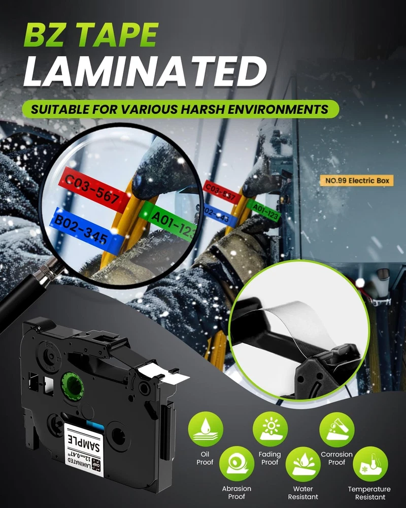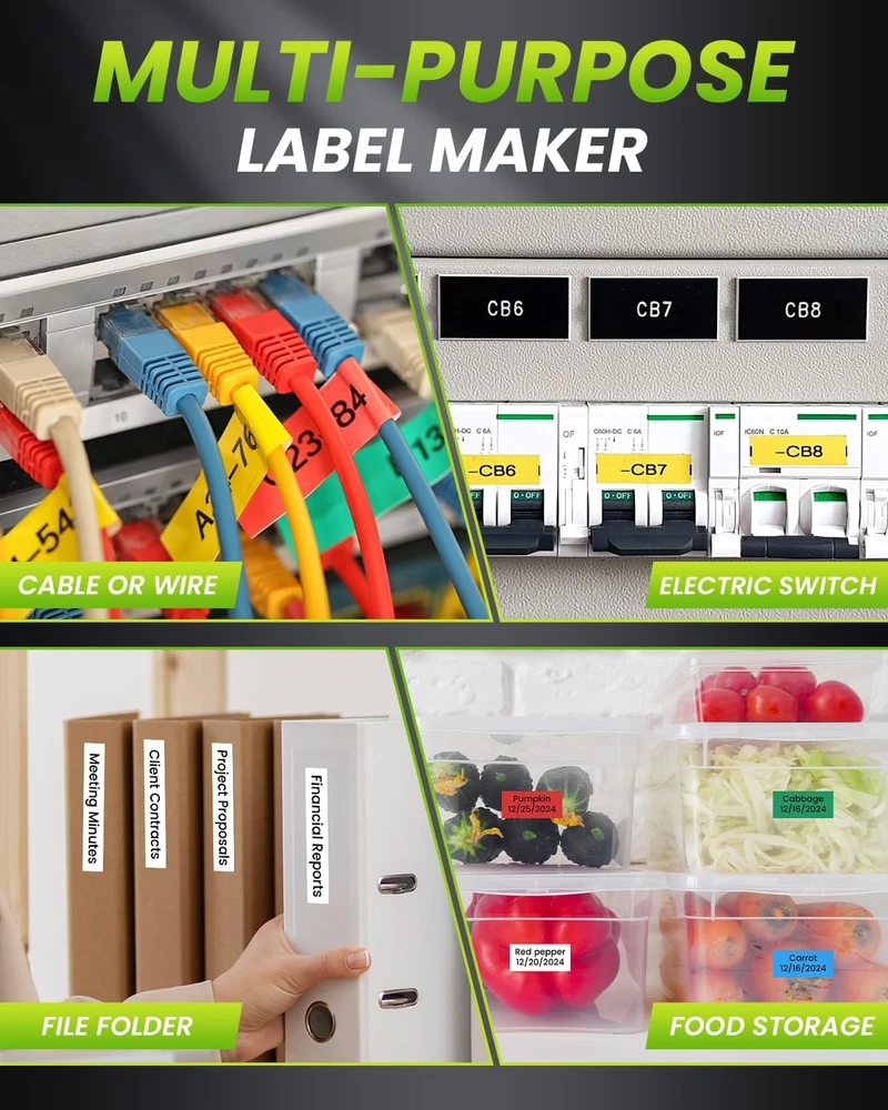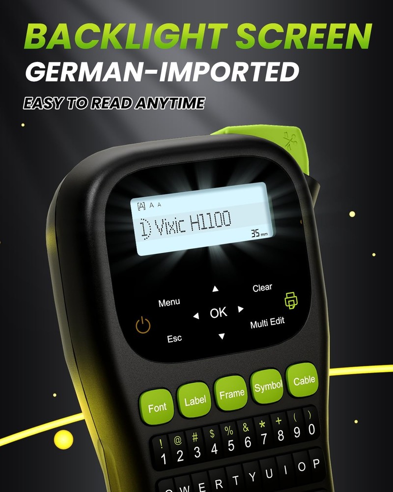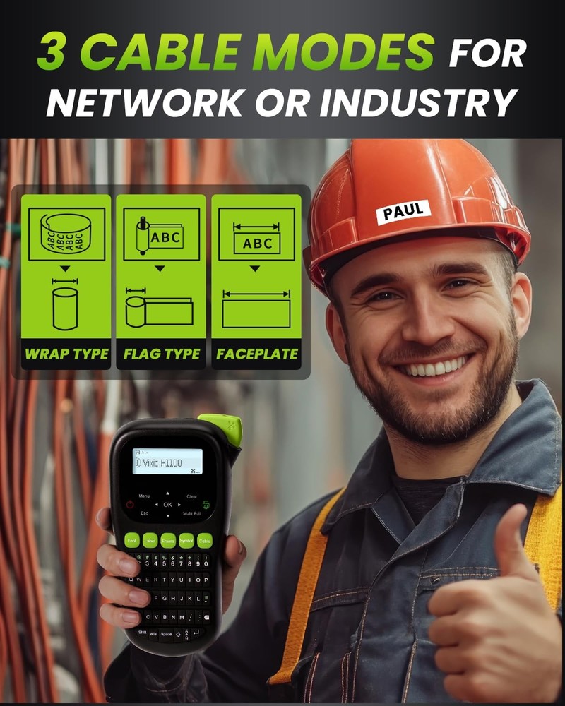 If home, office, school, personal items, cable organization is important to you, this easy to use label maker machine with tape is an exceptional choice. Eliminate the hassle of connecting mobile devices: Simply pick up the H1100 portable label maker and start using it. Lightweight (less than 1 lb) and ergonomically designed, it fits comfortably in your hand and this handheld label maker is easy to carry anywhere. Save time on learning about connecting and enjoy peace of mind without worrying about personal information leaks The H1100 label maker features a QWERTY keyboard that you can type out the label faster. With built-in backlighting LCD Screen, you can see clearly what you’re typing, LCD display is readable at night. There are several features built into this lable maker that help users create labels customized by selecting from 16 fonts, 100+ frames, and more than 800 symbols. The H1100 label maker machine is used widely in food date marking, food jars, files, folders, shelves, books, cabinets, storage boxes, school name labels, school supplies, personal item identification and more. The useful cable label maker featuring help you easily organize your wires and cables. This industrial label maker can produce flag type labels and wrap type labels for wires. H1100 labeler is featuring Multiple Editing, that can type and print up 20 different labels each time. It prints up to 4 lines of text on labels up to 12mm or 0.47 1/2 inch wide. The H1100 label maker printer also has a memory feature that allows you to save up to 9 labels for quick reprinting tasks. H1100 labeler machine with tape work with 3 different widths laminated label tape: 6mm 1/4", 9 mm 3/8", and 12 mm 1/2". H1100 label maker tape is durable and easy to peel. 12mm 0.47 Inch laminated white tape is popular. No sticky residue remains when the labels are removed. Water resistant, temperature resistant, abrasion resistant, chemical resistant and fading resistant, good for indoor or outdoor use. Enhanced Readability with Backlight Screen: The H1100 portable label maker, equipped with a German-imported backlit LCD screen, offers effortless visibility of typing content in low-light conditions. Enjoy using this handheld label maker even at night Added Value of Included USB TYPE-C Cable for Power: The H1100 label maker machine comes with a complimentary USB-C cable for power, eliminating the extra cost of purchasing a separate and traditional AC adapter. In addition, you can opt for the optional 6 AAA batteries (not included) to stay powered for on-the-go usage Save Labels Design: H1100 label maker with keyboard offers multiple editing functions and narrow settings, allowing you to easily edit up to 20 different labels. Press Shift + "Print" graphics can copy up to 9 labels. With 13.1 feet sample tape length, the labeler enables efficient printing of 132 labels (1.2 inch per label), saving up to 5.4 feet of blank labels Industrial Label Maker Supports Cable Modes: The H1100 cable label maker has a built-in cable wrap, cable flag, and faceplate keys, access 16 fonts and over 800 symbols to customize your labels in your worksite or workspace. This label maker with tape can print up to 4 lines of text on labels up to 12mm 0.47 inch wide, providing great convenience in organizing and managing cables or wires Label Maker Waterproof Labels: label maker machine with tape features a high-performance laminate layer that ensures exceptional durability and protection. Available in 3 widths (6mm, 9mm, 12mm) of BZ laminated tapes in store, that can easily resist abrasion, water, fading, temperature extremes, and corrosion, providing clear and legible letters for up to 10 years. Perfect for workshop, electrical or tough labeling needs in industrial environments