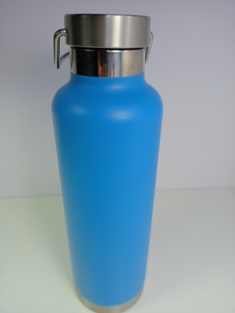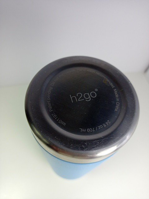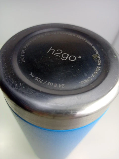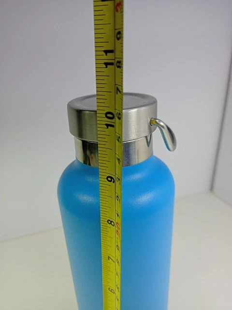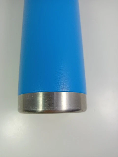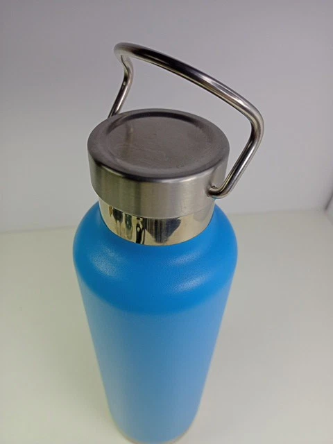 This looks like it was never used. The inside is clean with no water spots. The outside has no scratches. There was a Christmas sticker on the bottom. It may have been a gift. Beautiful turquoise blue unlike the photo. Textured surface for easy grip. Stainless Steel lining and top. 24 ounces.