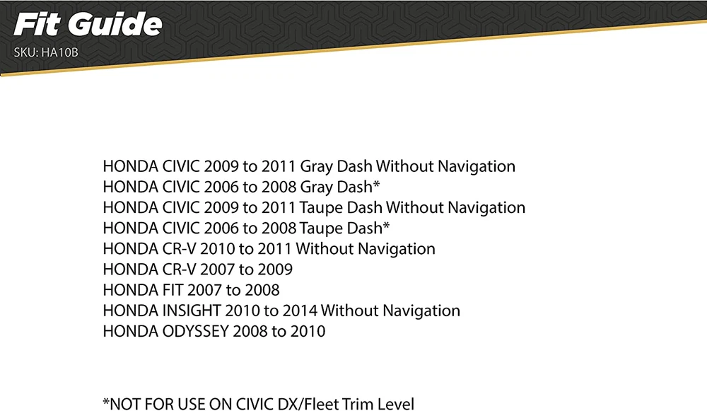 HA10B Compatible with Select 2006-14 Honda Vehicles Wire Harness Convenient Solution - Scosche HA10B Radio Installation Harness with allows a new aftermarket radio to be installed in select Non-Amplified 2006-14 Acura and Honda vehicles using the factory radio harness. Precision Fit - See Fit Guide and Notes in images to verify that your vehicle is compatible with this harnesses. Some vehicles have limited compatibility based on the trim level. Not compatible with Factory Amplified systems. Easy Installation - Designed for easy installation without cutting any factory wiring. It simplifies the process of replacing your factory radio with an aftermarket radio using industry standard color coded wires. Superior Quality - Made to last, this wiring harness is crafted with factory quality materials, ensuring a safe and secure connection for long-term performance. Industry Compliant - EIA industry standard color coded wires for an easier installation. Each wire is individually labeled for easy identification. Trusted Brand - Backed by Scosche's Limited Lifetime Warranty and Lifetime Tech Support. Scosche, known for its commitment to quality car audio solutions, means you can trust the Scosche HA10B Radio Harness to deliver exceptional performance. Product Description Whether you're looking for a double din car stereo, a car stereo with Bluetooth, or a touchscreen car radio, our comprehensive range of car audio accessories, mounting kits, and head unit installation kits has you covered. SCOSCHE INDUSTRIES Founded in 1980, SCOSCHE runs on our passion for cool vehicles, amazing sounds, the great outdoors, travel, motorsports, horsepower and voltage. We're a company of gear-heads, drivers, surfers, racers, riders, tech buffs, tech users, innovators, and relentless pursuers of perfection. Discover the perfect fit for your car audio and video needs with our comprehensive Fit Guide. Whether you're looking for a double din car stereo, an interface, a wire harnesses, antennas, speaker adapters and more, our guide provides all the essential information and products you need. From head unit installation kits to wire harnesses, our wide range of car audio accessories and mounting options ensures a seamless and professional setup. Easy to Install Experience the convenience of easy installation with our selection of car audio and video accessories. Our car stereo installation kit and mounting options make upgrading your vehicle's entertainment system a breeze. From double din kits, interfaces, wire harnesses, antennas, speaker adapters and more, we have everything you need to enhance your car audio experience. Factory Quality Experience factory-quality excellence with our range of car audio and video components. Whether you're seeking a double din car stereo, car radio touchscreen options, our products meet the highest standards of quality. We offer car stereo installation kits, interfaces, wire harnesses, antennas, speaker adapters and more, to ensure your car audio system is professionally integrated. Precision-Designed Experience precision-designed perfection with our comprehensive array of car audio and video solutions. Whether you seek a double din kit, a stereo interface replacement, a stereo harness or antenna adapters, our products are meticulously crafted for flawless integration. Our range of product options ensure your car audio system is seamlessly installed. Factory Matched Finish Achieve a factory-matched finish with our range of car audio and video products. Whether you seek a double din kit, stereo interface replacement, wire harness or antenna adapter, our products are meticulously crafted for a seamless appearance. Our car stereo install and dash kits ensure your car stereo integrates perfectly with your vehicle's interior. Easily Install an Aftermarket Stereo with High-Quality ABS Kits Enhance your car audio experience with our top-notch car stereo installation kits. Whether you're looking to install a double din car stereo or need a mounting kit for your car radio touchscreen, our range of product options ensure a precise fit and hassle-free installation. 4.0 inches x 6.0 inches x 0.5 inches. Weight: 0.634 oz Item model number HA10B Global Trade Identification Number 00033991015524 Item dimensions L x W x H 6 x 4 x 0.5 inches Material Wire, Connectors Color multi Cable Type Flat Ribbon Country of Origin China Connector Type IDC Style Wire Harness Only Item Weight 0.634 ounces Department car accessories Is Discontinued By Manufacturer No Product Dimensions 6 x 4 x 0.5 inches Whats in the box Wire Harness^Manual Other display features Car Audio or Theater