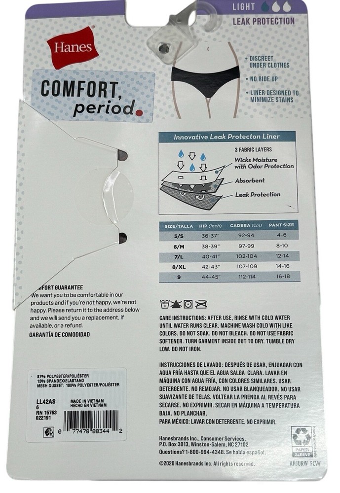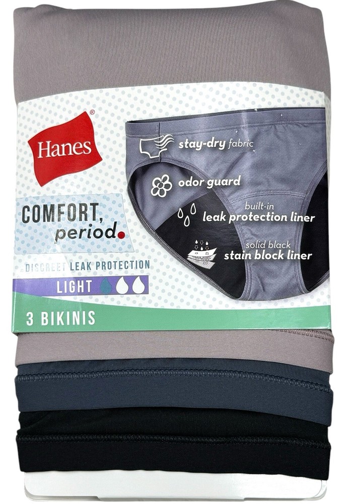 HANES Women’s Period Comfort 3-Pack Bikini Underwear Black Grey Light Size 6/M New 3-Pack Women’s Size Available: MEDIUM/6 Color: Black Tan Grey Leak Protection: Light Description: 87% Polyester 13% Spandex Mesh Gusset: 100% Polyester Retail Price: $30+ Tax Machine Washable Imported