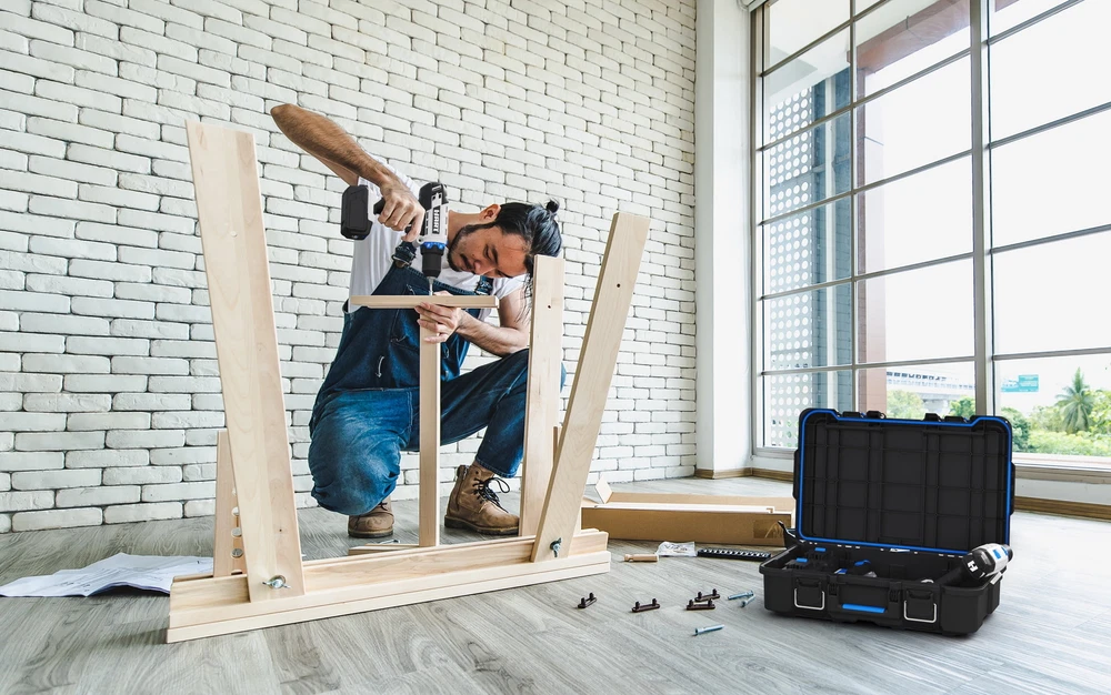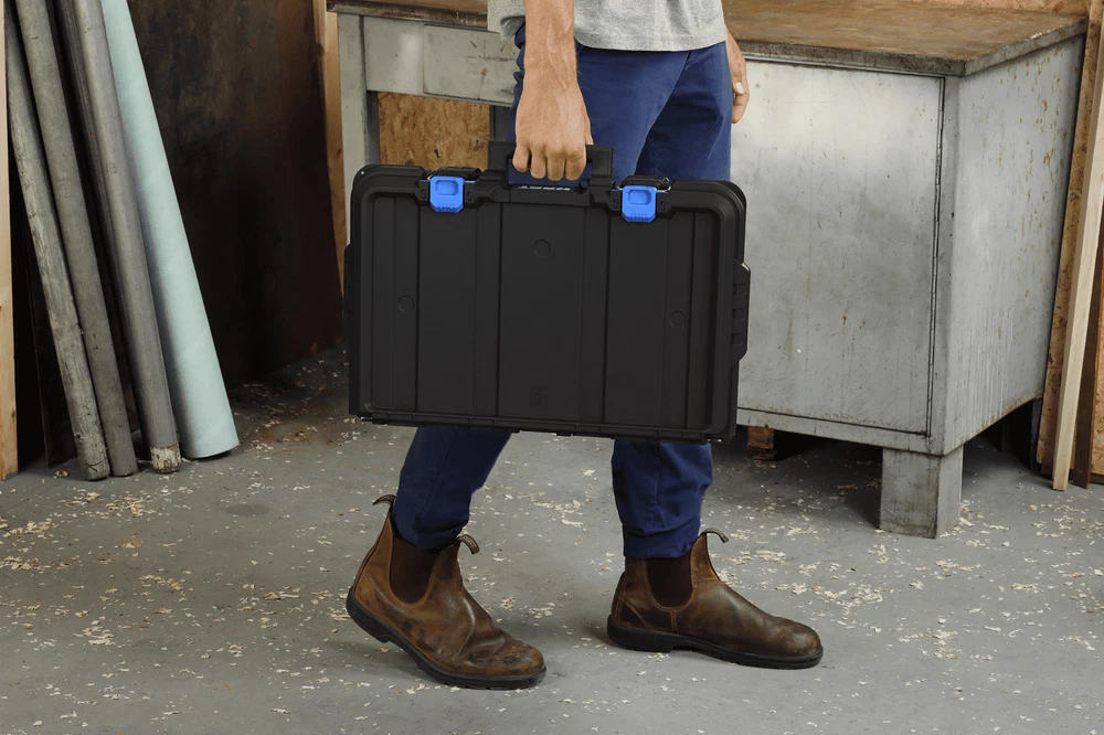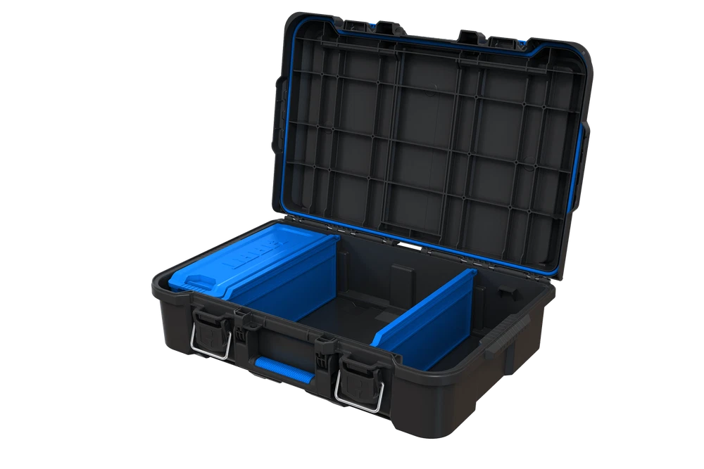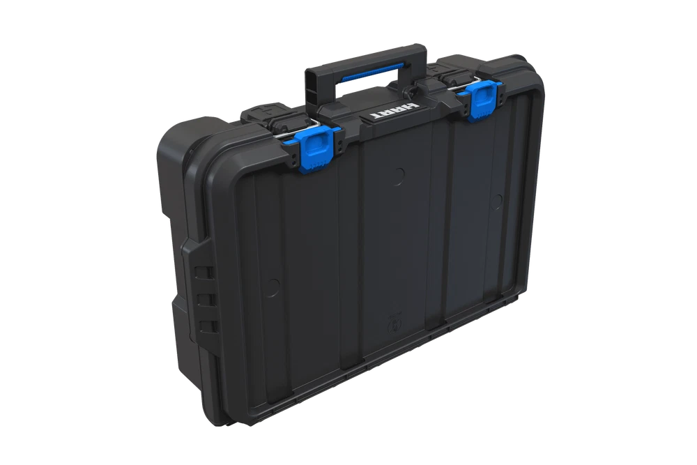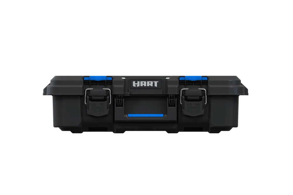 Are you looking for a power tool case that offers custom protection for your power tools or hand tools: Hart knows better than anyone that power tools and hand tools come in all shapes and sizes. The Hart suitcase style tool box with the blue tool and parts organizer can be customized by adding foam filling inside the case to match the exact shape of your specific parts, tools, blades, markers, brushes, paints, or whatever else you want held in place (foam not included). Keeping your tools in great shape has never been more personal! Hart Stack System Power Tool Case with Small Tool Blue Internal Case with Blue Dividers, Mobile Tool Storage and Organization, Black with Blue Accents Features: Ideal case for weekend warriors, home DIY-ers and serious crafters Serves as a Power Tool Case, and allows you to customize foam filling for your specific power tools or accessories (Note: foam is not included in the product) Ergonomic carry handle for convenient portability IP54 seal protects your tools from dust, moisture, and accidental contact with water – making it ideal for outdoor use Durable plastic construction defends contents from dings and knocks Metal latches securely fasten the case at all times, especially when you're on the move The HART Power Tool Case has an opening for you to insert a padlock keeping your belongings safe from theft (lock not included) Internal blue small tool organizer case and dividers keep your hardware and small tools handy. Keep your small parts tidy & handy with a movable organizer case & 2 dividers included. The organizer can either be clipped inside for internal storage or stacked on top of the case for easy access. Can be easily stacked onto any of the storage units within the HART Stack System Load Capacity - 47.5 LBS