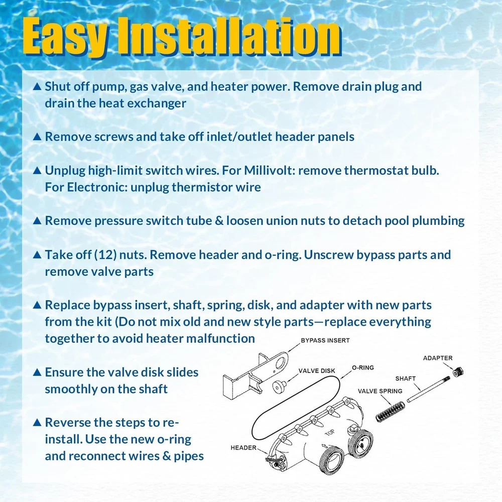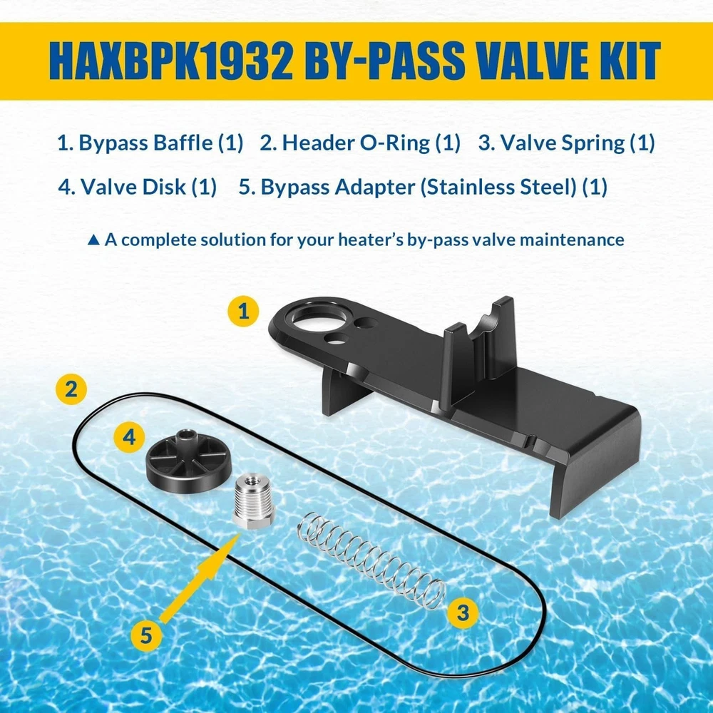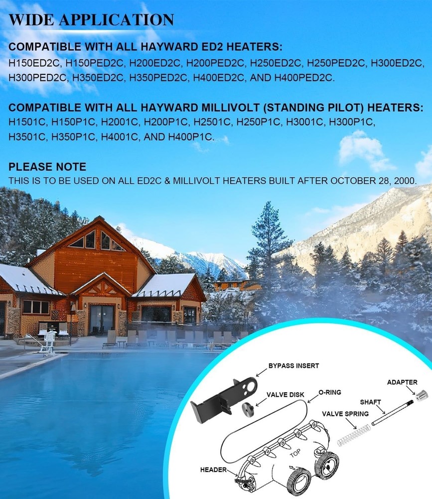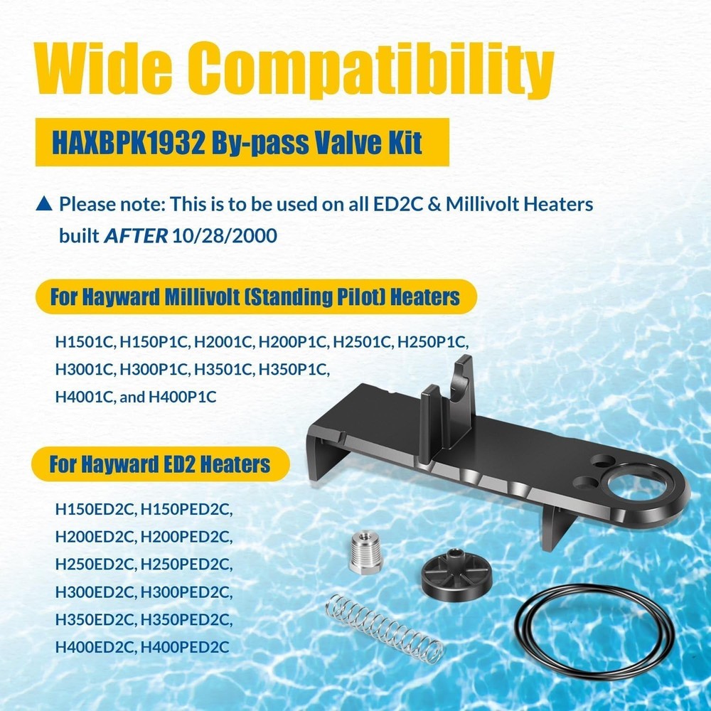 HAXBPK1932 by-Pass Valve Kit For Hayward Millivolt/Electronic ED1 Pool Heaters Wide Application Compatible with ALL Hayward ED2 Heaters: H150ED2C, H150PED2C, H200ED2C, H200PED2C, H250ED2C, H250PED2C, H300ED2C, H300PED2C, H350ED2C, H350PED2C, H400ED2C, and H400PED2C. Compatible with ALL Hayward Millivolt (Standing Pilot) Heaters: H1501C, H150P1C, H2001C, H200P1C, H2501C, H250P1C, H3001C, H300P1C, H3501C, H350P1C, H4001C, and H400P1C. Please Note This is to be used on all ED2C & Millivolt Heaters built after October 28, 2000. Powerful Function A failing By-Pass Valve can lead to reduced heating efficiency, overheating risks, or even system damage. This kit provides a direct replacement to restore reliable operation, restores proper water flow, enhances system stability & efficiency, eliminates abnormal noises. Superior Material Made of premium PVC material, it has excellent corrosion resistance, it has a lightweight structure and is relatively simple to install, significantly reducing labor and material costs. The system has excellent sealing performance, effectively preventing fluid leakage and ensuring safe and stable operation. Package included 1 * HAXBPK1932 by-Pass Valve Kit. This package includes: baffle, valve spring, valve disk, adapter, O-ring. This HAXBPK1932 By-pass Valve Kit designed to address common issues in heating systems. Payment Delivery details Returns Contact us Payment 1. All major credit cards are accepted through our secure payment processor Payoneer . 2. Please make sure your Shipping address is correct before you pay, cause it cannot be changed once the order shipped out. Delivery details Please read the shipment and payment detail carefully before you bid. Returns 1. Return to us within 60 days from the delivery date for exchange or refund. Refund will be given as Money back or item exchange (buyer's choice). 2. Return shipping fee is the responsibility of buyer unless the return is a result of our mistake. 3. If you need return, please contact our customer service representative, let us know the detailed problem and send us some pictures for confirmation. Contact us We apologize for the late reply during the holidays.Please contact us via ebay using" Contact member ". We will respond within 1 business day or less. Please include your ebay item number or order number in all communications.