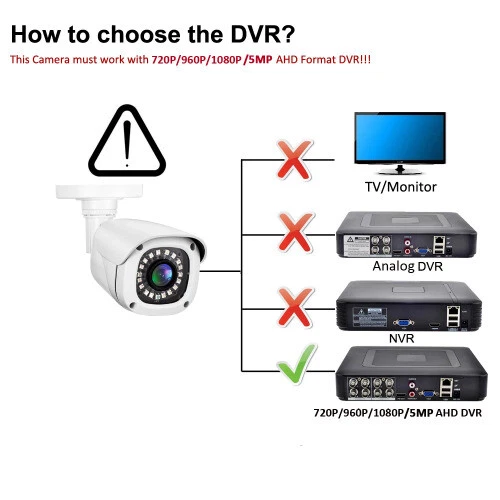 NOTE:This is AHD Camera , AHD Camera must use AHD DVR to make it working ! Don't support Analog DVR /NVR, it cann't directly connect to the TV/LCD monitor,please take notice !!! Why AHD? As the industry moves from standard definition to high definition, how can we ensure the whole surveillance system not only satisfies the resolution requirement, but also the total cost? Super Video Technology presents Analog High Definition(AHD) technology to the market. AHD is an over-coaxial-cable analog HD video transmission standard, allowing long-distance HD transmission at a lower cost to meet the requirements for a complex and large installation. How AHD can be beneficial to us? • Upgraded to analog HD seamlessly with Low-cost and simple installation value-added solution. Go after the conventional analog system topology and give a full consideration to users’ operation habit. • Megapixel & uncompressed image quality. • Long range & non-latency reliable video transmission without additions of relay devices. • Strong anti-interference capability & solid interface protection. Free of high-frequent electromagnetic radiation; constant signal transmission and display without problems as frame drop and lock loss occurred. • An open analog HD transmission system established and evolved industry chain developed to sustainably improve the technical standard. High Quality Night Vision Smart Infrared Cut Filter (ICR) Camera has a very good night image quality. Infrared Cut Filter to ensure the highest quality images - day and night. Waterproof Security Camera Camera can suit for both outdoor and indoor usage. Suitable for a variety of places Locate incident Video with Smart Playback You can freely playback to any specific moment on the timetable of your recordings and enjoy it on a beautiful intuitive interface Ceiling and Side Very important!!! This is AHD Camera , AHD Camera must use AHD DVR to make it working ! Don't support Analog DVR /NVR, it cann't directly connect to the TV/LCD monitor,please take notice !!! Description 1. AHD 720P,1080P,5MP 2. 2.8mm,3.6mm,6mm HD lens optional 3. Color CMOS Sensor, ICR 4. ABS plastic housing,bullet camera outdoor indoor use 5. 18pcs IR leds light , 5-25M Max IR distance Model AHD 720P,1080P,5MP Sensor CMOS sensor Minimum Illumination Color:0.01Lux,(F1.2,AGC ON),0Lux with IR Black & White:0.001Lux,(F1.2,AGC ON),0Lux with IR Photosensitive Resistance 1 photosensitive resistance interface, support the photosensitive resistor input signal and image, IR-CUT, infrared lamp linkage Shutter 1/50(1/60) seconds to 1/10,000 seconds Day and Night Function Support IR-CUT Infrared light 18pcs IR Leds Lens 2.8mm/3.6mm/6mm/8mm Synchronous Mode inter-sync Noise-signal Ratio >58dB Temperature and Humidity - 10’C ~ 60’C, humidity is less than 90% (no condensation) Power DC12V±10% Consumption <5W Dimension 16.6*6.5cm Housing material ABS plastic Packaging included: 1xAHD Camera(DC 12V Power supply not included) Note:if you buy AHD 5MP camera, make sure your DVR is AHD 5MP DVR. AHD camera must be connected to AHD DVR, not analog 960H DVR or TV monitor directly. Warm Note: If you need AHD 5MP DVR(can support AHD 5MP/4MP/3MP/1080P/960P/720P), please click the picture to buy. Payment Delivery details Returns Contact Us Feedback Payment 1.We accept PayPal only. 2.Payment must be received within 7 business days of auction closing. 3.We ship to your eBay or Paypal address. Please make sure your eBay and Paypal address is correct before you pay. Delivery details We try our best to ship out same day for payment cleared before 5.00 PM (Pacific Time) , Order placed on weekend or holiday will be shipped on Monday or next working day. Below is the approximate delivery time to different countries (just estimated, not guaranteed): 7-25 working days to buyer in USA. Returns 1.We offer 30 days return policy. Please contact us within 30 days from the date you receive your order if you have any issues with the product and want to return. 2.All items must be returned in the original packaging and you must provide us with the tracking shipping number, specific reason for the return, and your eBay ID. 3.We will refund you FULL WINNING BID AMOUNT, upon receipt of the item in its original condition and packaging with all components and accessories included, AFTER BOTH Buyer and Seller cancel the eBay transaction. Or, you can choose to get a replacement. Contact Us All communication is done through EBAY MESSAGES ONLY. If any question, please feel free to contact us via "Ask seller a question" or "Contact Seller",We try our best to reply to your emails as soon as possible, due to high volume of daily incoming emails and time zone difference, we may not be able to reply your emails immediately. Please allow 1-2 business days for us to response. Feedback Feedbacks: When you receive the item and satisfied with the product, please leave us positive feedback. If for any reason you are not satisfied with your purchase from us, please contact so we can get to work and resolve this issue for you. Please don't leave neutral or negative feedback without giving us an opportunity to try and make it right. Our goal is to ensure a happy shopping experience with us. Your Positive feedback is very much appreciated!