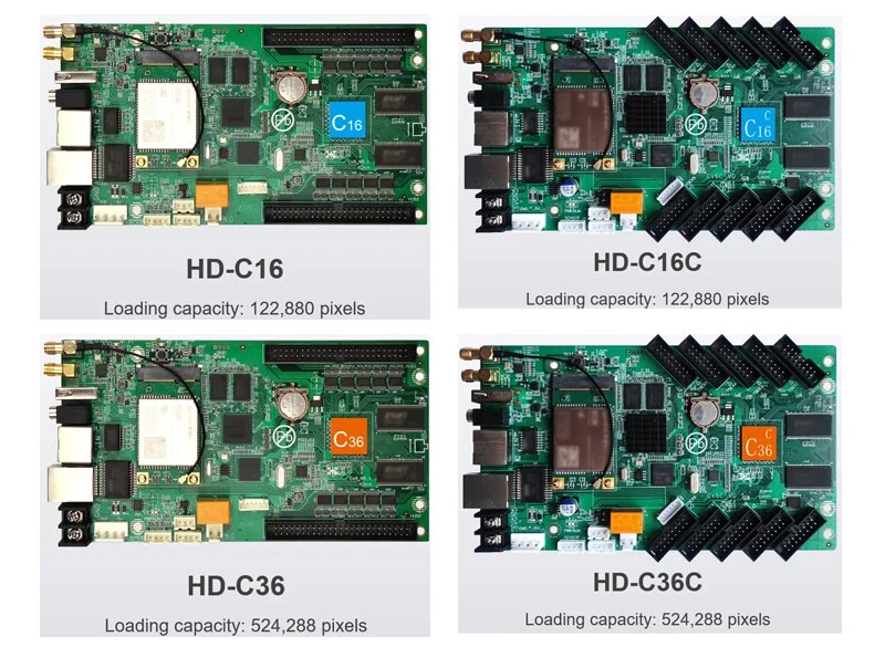 Controller Features: Control Range: (HD-C16/C16C) 122,880 pixels, HD-C36/C36C 524,288 pixels 4GB memory, support expending memory by U-disk. Support HD video hardware decoding, 60Hz frame rate output. Support widest 8192 pixel, (HD-C16/C16C) Highest 512, (HD-C36/C36C) Highest 1024. No need set IP address, it could be identified by controller ID automatically. Unified management of more LED display through Internet or LAN. Equipped with Wi-Fi function, Mobile APP management directly. Equipped with 3.5mm standard audio interface output. Meanwhile support to add 4G networking module connect to Internet (Optional). Equipped with (HD-C16/C16C)2 lines 50PIN HUB port, (HD-C36/C36C)10 lines HUB75E port, can be used for one receiving card. Equipped with 1 group of relay module, support switch on/off power supply directly remotely. Controlling System Configuration Product Type Functions Async controller Card HD-C16/C36 Asynchronous core control panel, with storage capabilities, can be connected to the screen modules, with 2 lines 50PIN HUB port. HD-C16C/C36C Asynchronous core control panel, with storage capabilities, can be connected to the screen modules, with 10 lines HUB75E port. Receiving Card R Series Connected with screen, Showing program in Screen. Control Software HDPlayer Screen parameters setting, edit & send program etc. Note: Supported computer software HDPlayer, mobile phone control software LedArt and HD Cloud Platform. Control Mode: 1. Internet unified management: The play box can be connected to the Internet through 4G (optional), network cable connection, or Wi-Fi Bridge. 2. Asynchronous one-to-one control: Update programs by network cable connections, Wi-Fi connections or USB flash drives. LAN (cluster) control can access the LAN network through by network cable connection or Wi-Fi Bridge. NOTE: HD-C16/HD-C36 match Hub board to make the screen working, If need, please buy it for this link: https://www.aliexpress.com/store/product/Hub-Transfer-board-hub75E-usage-for-huidu-full-color-led-controller-C10-C30-A30/103659_32842515318.html?spm=2114.12010612.0.0.289c972bYzjJ9E System Function List Item C16 C16C C36 C36C Module type Compatible with indoor and outdoor full color and single color module Support conventional chip and mainstream PWM chip Scan Mode Static to 1/64 scan mode Control Range 384*320, widest 8192, highest 512 1024*512, widest 8192, highest 1024 Gray Scale 256-65536 Basic functions Video, Pictures, Gif, Text, office, Clocks, Timing etc. Remote, Temperature, Humidity, Brightness etc. Video format Support 1080P HD video hardware decoding, direct transmission, without transcoding waiting. 60Hz frame frequency output; AVI, WMV, MP4, 3GP, ASF, MPG, FLV, F4V, MKV, MOV, DAT, VOB, TRP, TS, WEBM, etc. Image Format Support BMP, GIF, JPG, PNG, PBM, PGM, PPM, XPM, XBM etc. Text Text editing, Image, Word, Txt, Rtf, Html etc. Document DOC, DOCX, XLSX, XLS, PPT, PPTX etc. Office2007Document format. Time Classic Analog clock, digital clock and of clock with image background. Audio output Double track stereo audio output Memory 4GB Flash memory; Indefinite expanding of U-disk memory. Communication Ethernet LAN port, 4G network (optional), Wi-Fi, USB. Working Temperature -20℃-80℃ Port INPUTS: 5V DC*1, 100 Mbps RJ45*1, USB 2.0*1, test button*1, sensor port*1, GPS port*1. OUT:1Gbps RJ45*1, AUDIO*1 Power 8W Interface Description No. C16/C36 C16C/C36C 1 Power Supply port: connected 5V DC power supply. 2 Output network port: 1Gbps network port, connect to receiving card. 3 Input Network port: Connect to PC or router 4 Audio output port: support standard two-track stereo output 5 USB port: connected to USB device, e.g. U-disk, Mobile hard disk etc 6 Wi-Fi antenna connection port: connect with external Wi-Fi antenna. 7 4G network antenna connection port: connect with external 4G antenna 8 Wi-Fi indicator light: display Wi-Fi work status. Test button: LED screen burn-in test 9 Test button: LED screen burn-in test. 4G indicator light: display 4G network status 10 4G indicator light: display 4G network status Mini PCIE port: connect with 4G networking module for cloud control (Optional). 11 Mini PCIE port: connect with 4G networking module for cloud control (Optional). Display indicator light: working status is Flicking. 12 Display indicator light: working status is Flicking HUB75E port: connect to LED modules with flat cable. 13 HUB port: connect to HUB adapter board Reserved interface, no definition. 14 Temp sensor connection port: connect to temperature sensor and show the realtime value. 15 Relay control connection port: the power supply connection port of the relay 16 GPS port: connected GPS module. 17 Sensor port: connect S108 and S208 sensor kit. 18 Controller working state indicator light: PWR is Power lamp for status of power supply, when working normally, the lamp is always on, RUN is running lamp, when working normally, the lamp will be blinking 19 Fool-proof power interface: 5V DC power interface, with fool-proof design, with the same function as the “1” 5V DC terminal.