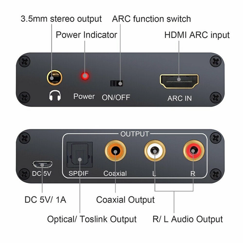 Product Description Features: Support SPDIF output. Supports coaxial output. Support RCA stereo output. Support 3.5mm stereo headphone port output. 3.5mm stereo headphone port equipped with high-performance audio amplifier. Support switch noise reduction funtion. Supports no signal automatic mute function. Support transmission 192KHz audio sampling rate. Optical Fiber Coaxial Interface Supports 5.1 Channel Transmission. Specifications: Condition: Brand New Shell material: aluminum alloy Power supply interface: Micro USB Maximum working current: 65mA Power adapter specifications: AC 100V-240V, DC 5V/1A Working environment temperature: -10~55℃ Storage temperature: -20~60℃ Working humidity: 10-90%RH (no condensation) Storage humidity: 5 - 95%RH (no condensation) Product size: 80*58*21mm/3.14*2.28*0.82'' Package includes: 1 x HDMI-compatible ARC Audio Adapter 1 x Micro USB Cable 1 x User Manual Shipping Returns Contact Us Payment 1. Items sent from US warehouse. 2. Receiving time = Processing time + Shipping time. 3. Processing Time: Around 1-2 business Days. 4. Shipping Time: 3-5 business day. It may have a little delay during some holiday (such as Christmas), any problem, please feel free to contact. Always believe we can figure things out with communication, if it comes to return, the pacakge must be intact and the same as you receive. If you have any questions, please feel free to email our service specialists 24 Hours a Day, 7 Days a Week. We will reply you ASAP. Return/refund is accepted within 30 days after the buyer receives the item. NO exchange will be accepted after 30 days from the date when the item is received. Please contact us first before returning your product!!! If you have any questions, our Customer Service staffs welcome you to email us. We strive to answer all questions and resolve any problems as quickly as possible. We care about our valued customers, and will always try to help you. So if you have any problems, You can contact us 7*24, we will reply at the first time. We accept all verified payments from ebay. Orders will be shipped after receiving cleared payment. Shipping 1. Items sent from US warehouse. 2. Receiving time = Processing time + Shipping time. 3. Processing Time: Around 1-2 business Days. 4. Shipping Time: 3-5 business day. It may have a little delay during some holiday (such as Christmas), any problem, please feel free to contact. Returns Always believe we can figure things out with communication, if it comes to return, the pacakge must be intact and the same as you receive. If you have any questions, please feel free to email our service specialists 24 Hours a Day, 7 Days a Week. We will reply you ASAP. Return/refund is accepted within 30 days after the buyer receives the item. NO exchange will be accepted after 30 days from the date when the item is received. Please contact us first before returning your product!!! Contact Us If you have any questions, our Customer Service staffs welcome you to email us. We strive to answer all questions and resolve any problems as quickly as possible. We care about our valued customers, and will always try to help you. So if you have any problems, You can contact us 7*24, we will reply at the first time. Payment We accept all verified payments from ebay. Orders will be shipped after receiving cleared payment. Bluetooth 5.4 Transmitter Receiver 2-in-1 Wireless Audio 3.5mm Jack Aux Adapter 16.99 USD 19.99 USD For Starlink Mini Antenna Magnetic Car Roof Mount Kit W/Rubber Coating Design 64.99 USD 19.99 USD DIY Fish Coral Silicone Fondant Mold Beach Sea Cake Chocolate Icing Mould Decor 10.69 USD 19.99 USD Power Wheel Adapter for Ryobi 18V Battery with 30A Fuse & Wire terminals&Switch 17.99 USD 19.99 USD 45Pcs Brass Wire Wheel Polishing Mix Brush Set for Dremel Rotary Tool Shank h 16.69 USD 19.99 USD 1/35 US M1A1/M1A2 TUSK Tank Metal Gun Barrel+Shells for Ryefield Model RM-5004 15.99 USD 19.99 USD 2* Rear Dog Bone For Wltoys 1/14 144001 1/12 124018 124019 124016 RC Car Parts 10.69 USD 19.99 USD Blue Upgrade Aluminum Gear Covers for Traxxas MAXX 4S Truck 1/10 89086-4 RC Car 23.79 USD 19.99 USD 20x Soft Golf Shoe Spikes Replacement Cleat Fast Twist Q-Lok For Footjoy Champ 12.99 USD 19.99 USD New TV Remote Control Controller For Bose Solo 5 TV Soundbar System 535 AUX1 18.99 USD 19.99 USD USB Programming Cable Cord w/ CD For Baofeng BF-UV9R/Plus BF-A58 BF-S58 BF-N9 A 12.99 USD 19.99 USD Radiation Dosimeter Detector Counter Geiger Electromagnetic Field Tester 22.99 USD 19.99 USD Black Silicone Protective Cover For DJI RC 2 Remote Controller Dustproof Case 11.59 USD 19.99 USD Atomization Rosin Pen Fast Heating Short Circuit Detection Assistant+5*Rosin 19.99 USD 19.99 USD Soft Genuine Leather Watch band For Fossil ES3077 Es2830 Es3262 Es3060 21cm 16.69 USD 5.99 USD New Replacement Programmer Programming Card Part For 1/10 RC Car Truck Accessory 14.99 USD 19.99 USD Brand New Wireless Guitar System Rechargeable Transmitter Receiver 8 Channels 27.99 USD 19.99 USD 4 in 1 USB-C Type-C to 4K HDMI VGA DVI Converter USB 3.0 Hub Adapter For Mac D 18.99 USD 19.99 USD Plunger Valve Assembly For Hitachi NR83A, NR83A2, NR83A2(S) Framing Nailers. 14.99 USD 19.99 USD RC Airplane Propeller Speed Test Tool RC Digital Led Tachometer With Battery F 22.99 USD 19.99 USD 4Pcs Bass Strings, Steel Bass Guitar Strings Four Color Bass Guitar Strings 14.69 USD 19.99 USD 15cm Microphone Mic for Kingston HyperX Cloud Flight/Flight S Gaming Headset 10.99 USD 19.99 USD 4-Slot Type-C LCD Display 21700 Battery Power Bank Case Charger Box DIY Kit i 13.69 USD 19.99 USD 90-120PSI Air Compressor Pressure Control Switch Valve Horn 1/8'' 12V/24V 13.99 USD 19.99 USD 8Pcs Audiocrast Gold Plated 2mm Pin Banana Plug HiFi Speaker Cable Connector New 10.99 USD 19.99 USD Rivet Marking Tool& Handle Model Building For Galaxy Tools Accessories Part 22.99 USD 5.99 USD Alloy 1/72 Scale WWII Germany Messerschmitt Bf-109F-4 Fighter Model Toy Decor 22.99 USD 19.99 USD ZK-MT2