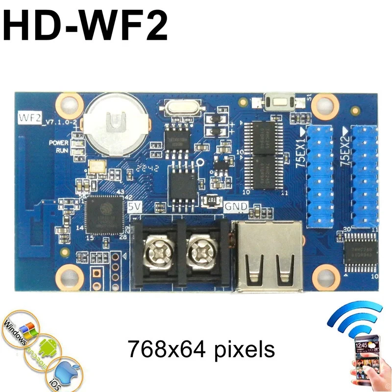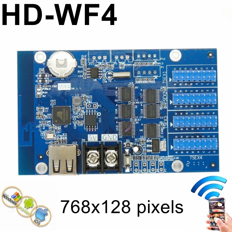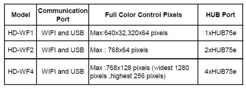 HD-WF1 HD-WF2 HD-WF4 LED display module controller specification: Model No.: HD-WF1 , HD-WF2 , HD-WF4 Wifi connection password : 88888888 Users can search and download the APP ”LedArt” from Android APP market or APP Store, or user can scan the QR code below to download the app. It is mainly used for showing RGB Seven color Text. If you want to show videos, please choose HD-D16, HD-C16, HD-C36..etc. (it can be used for HUB75,HUB75B ,HUB75E port full color led display modules) Scanning way: Support static to 1/32S Communication Port: Wifi , U-disk It supports WiFi and USB flash disk updates. ( USB port , for updating program by U-disk) Extension function : HD-WF1,HD-WF2 can't Support temperature, humidity, brightness, remote control HD-WF4 can Support temperature, humidity, brightness, remote control Support RGB: Full-color module can display red, green, blue, yellow,Purple, green, white JPG,BMP,GIF support FLASH Capacity: 4M Byte (HD-WF1); 8M Byte (HD-WF2,HD-WF4) Program Quantity: 999 programs, support switch the program by wifi remote Regions: Max 20 regions,support regions overlap Display Showing: Text、Animated word、3D Word、Image & Text(Picture, SWF), Excel, Time, Temperature, Timing, Count, Lunar calendar Dimming: Support brightness setting, time period brightness setting Multi-Languages support Voltage: 4.2-5.5V, temperature: - 40℃~ 80℃, consumption <0.5w