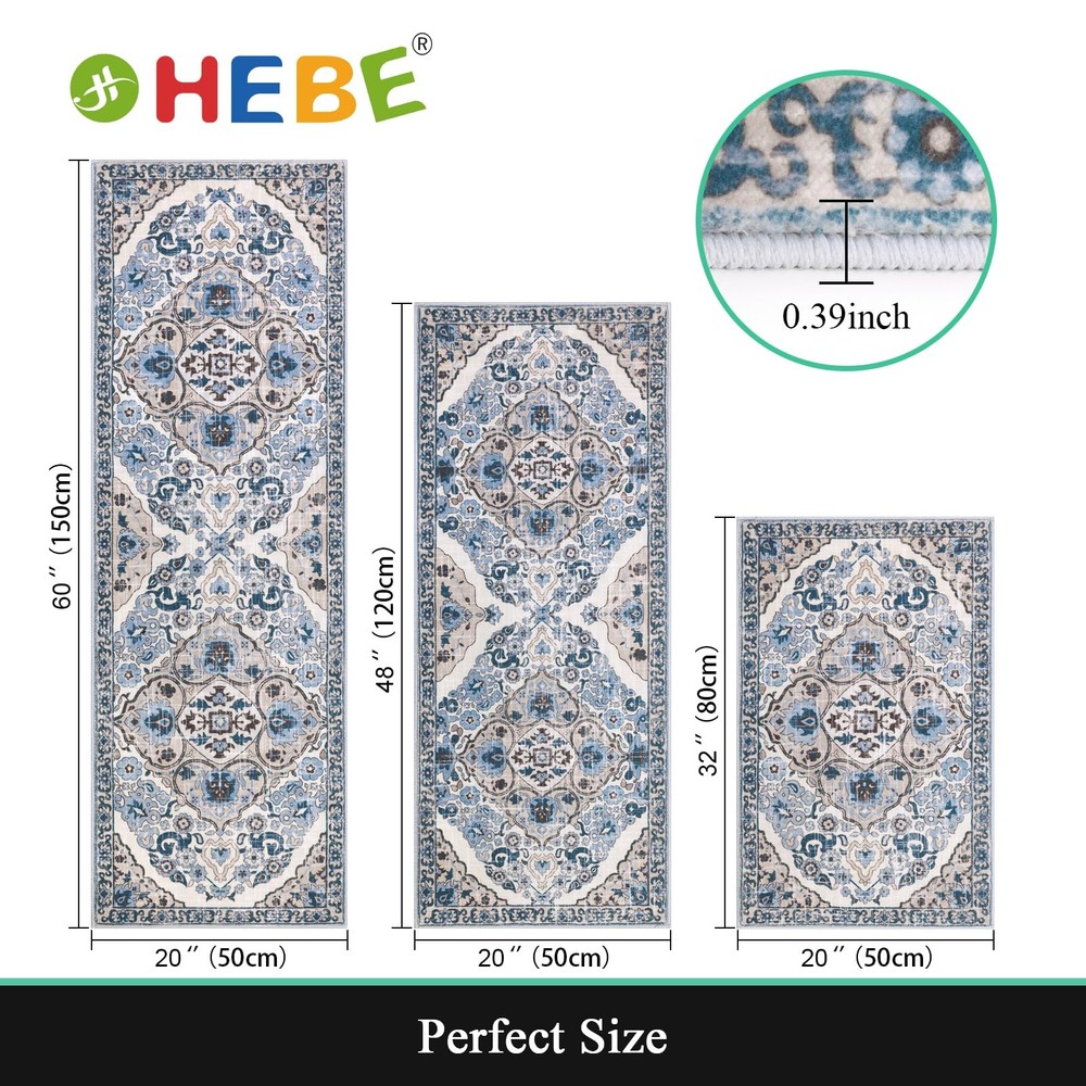 HEBE Vintage Kitchen Rug Set of 3 Pieces Non Slip Machine Washable Kitchen Rugs and Mats Set If you are looking for a super fashion, machine washable, anti skid rubber backing and durable kitchen floor mat set, this kitchen mats for floor 3 piece is your best choice! Product Description: This anti slip kitchen mat set is perfect for indoor and outdoor use, especially in kitchen sink, in front of door, doormat, entryway, living room, or bedroom.The package includes set of 3 mats rugs runner . It’s a perfect kitchen mats sets for kitchen, laundry room, entrance doormats rug,wash room floor mat,bathroom rug, indoor/outdoor door mats, bedroom, living room, dining room, porch, stairs, balcony, kids room or any other place you want. Soft & durable:This durable kitchen floor mats and rugs is no color fade and no pattern deform. The classic pattern of boho dds a warm element to home decor and brings more blessings to family and friends, they will very happpy if you gave them the kitchen rugs sets as a Christmas gift! Product Specification: Shape: Rectangle Style:Boho Kitchen floor mats set of 2 Size: 20"x32"+20"x48"+20"x59"; Package includes: 1 x kitchen floor mats with runner set of 3 Farmhouse Kitchen Rugs Sets 3 Piece with Runner: HEBE boho kitchen rugs set include 3 piece kitchen mats for floor, which measures 20"x32"+20"x48"+20"x59",perfect size for your kitchen floor, also suitable as entryway rug, laundry room rug, bathroom mat Non Slip Kitchen Rug and Mat Sets: Boho kitchen floor mat set is made of 0.39" high-quality polyester and come with premium TPR & cotton non skid backing,can be effective to avoid slipping and scratching the floor, keep your home clean and dry Washable Kitchen Rugs Set: Our washable rug can be routinely cleaned with a regular vacuum cleaner or machine washable for a deep clean.The farmhouse area rugs for kitchen has been tested for many machine washes, will not fade, will not deform Durable kitchen Rugs and Runners: Our kitchen area rug is made of premium polyester fabric, which is very durable. Design with retro floral elements,Classic printing and dyeing process, non-fading and non-shrink, protect your kitchen floor dry and clean Widely Used Boho Kitchen Carpet: The kitchen mat widely used as kitchen sink rug, laundry room rug runner, indoor door mat and bathroom rugs; also can be great gift for your families and friends in Christmas, Thanksgiving, Halloween and New Years