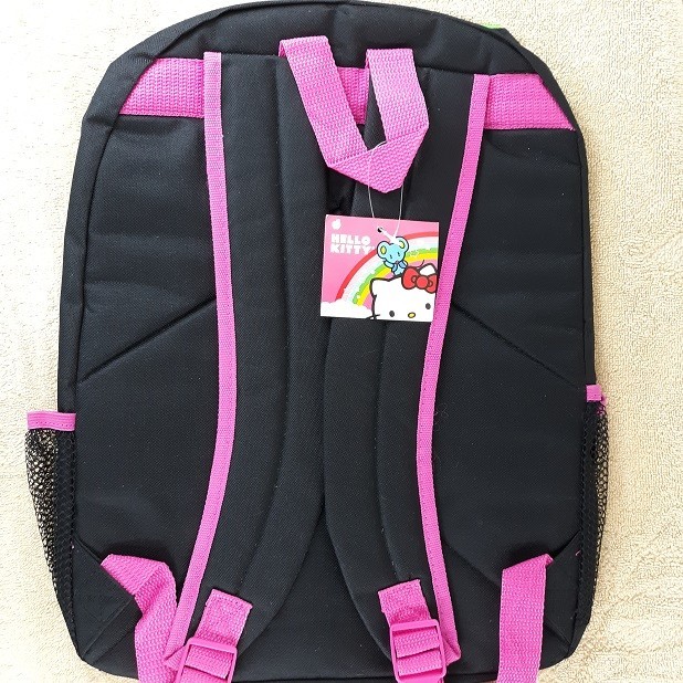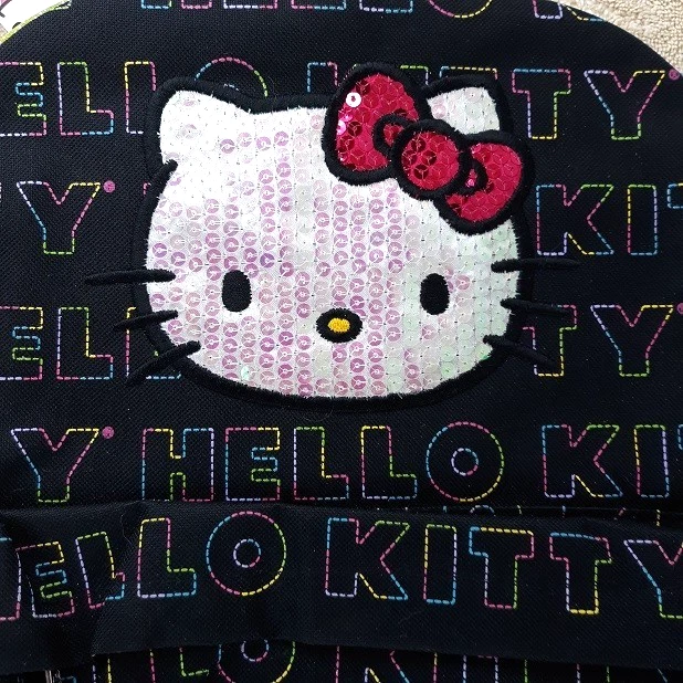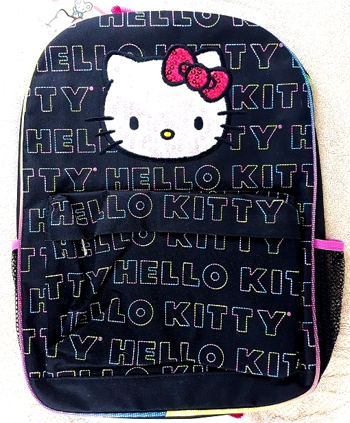 NEW WITH TAGS FULL SIZE HELLO KITTY BACKPACK. PHOTO DO NOT DO JUSTICE TO THIS BACKPACK. HELLO KITTY'S FACE IS MADE OF SEQUINS. ONE LARGE ZIPPERED COMPARTMENT AND ONE MEDIUM ZIPPERED COMPARTMENT ON THE FRONT. MADE OF CANVAS WITH ONE MESH POCKET ON EACH SIDE. BACKPACK IS APPROXIMATELY 16" x 12" x 4". IN THE THIRD PHOTO, I TRIED TO CAPTURE THE DIFFERENT COLORS OF THE WRITING OF HELLO KITTY. THE COLORS OF THE LETTERING ARE DIFFERENT BRIGHT COLORS. BUY IT NOW Check my auctions for more backpacks and lunchboxes. Shipping is $11.90 for ground advantage or $13.90 for priority for the USA. From a smoke free home. Ask questions before buying. Buyer is responsible for all taxes. International: Item may be purchased using eBay International Shipping.