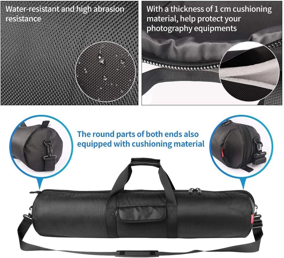 HEMMOTOP Tripod Case, 31.5x7x7 in Heavy Duty Tripod Bag with Shoulder Straps and Handles, All Sides 1 cm Thick Padded Carrying Case with Two Zippered Pockets for Speaker Stand, Monopod - R08018 Black Item Description Compatible Equipment: HEMMOTOP 80 cm tripod bag is compatible with tripods up to storage length of 31 inches. Size: Length 31.5 in (80 cm) x diameter 7 in (18 cm) Thick Protective Cushioning: All sides of the tripod case are equipped with a thickness of 1 cm cushioning material to your equipment from damage. It is easy to transport your travel camping pole, camera tripod, fishing rod, mic stand, tent pole and more Durable Nylon Material: Tripod carrying case is made of heavy-duty and durable nylon material, which can carry heavy equipment safely. Water-resistant materials protect your equipment from unexpected weather Reliable Zipper and Sewing: With SBS zippers larger than usual zippers, make it quickly and smoothly to get your tripod inside and out. With reliable sewing, even heavy equipment can be transported safely Convenient Carrying: Hand-held and shoulder-back two options. Allows you to pack up your light stand and tripods anytime, anywhere. Please note: The tripod bag will be folded before delivery so there will be some creases Wide Application: Tripod carrying case is suitable for mic stands, tent poles, microphone stands, boom stands, guitar stand, photo backdrop stands, led lighting stands, telescope, telescoping awning poles, lighting gear or camera equipment and more › See more product details *Hemmotop tripod case has and internal pocket with zipper and likewise on the outside (which is larger), which is convenient for storing tools, a release, spare parts and small items or extra gear. *Adopting SBS zippers larger than usual zippers, make it quickly and smoothly to get your tripod inside and out. *One side of the tripod case is made of zipper wrapped, so that it is convenient to store and remove. The other side is a closed design, which can better protect the pan head of the tripod. *Double zipper, opening and closing is faster and more convenient. *Not only the main body, but also the round parts at both ends have a thickness of 1 cm cushioning material, help protecting your important equipment . *Suitable for carrying and storing camera and video tripods, musical instruments, music stands, microphone stands, fishing rods, light stands, cosplay accessories, and more. *The ties inside secure your equipment together so they don’t rattle around and damage anything. *Made of heavy-duty and durable nylon material, which can carry heavy equipment strongly. Water-resistant materials protect your equipment from unexpected weather. *With reliable sewing, even heavy equipment can be transported safely. Hemmotop tripod case is well-padded, and suitable for carrying or storing Telescope, Telescoping awning poles, Lighting gear, Professional Tripod and Monopod, Microphone Stand, Speaker Stand, Boom stand,Guitar stand, Photo Backdrop Stand, LED Lighting Stands or Camera Equipment etc. - The interior tie downs to help keep things from shifting Payment We accept payment only through PAYPAL Shipping We ship products worldwide through standard express courier service, it will reach within 7 to 10 days to abroad buyers, we ship the product after recieved clear payment and give full information about shipment to the buyer Return We accept product return within 7 to 21 days from delivery date but product should be in original position and not in damaged condition,the return shipping charges will be buyer responsibility