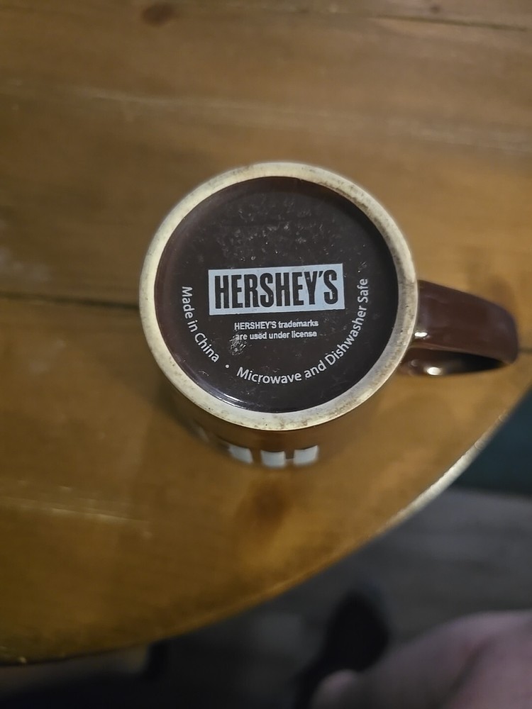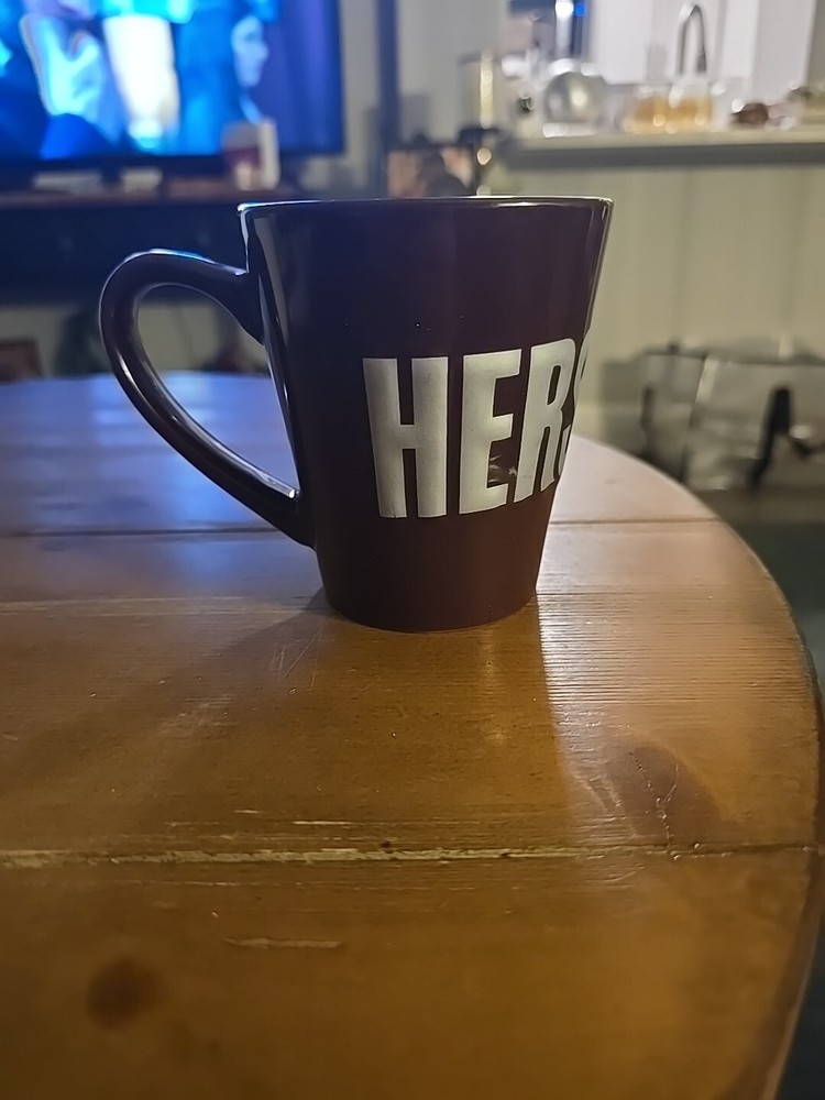 The product is a brown tapered HERSHEY'S coffee cup, suitable for hot beverages like cocoa and hot chocolate. It includes a coffee cup featuring the Hershey brand logo. This mug is not handmade and has not been modified from its original design.