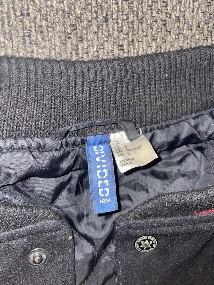 H&M MEN'S BLACK/BURGUNDY VARSITY DIVIDED WOOL BLEND POLYESTER JACKET SIZE XLARGE. Condition is Pre-owned. Shipped with USPS Ground Advantage.