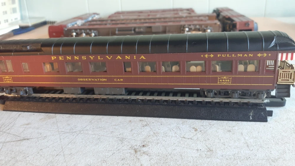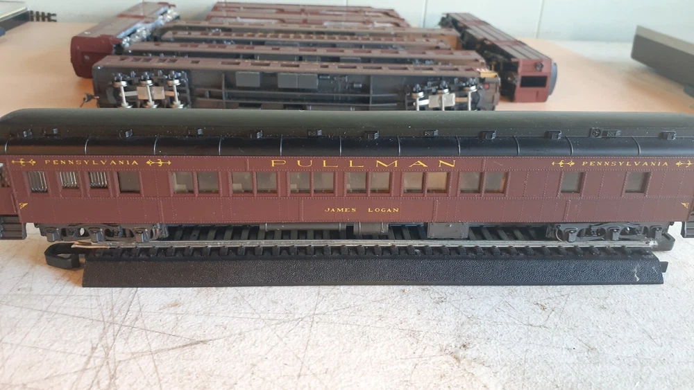 LOT OF HO SCALE PENN LOCOMOTIVES AND PASSENGER CARS CONSISTS OF THE FOLLOWING: 1.. Athearn #3304 HO Scale - PRR PA-1 Powered Diesel #5750 & 5750 MATCHING DUMMY & 5750 UNIT B Unit Unpowered.. locomotive runs smooth and lights, needs a back coupler -- the matching dummy is good, unit B needs one coupler. all knuckle couplers. 2.. 6 car Rivarossi set is illuminated- all steel wheels and knuckle couplers: mail car 6529 james logan passenger car observation car 4496 dining car 1104 passenger car 3940 mountain view pullman 3.. indian point baggage car- not illuminated- brand unknown- steel wheels- knuckle couplers all in very good condition see pictures.