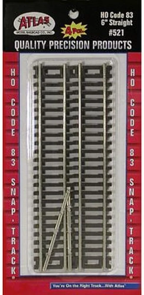 HO Code 83 6" Straight (4) Sectional Track - Code 83 For use with your scale model railroad Atlas Code 83 line is fine quality, prototypical track for the modeler who is looking for track that is more exact-to-scale than Code 100. Atlas Code 83 track has fine brown ties and nickel silver rail. 4 Pieces. 4.0 inches x 8.5 inches x 0.39 inches. Weight: 1.6 oz Item model number 521 Product Dimensions 8.5 x 4 x 0.39 inches Item Weight 1.6 ounces Manufacturer recommended age 14 years and up Is Discontinued By Manufacturer No Manufacturer Model Railroad