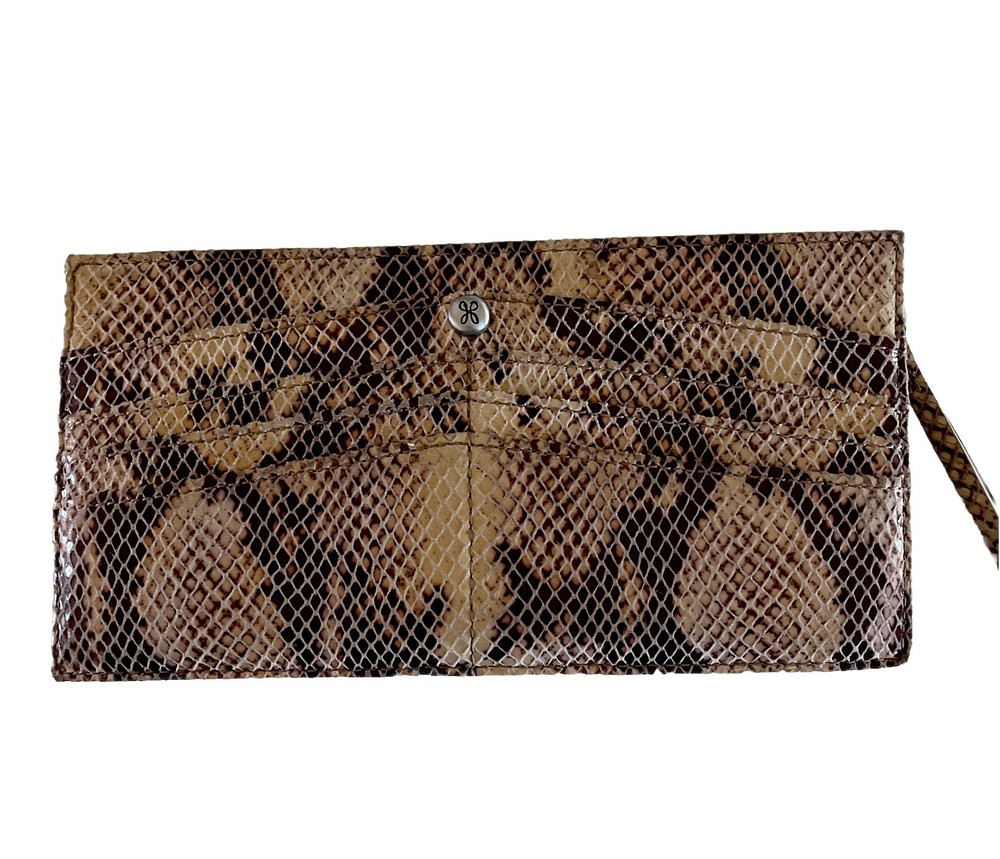 This sleek and stylish wallet from Hobo International is the perfect accessory for any woman. With its sand snake color and envelope style, it is both fashionable and functional. The wallet features a clear ID window, zip change pocket, credit card slots, and a currency/receipt pocket, making it perfect for storing all your essentials. This wallet is preowned and is in good condition.