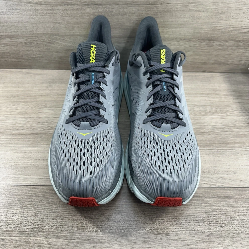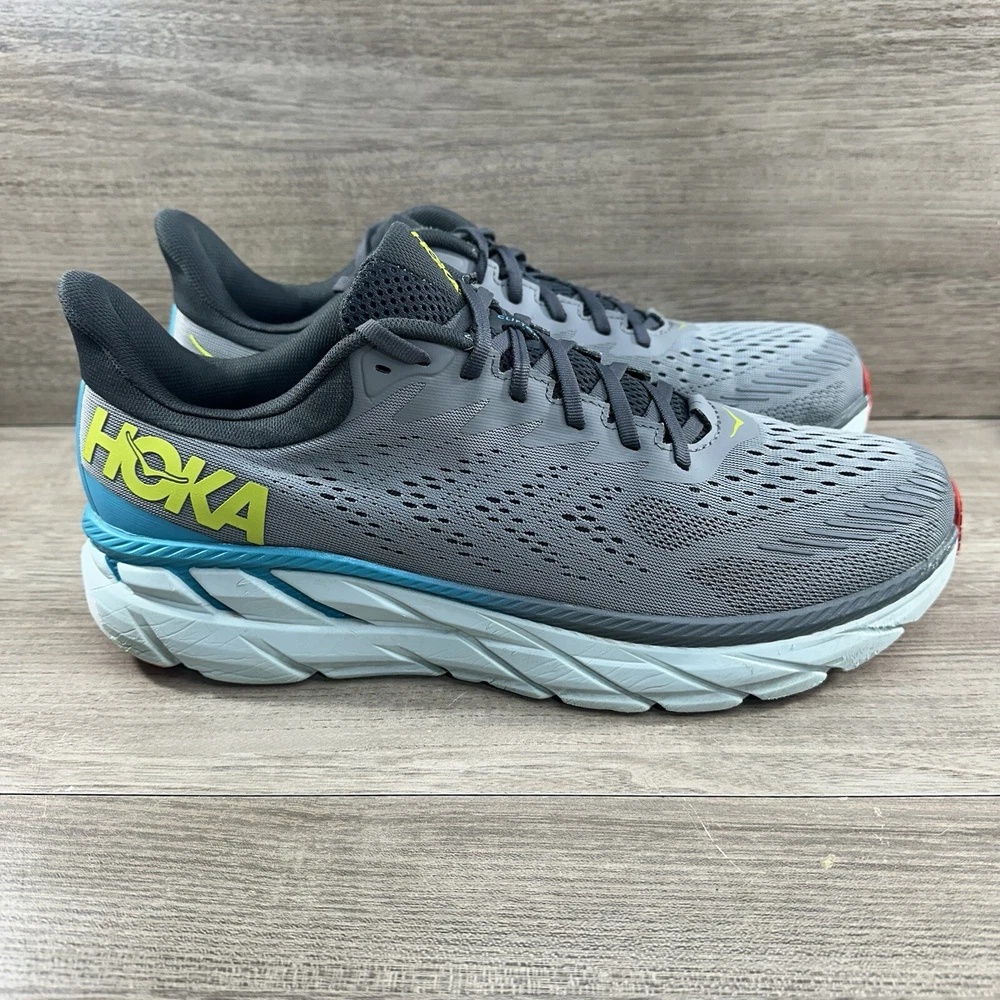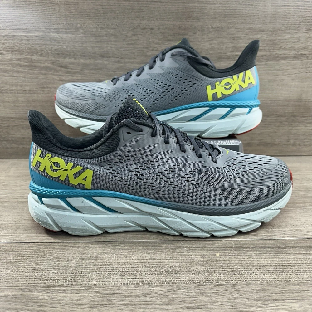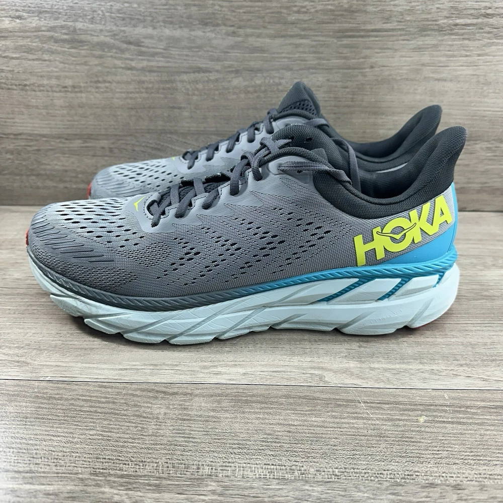 Elevate your running experience with these Hoka One One Clifton 7 sneakers in a stylish gray and blue colorway. Designed for both performance and comfort, these shoes feature a cushioned, lightweight, and breathable design with a rubber outsole for optimal traction. The synthetic upper material is paired with a foam insole for added support and stability during any activity, whether it be running, cross-training, or gym workouts. With a lace-up closure and low-top shoe shaft style, these shoes are perfect for any occasion, whether you're hitting the activewear or casual wear category. The Hoka One One Clifton 7 sneakers are a classic addition to any sports-themed wardrobe and are sure to make a statement with their colorful and wolf-inspired design.