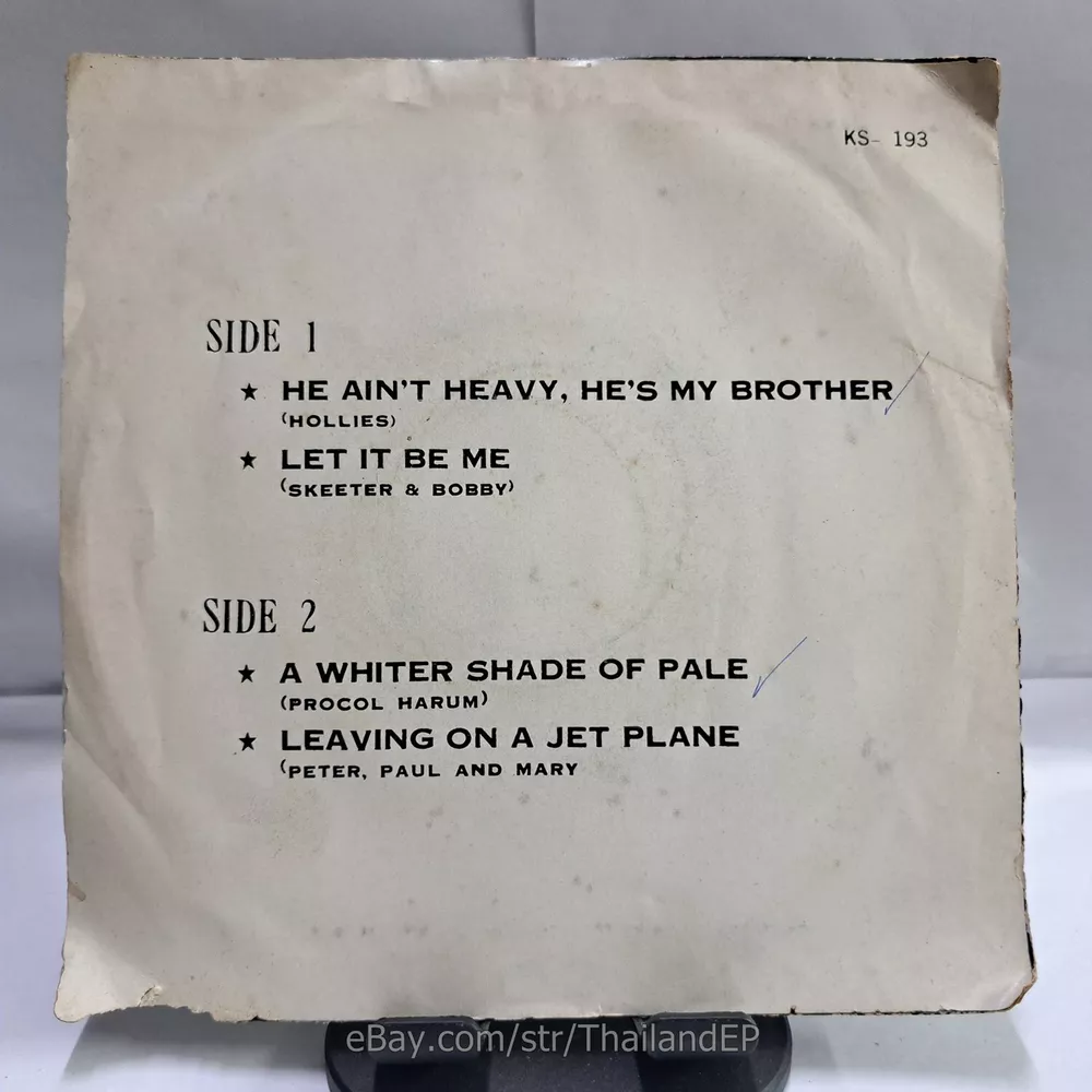Welcome to The World of ""Thailand Vinyl Records"".Very rare and beutiful picture of cover. Check everyday . This item is for a true 7" single collector. It was printed and sold locally as limited EP back in the early 70's. Only few copies were spread outside Thailand. Most professional record collectors know that it is scarce nowadays and is absolutely a collector's item. If you know a UK magazine called RECORD COLLECTOR then you must have read many articles mentioning THAILAND EP and this is it !!! Here is your chance to own one-of-a-kind piece of Asian's 7" single history. Description Records !!! DETAIL SONG and ARTIST !!! Side A: A1 = Hollies - He Ain't Heavy, He's My Brother / A2 = Skeeter & Bobby - Let It Be Me Side B: B1 = Procol Harum - A Whiter Shade Of Pale / B2 = Peter, Paul And Mary - Leaving On A Jet Plane Label&Catalogue number : : KS193 Country of release : THAILAND Condition (Sleeve/Disc) : VG / EX and pls see picture too. Shipping I am seller in Thailand not USA.So I can not ship 4$ as policy pls understand this real rate from oversea . Price for shipping(Airmail )&Packaging to worldwide only US 14.99 USD .Except Asia and JAPAN only 14.99 USD. You can save cost for combine shipping only 3 USD$ per each. 2xEP=17.99 USD$ , 3xEP=20.99 USD$ . My package very safety by big cardboard don't worry about your's EP/PS/LP. Time delivered 21-45 days . ***All item : have tracking system no need add money*** **For normal shipping (Airmail).Time delivery to ITALY maybe use 1-2 Months, France use 1-2 Months.But Don't worry item will arrived to you sure!!.For fastest and High value you can use Express Mail Service cost for1 EP =39 USD.EP will arrived to you within 5-7 Days. ***All shipment have fully tracking system *** Payment PAYMENT : I accept the follow payment by eBay managed , . My ID eBay provide by eBay .Account will be provide at the end auction.Charges to be covered by winner. If you have question pls email to me anytime i can answer immediatly. I have many EP,PS 7" Thailand Pls Click => View seller's other items Check my feedback , I care and honest all customer.I welcome 0 feedback but contact me first if you will bidding. Good Luck !!!! and Enjoy . 45 RPM / EP/ LP Grading Scale: Mint /NM/ Excellent(VG++) /VG+/ VG /G+ /Good(G) / Fair / Poor / Bad (According Record Collector Magazine (UK)) LOT162-18KS193